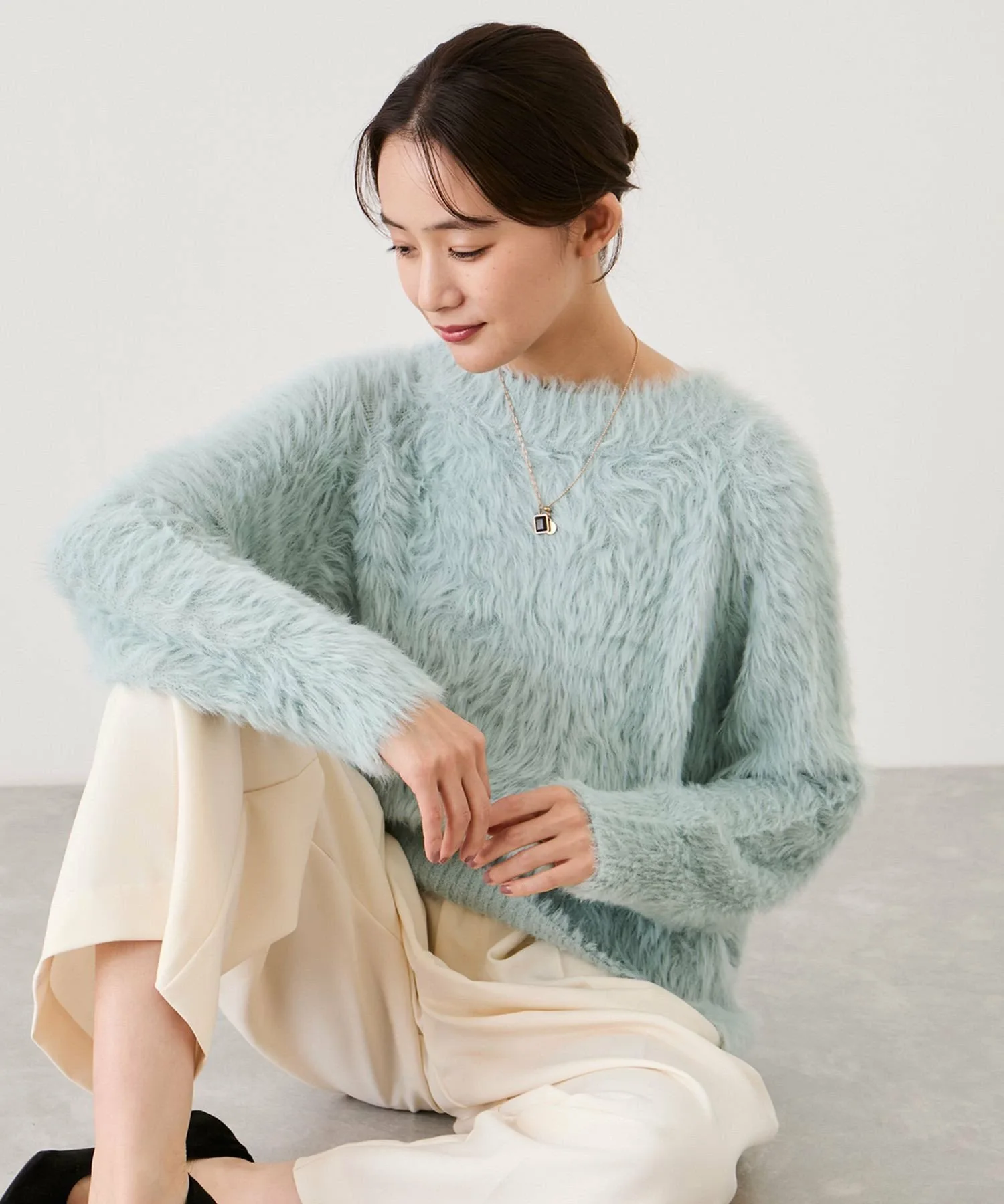 - Вязаный пуловер из длинноворсовой ворсистой пряжи.