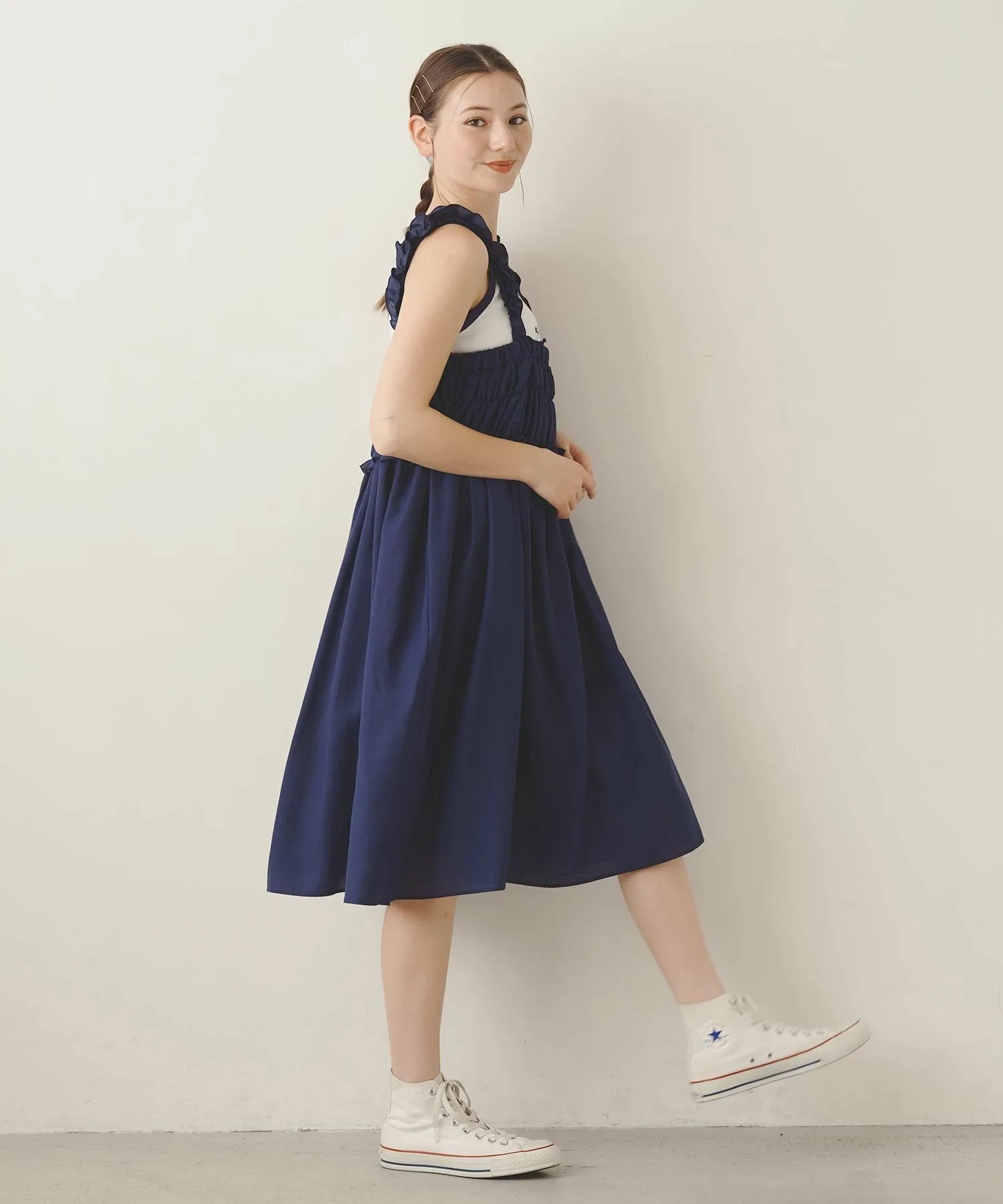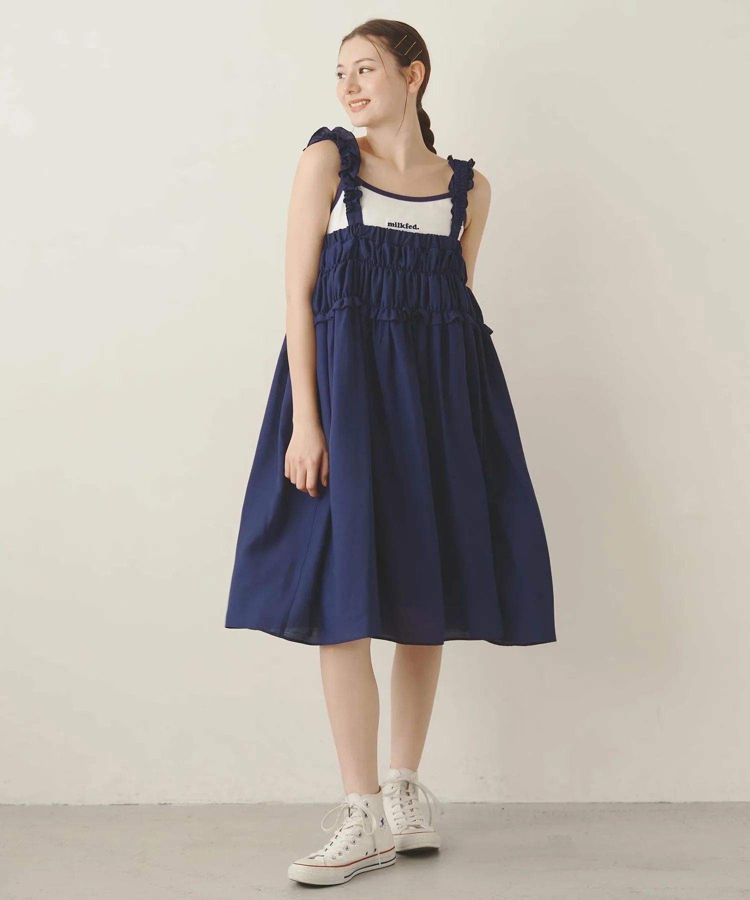 Сочетайте его с футболкой или майкой под низ для сбалансированного, собранного образа, который будет выглядеть аккуратно и опрятно.○Рекомендуем серебряные аксессуары! Поскольку платье объемное, остальная часть наряда будет простой и лаконичной, что сделает его еще более стильным.