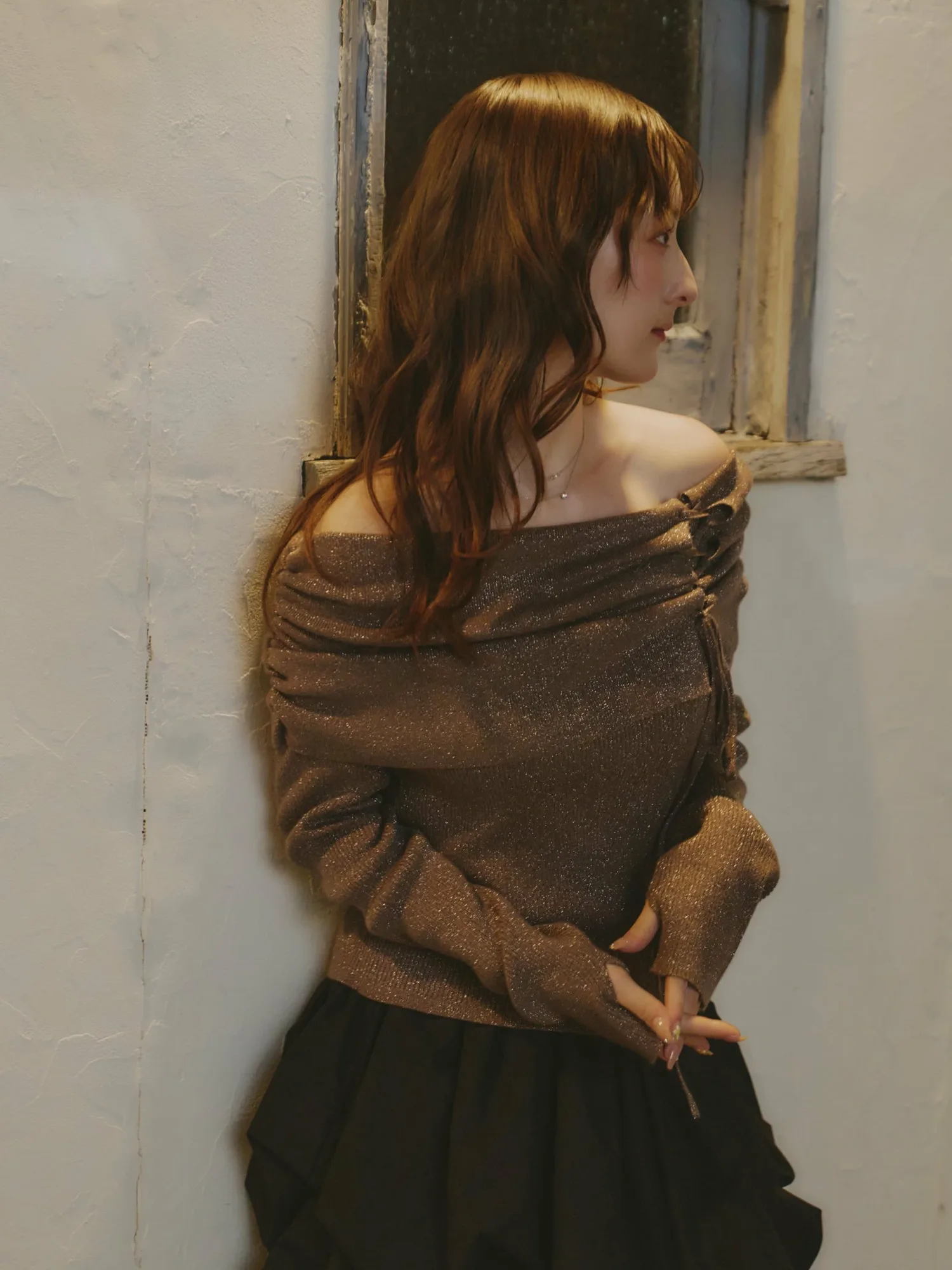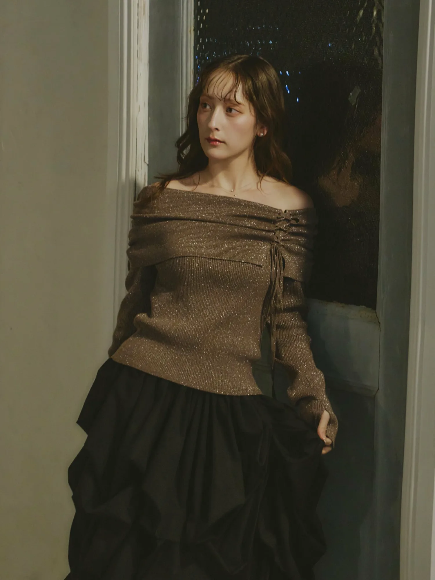 Трикотажное платье с открытыми плечами и лентами, украшенное блестками, отлично смотрится в праздничные дни
