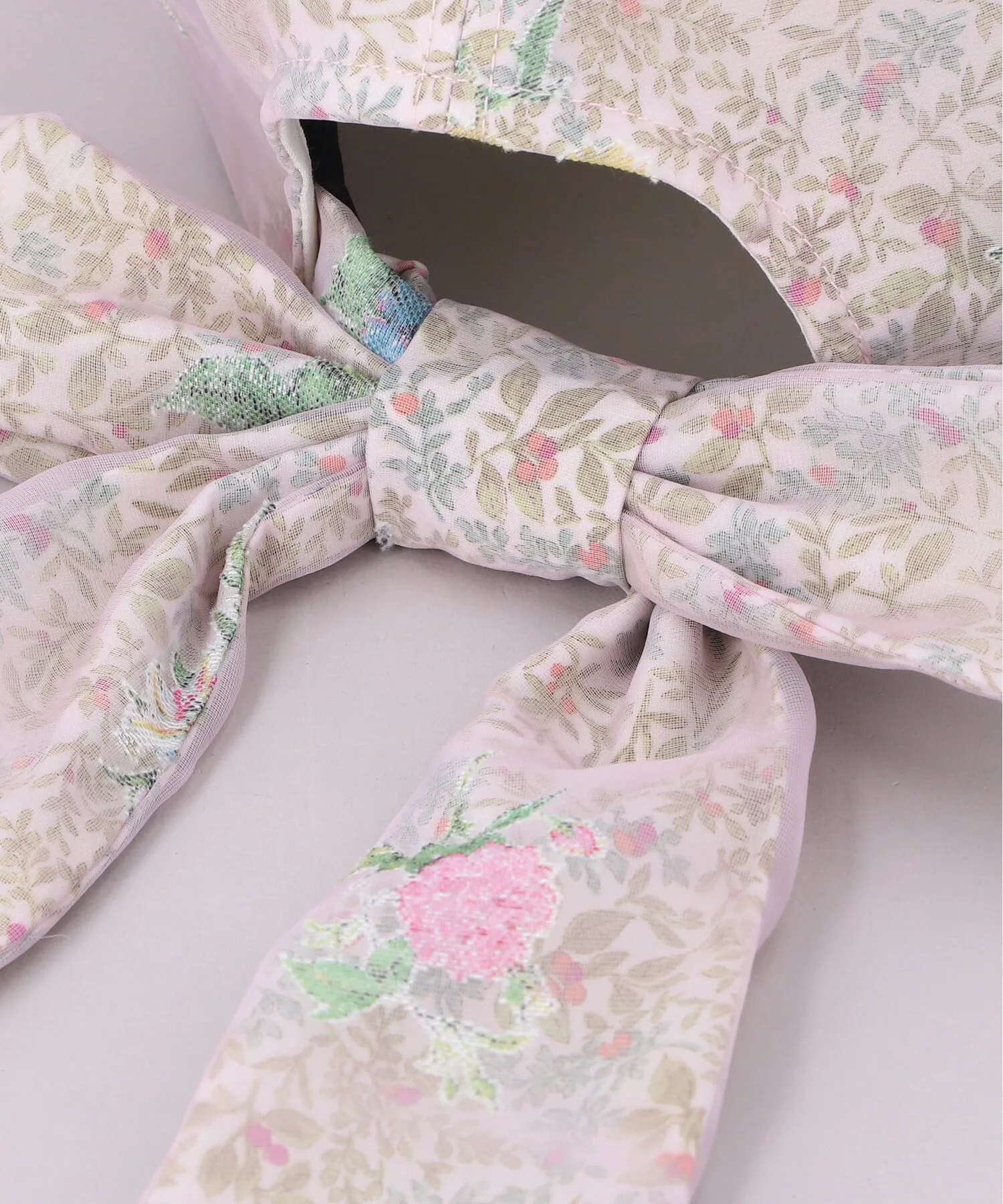 Органза наложена поверх хлопчатобумажной ткани с мелким цветочным узором, создавая легкий, весенний дизайн. Декоративные элементы по бокам добавляют акцент.