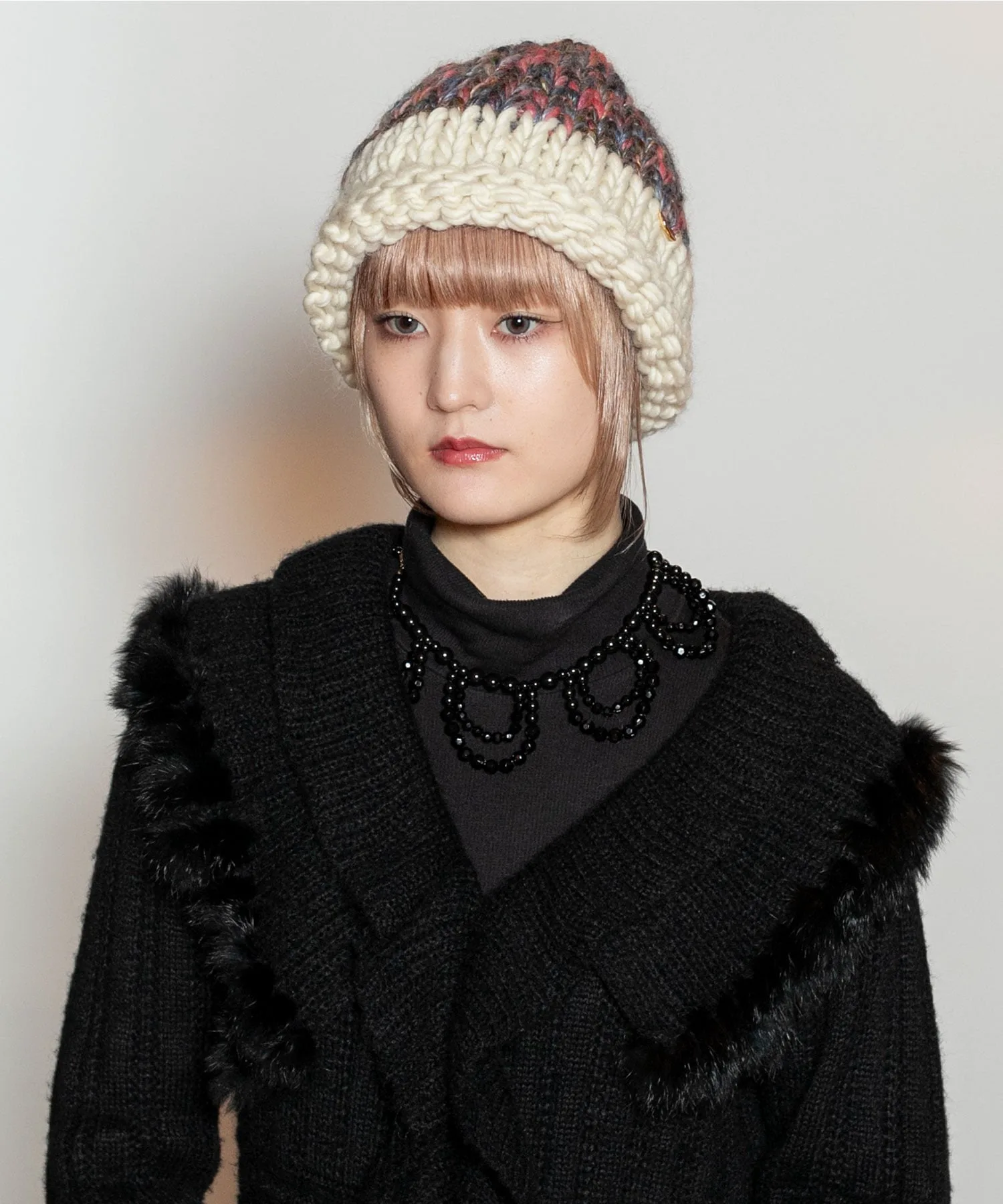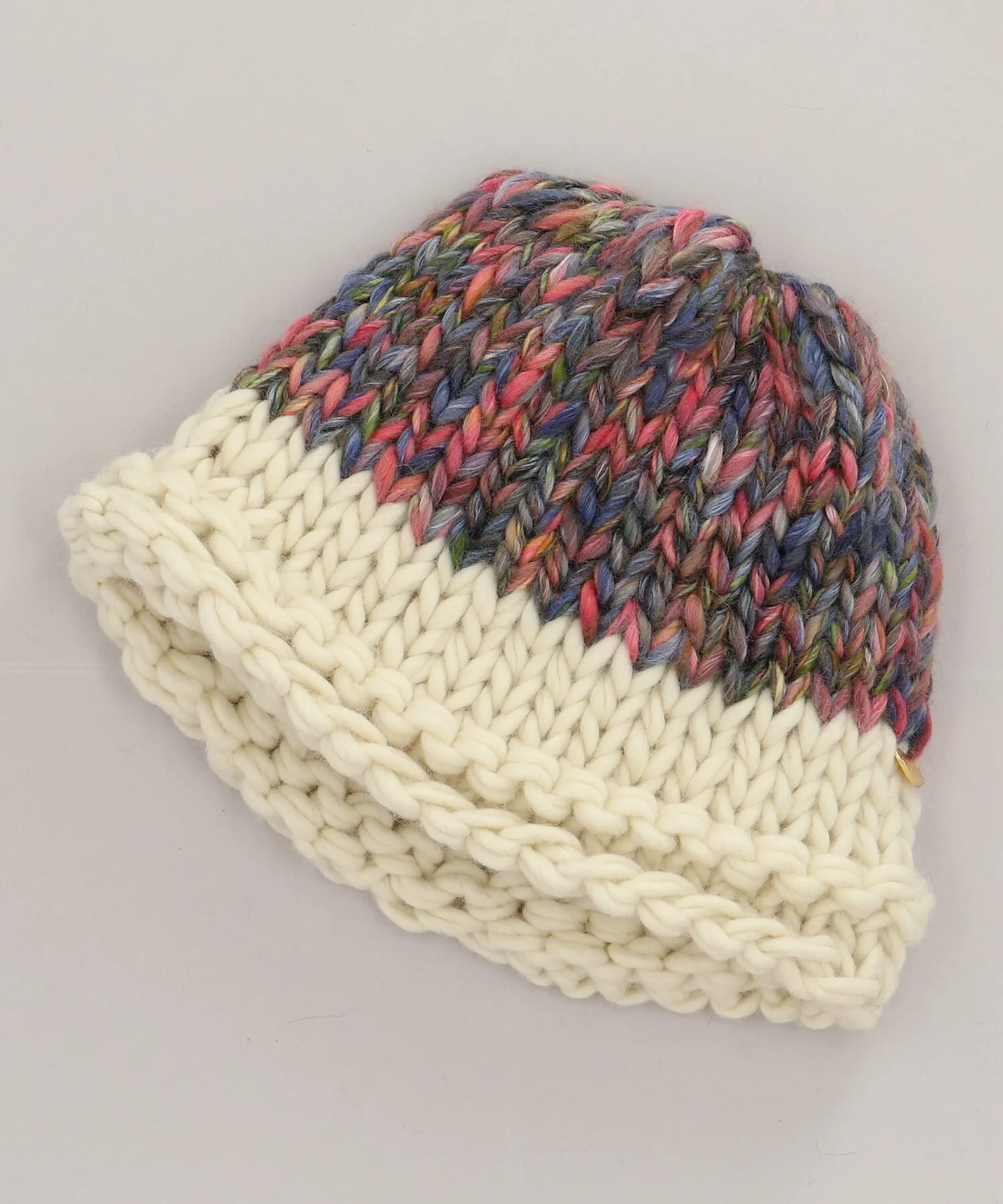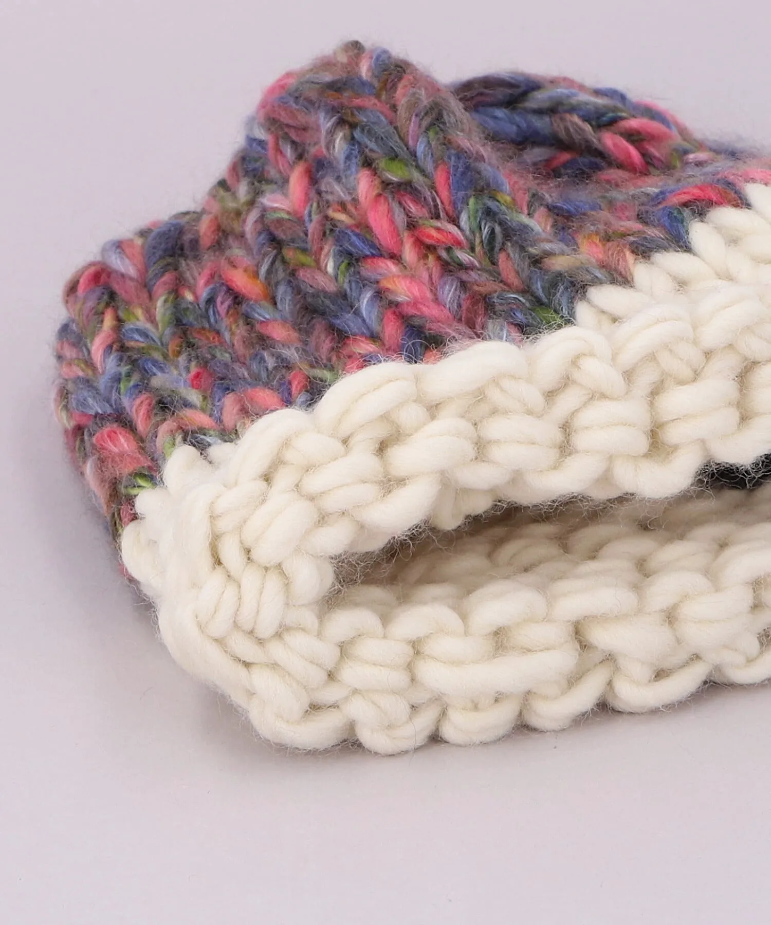 Щедрое использование разноцветной пряжи создает дизайн, который добавляет элегантности головному убору. Отверстие однотонное и контрастное, что добавляет акцент.