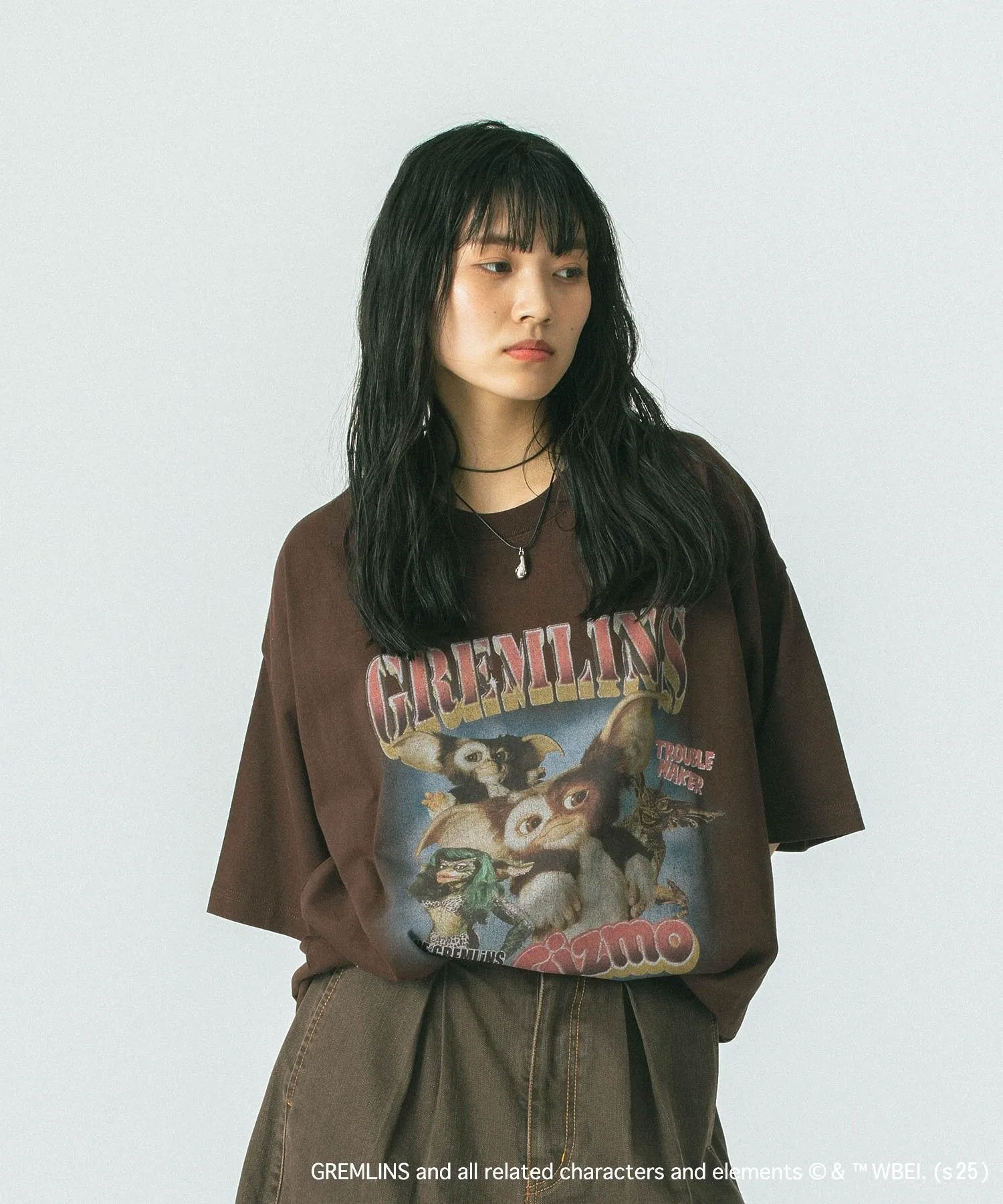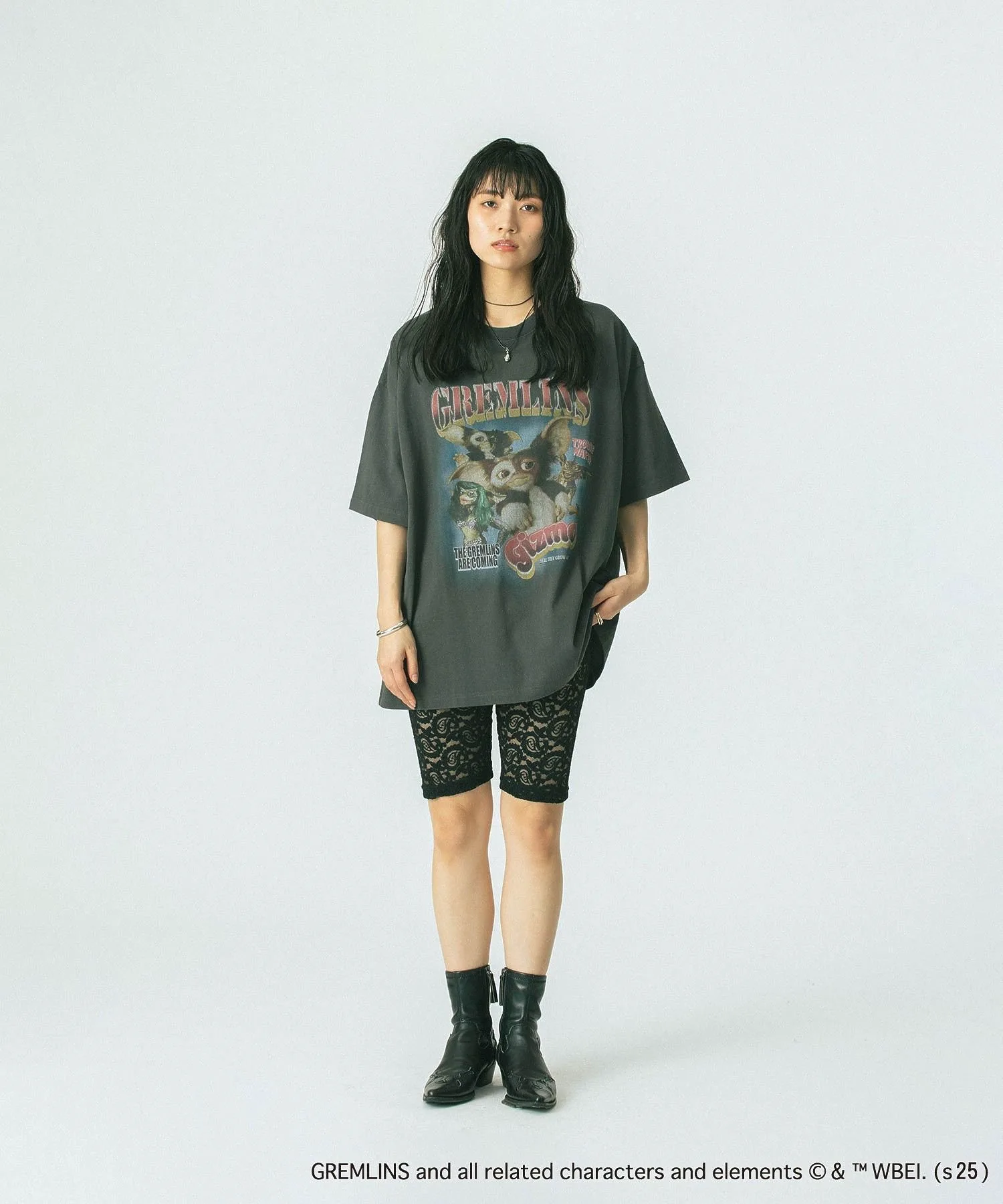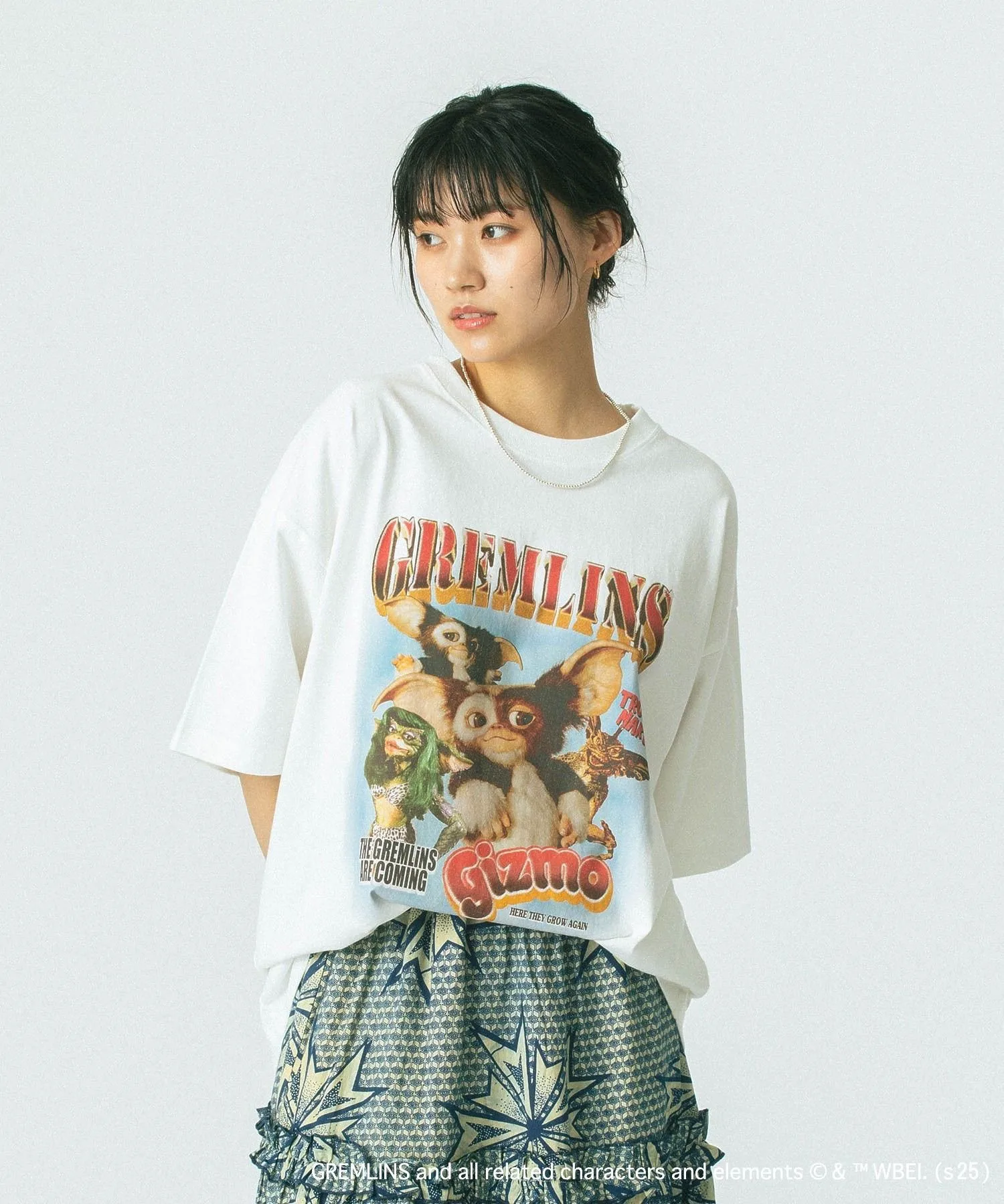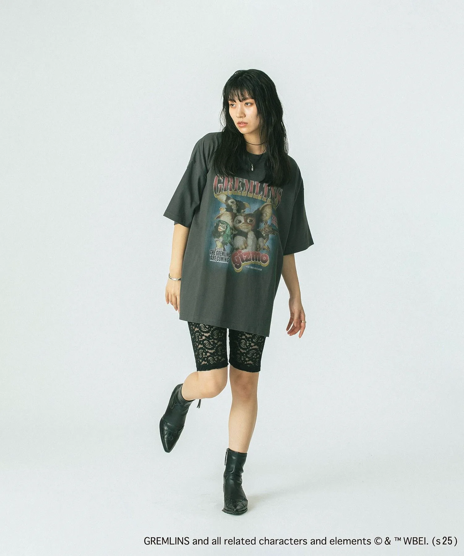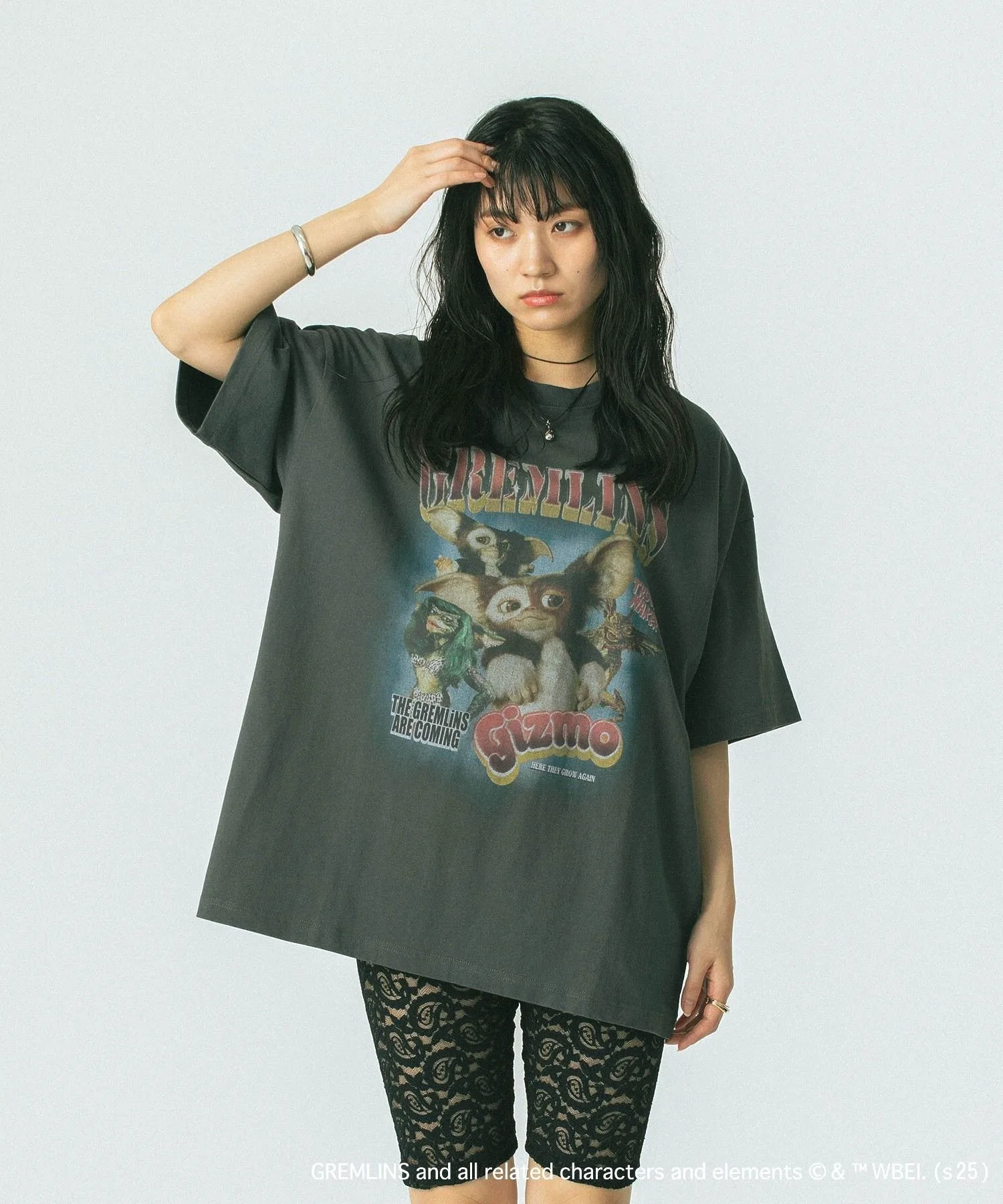 Смелый принт гремлина добавляет акцент, создавая эффектный образ.