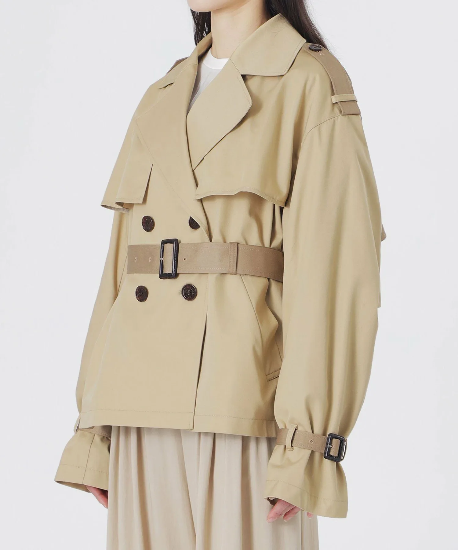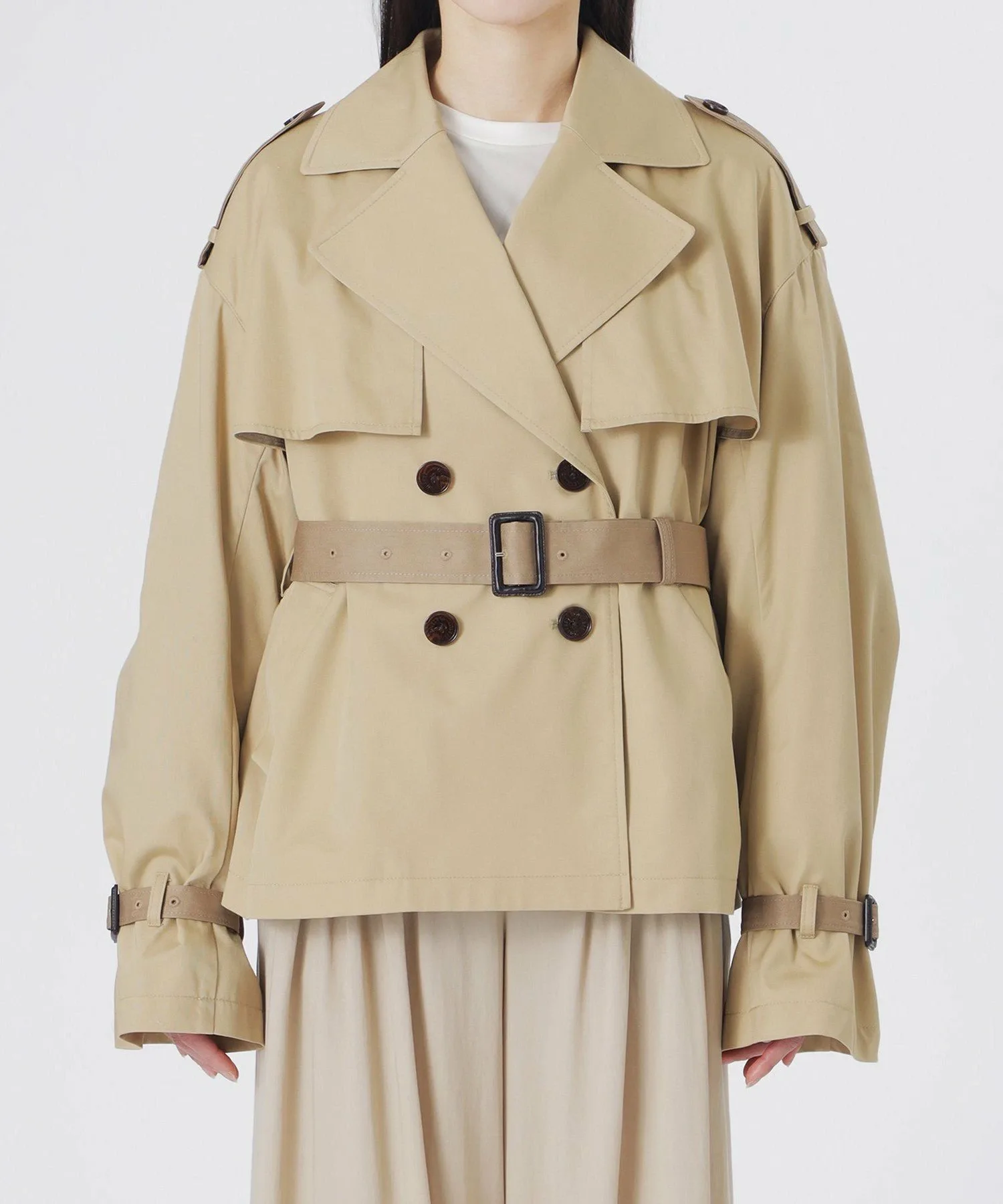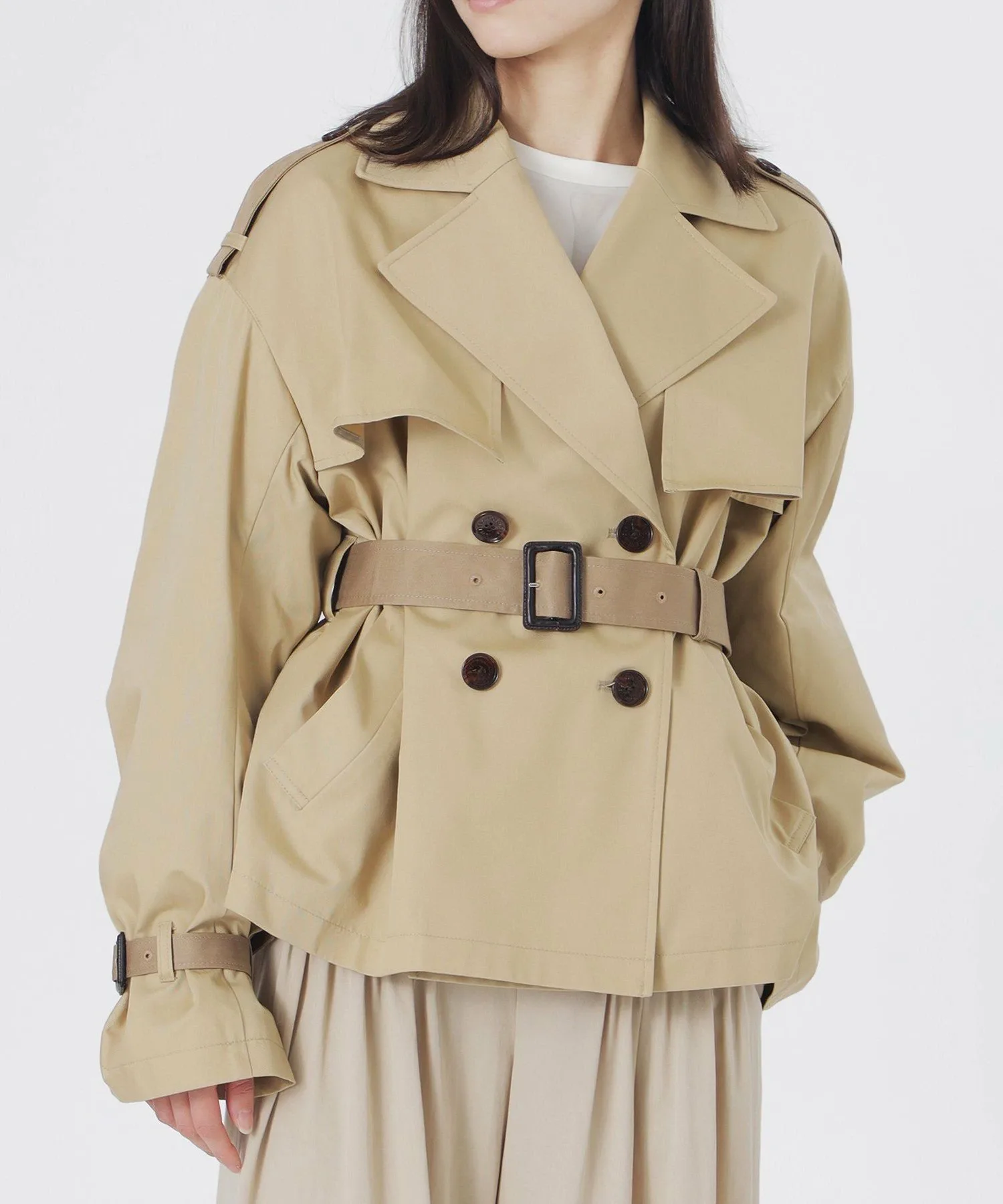 Короткий тренч свободного кроя в бежевых тонах.