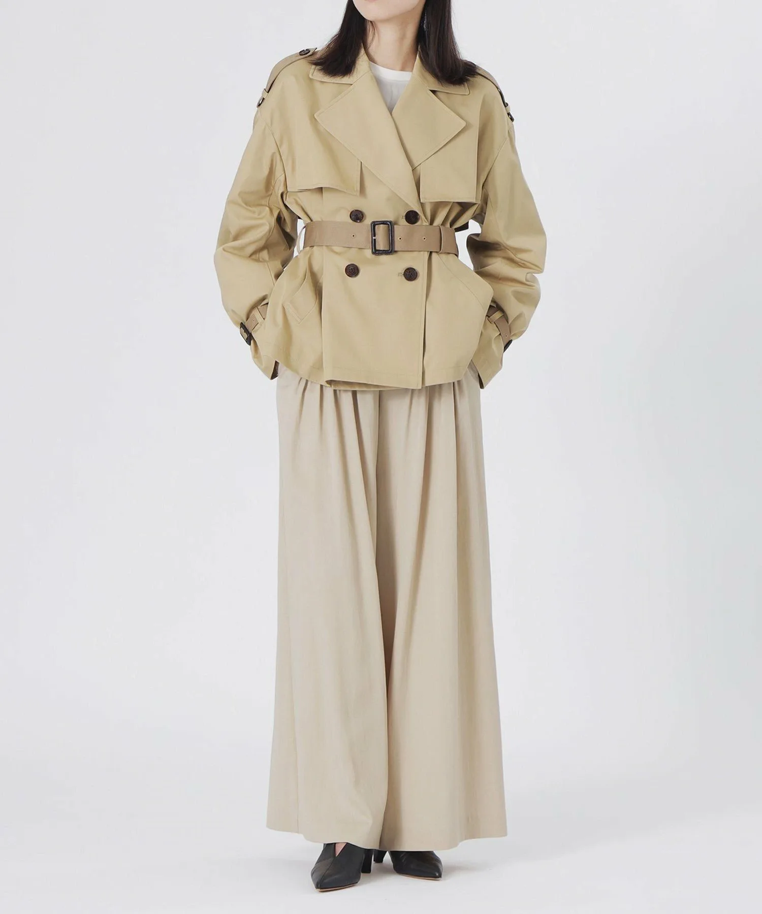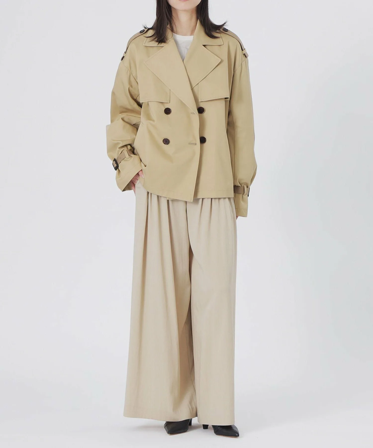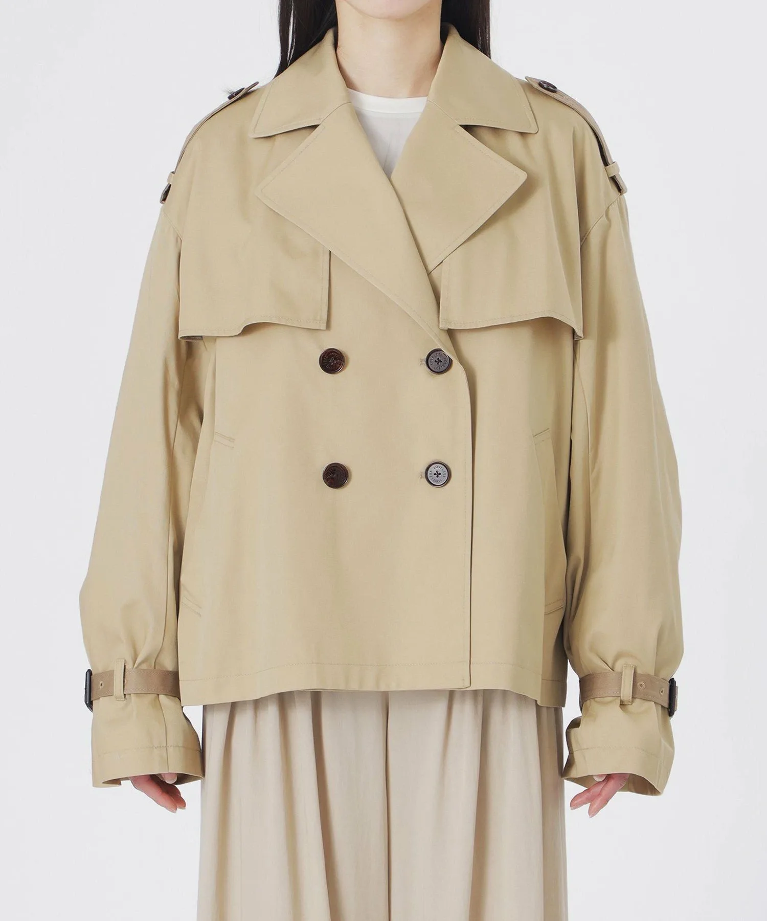 Короткий тренч свободного кроя в бежевых тонах.