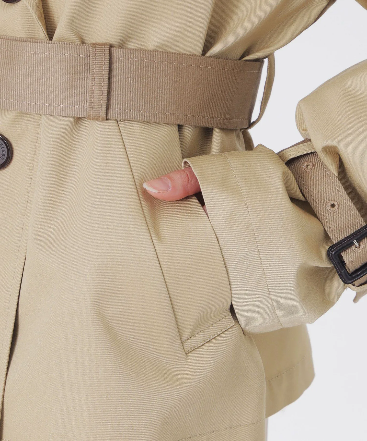 Спокойный бежевый тон делает этот тренч универсальным, подходящим как для работы, так и для повседневной носки. Играйте.