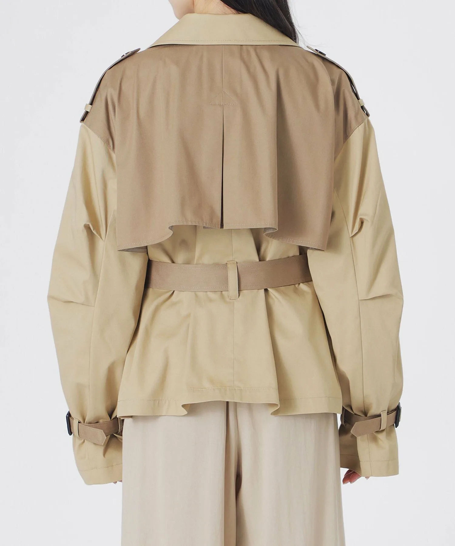 Кокетка на спине, погоны, пояс на талии и ремень на рукавах выполнены из того же темного материала, что придает образу более изысканный вид.