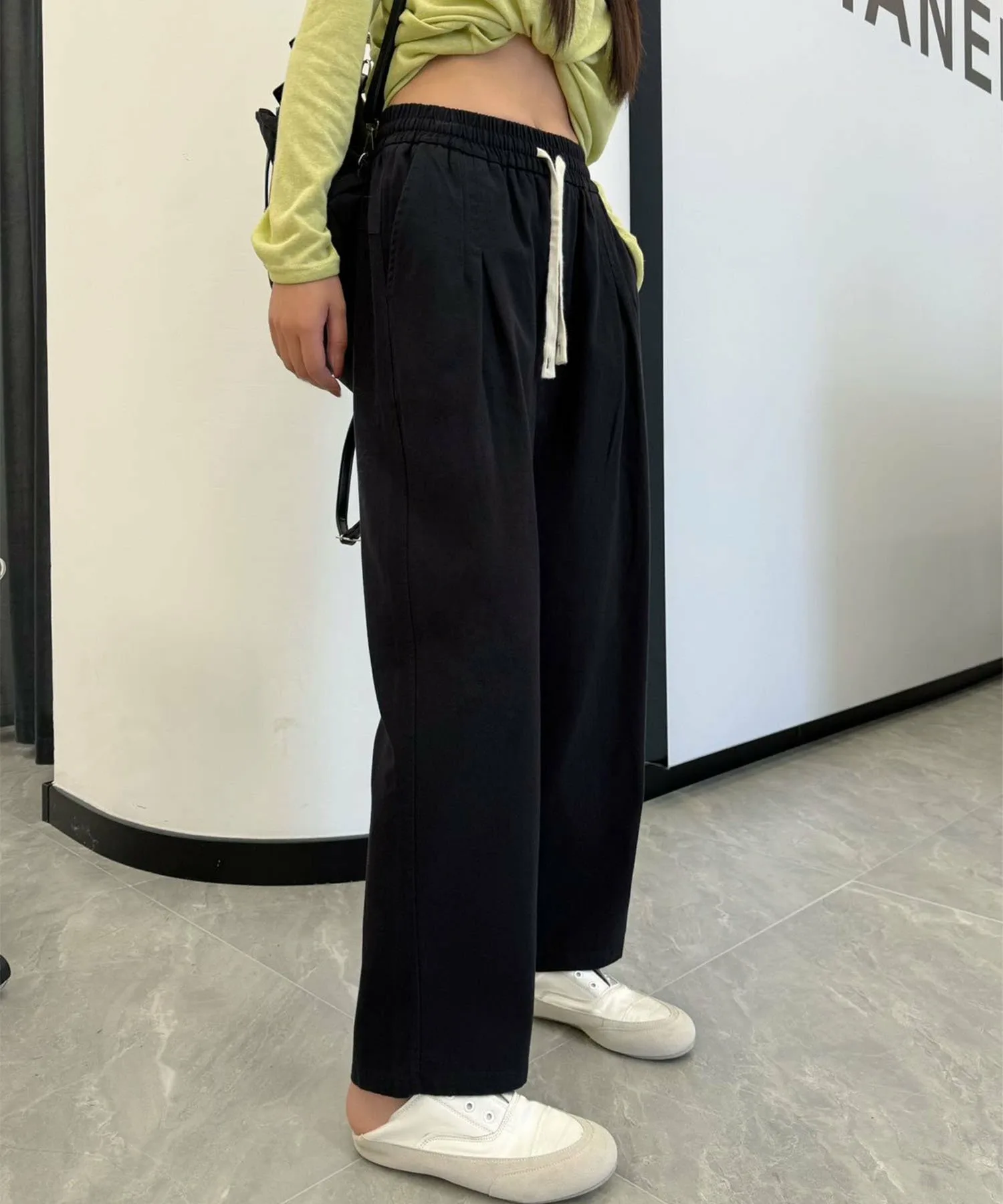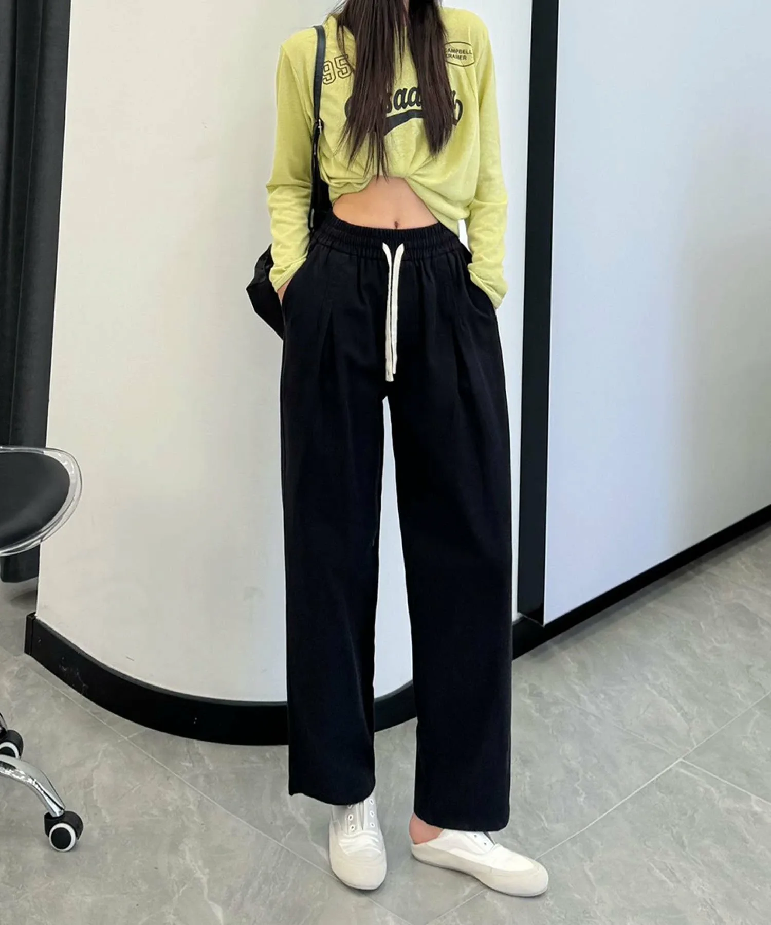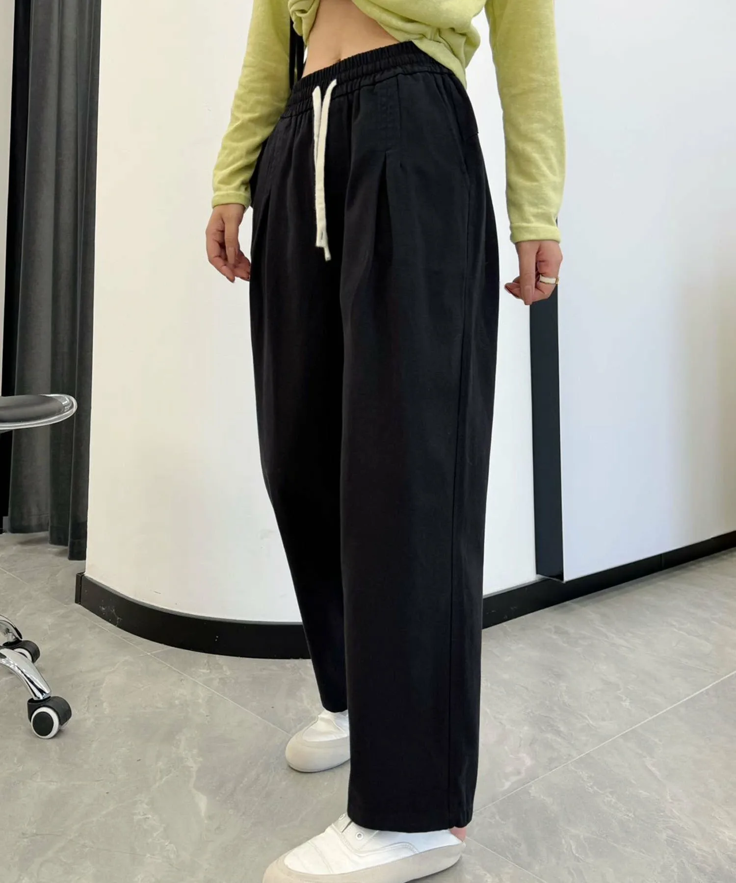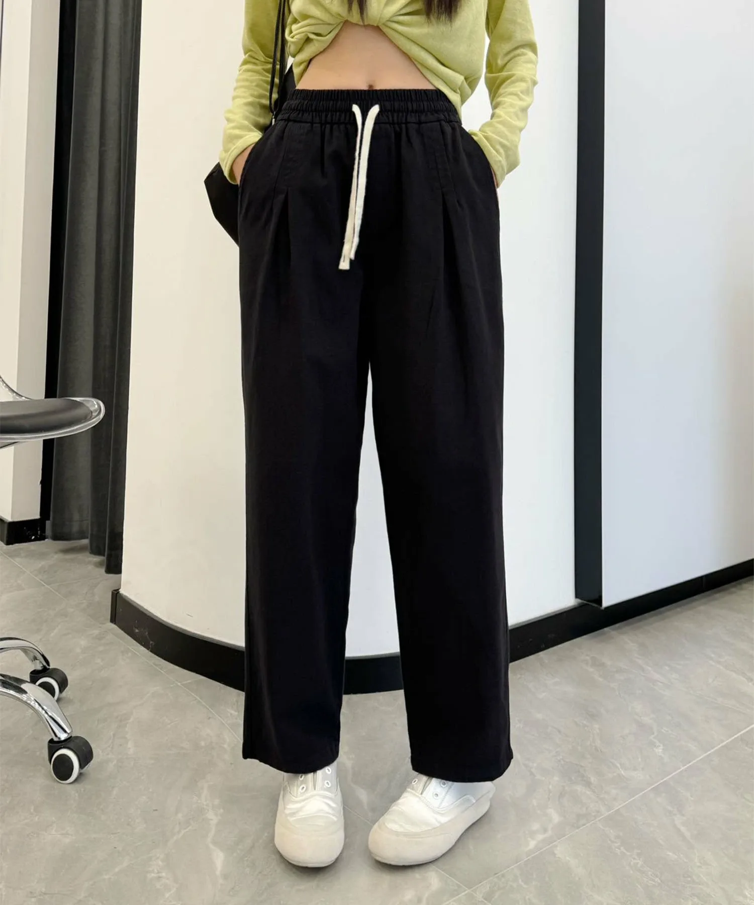 Это классические повседневные брюки. Эластичный пояс позволяет легко надевать и снимать их. Сочетайте их со свободным трикотажным свитером и туфлями на каблуках для создания элегантного повседневного образа.
