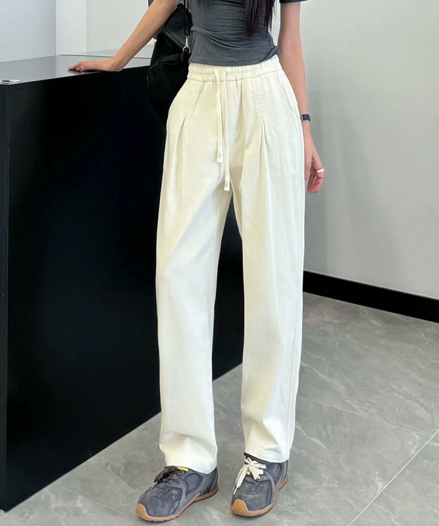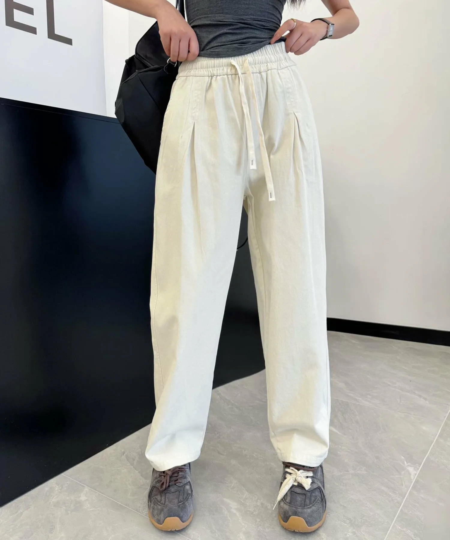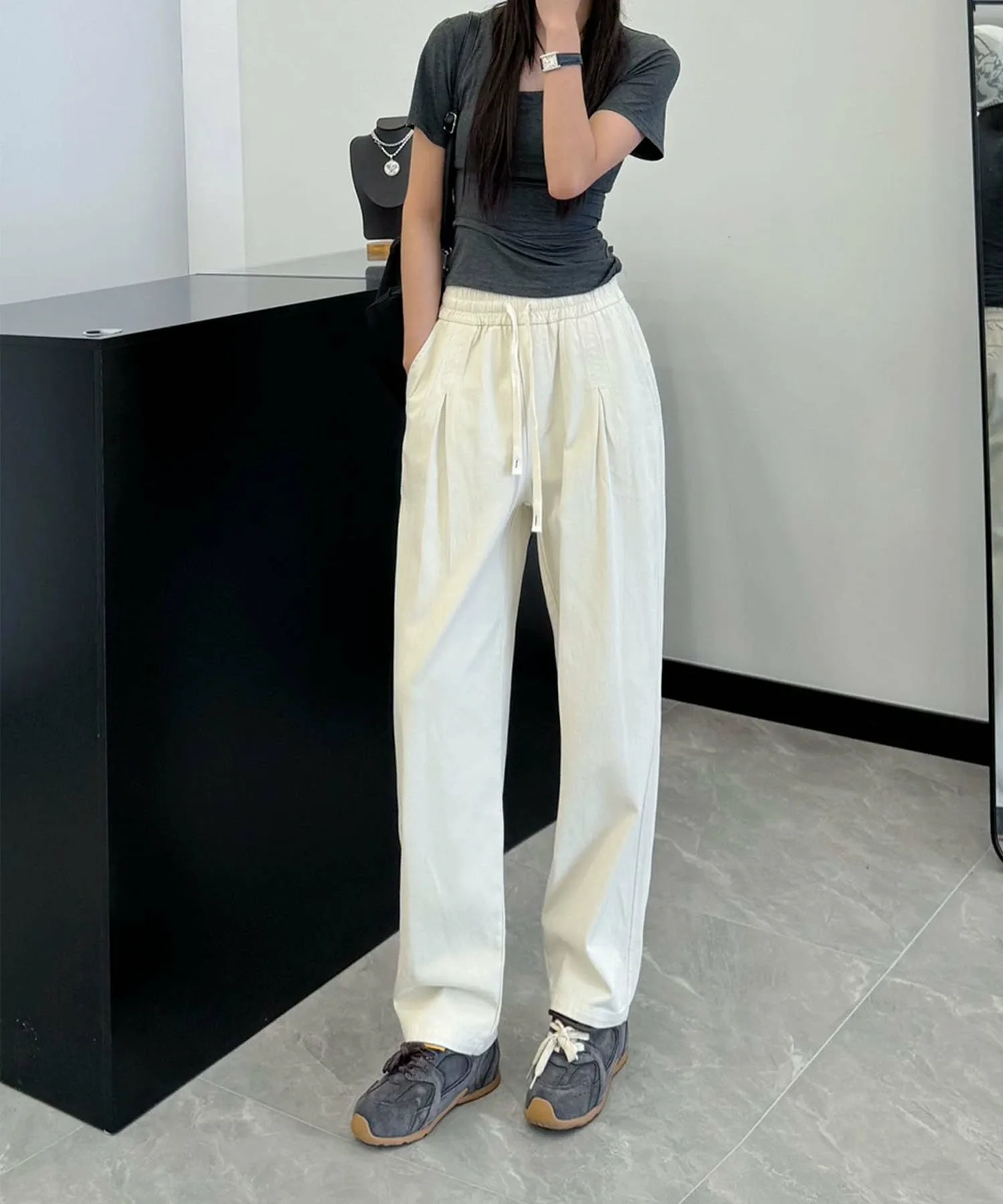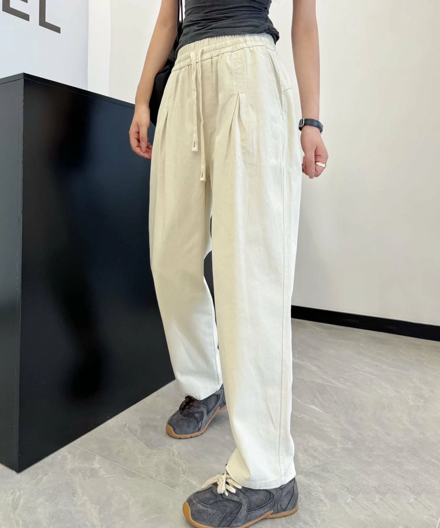 Это классические повседневные брюки. Эластичный пояс позволяет легко надевать и снимать их. Сочетайте их со свободным трикотажным свитером и туфлями на каблуках для создания элегантного повседневного образа.