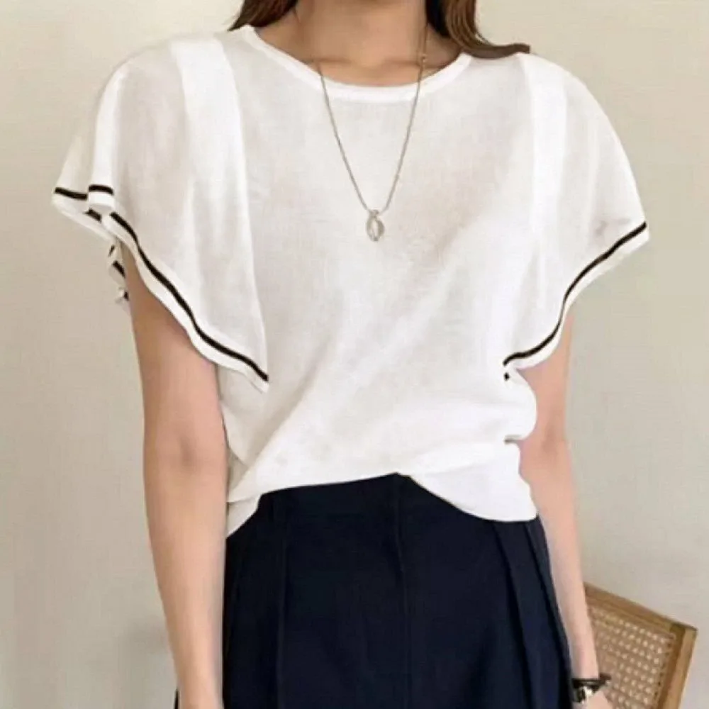 Трикотажный топ с круглым вырезом, короткие рукава, натуральный цвет, женский, красивый, пуловер с расклешенными рукавами, офисный повседневный
