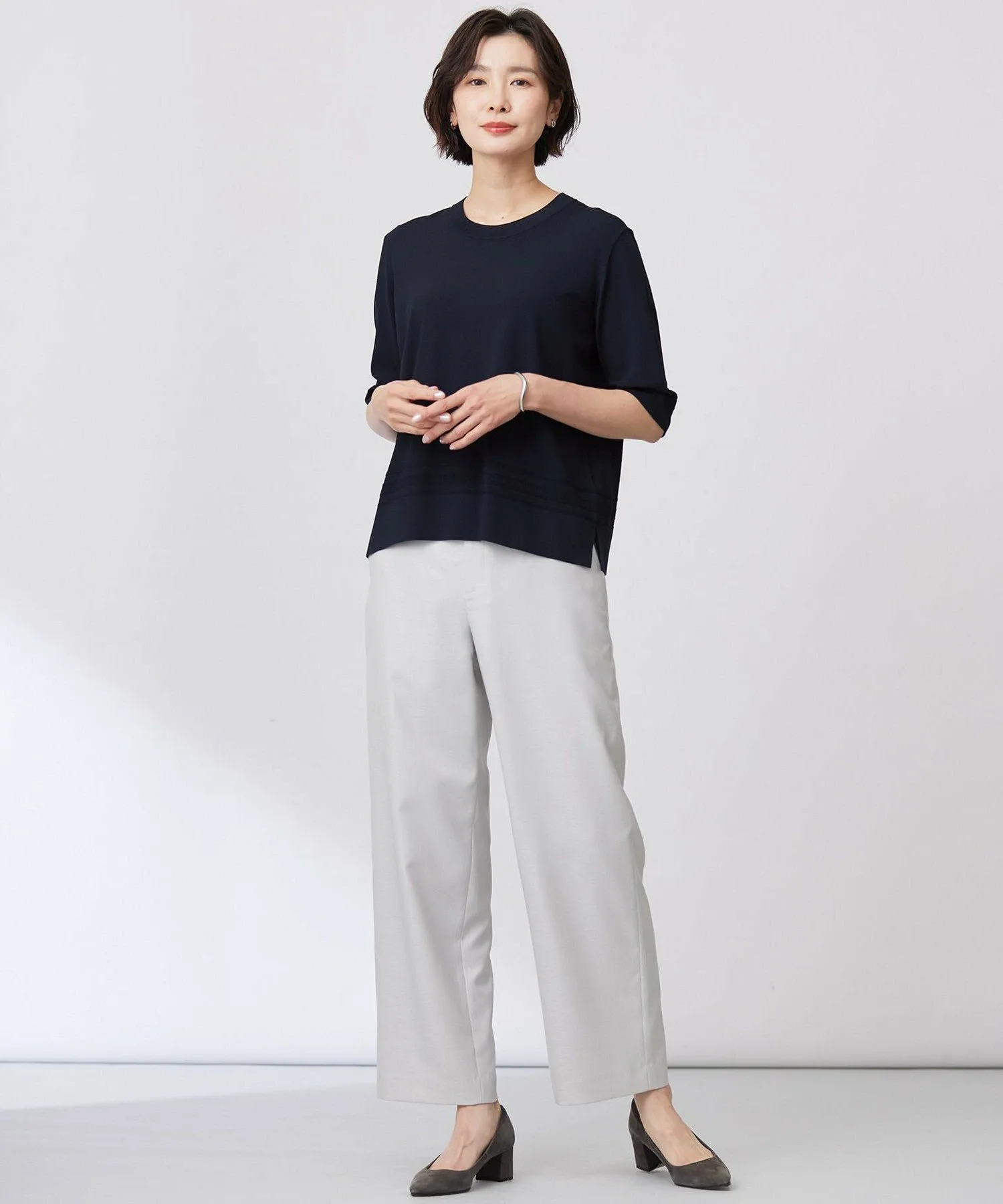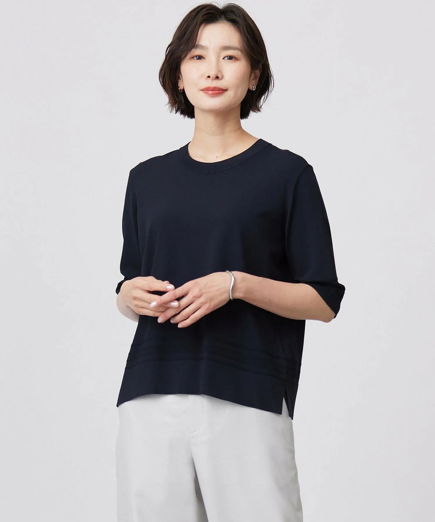 Дизайн: Освежающий вязаный пуловер с круглым вырезом и пятью рукавами. Рукава достаточно длинные, чтобы закрывать верхнюю часть рук, создавая аккуратный вид. Его можно носить долгое время, с начала лета и середины лета до начала осени. Вязаный узор на манжетах и нижнем крае добавляет акцент, и мы рекомендуем сочетать его с кардиганом с круглым вырезом из того же материала. Текстура материала создает изысканный вид, делая его универсальным предметом одежды, который можно носить и отдельно для элегантного образа.