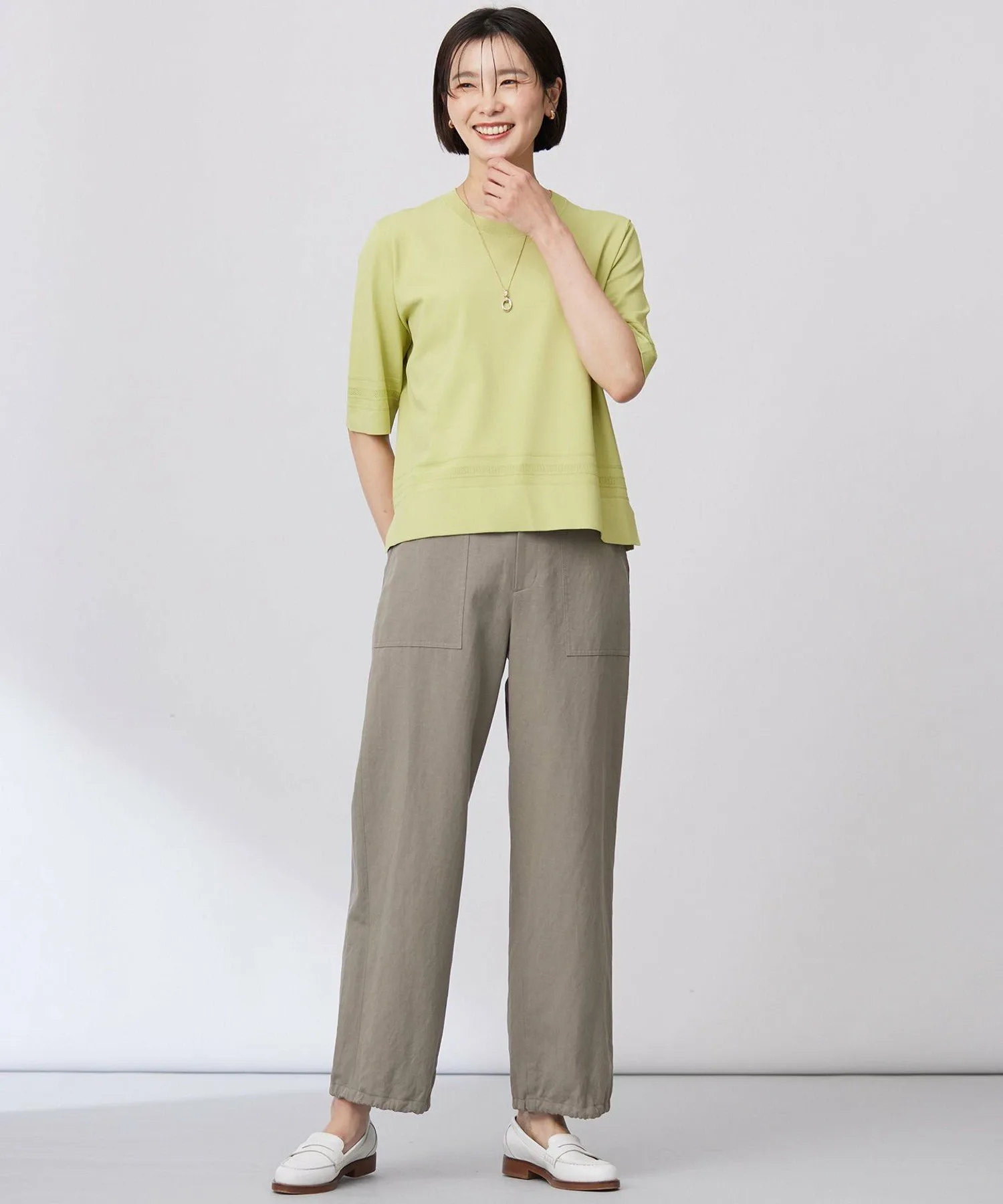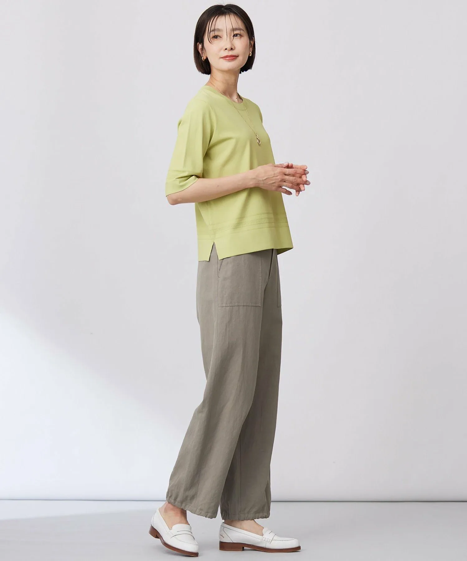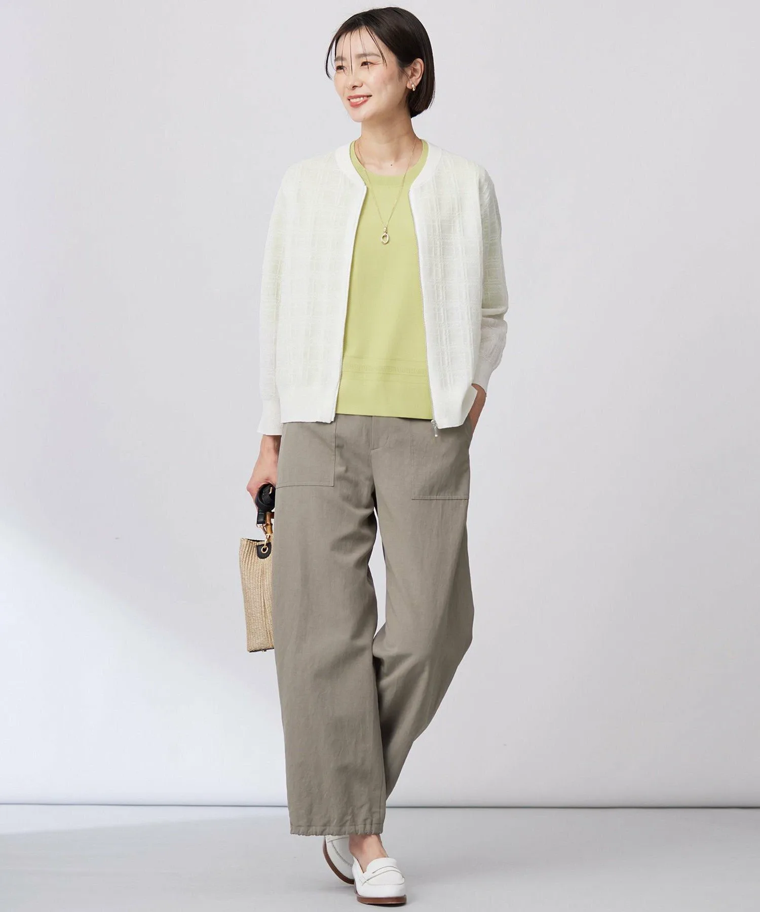 Дизайн: Освежающий вязаный пуловер с круглым вырезом и пятью рукавами. Рукава достаточно длинные, чтобы закрывать верхнюю часть рук, создавая аккуратный вид. Его можно носить долгое время, с начала лета и середины лета до начала осени. Вязаный узор на манжетах и нижнем крае добавляет акцент, и мы рекомендуем сочетать его с кардиганом с круглым вырезом из того же материала. Текстура материала создает изысканный вид, делая его универсальным предметом одежды, который можно носить и отдельно для элегантного образа.