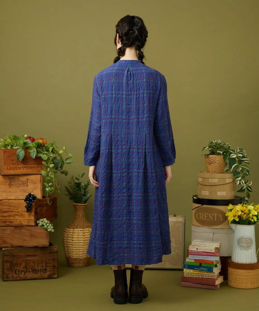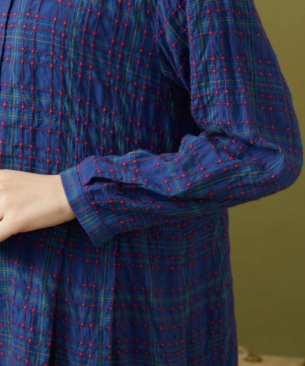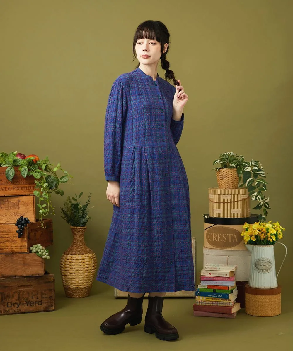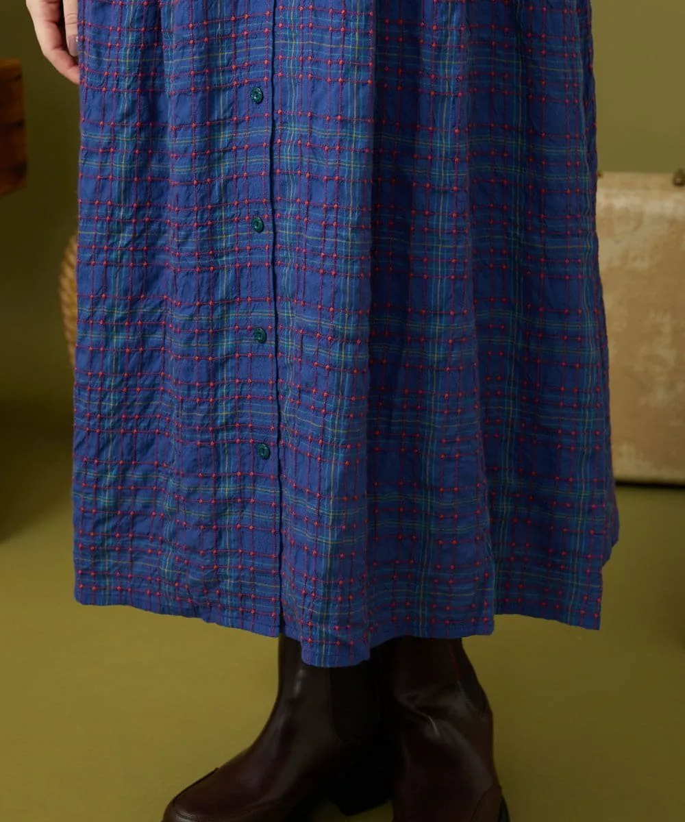 Это платье сшито из ткани в клетку добби, произведенной в Ниигате, на родине клетчатого плетения, окрашенного пряжей. Ткань имеет текстурированную поверхность. Изготовленная из вискозы, она легкая и струящаяся.