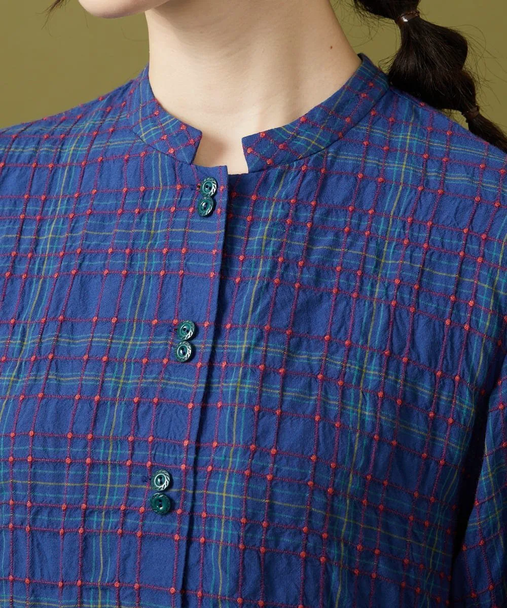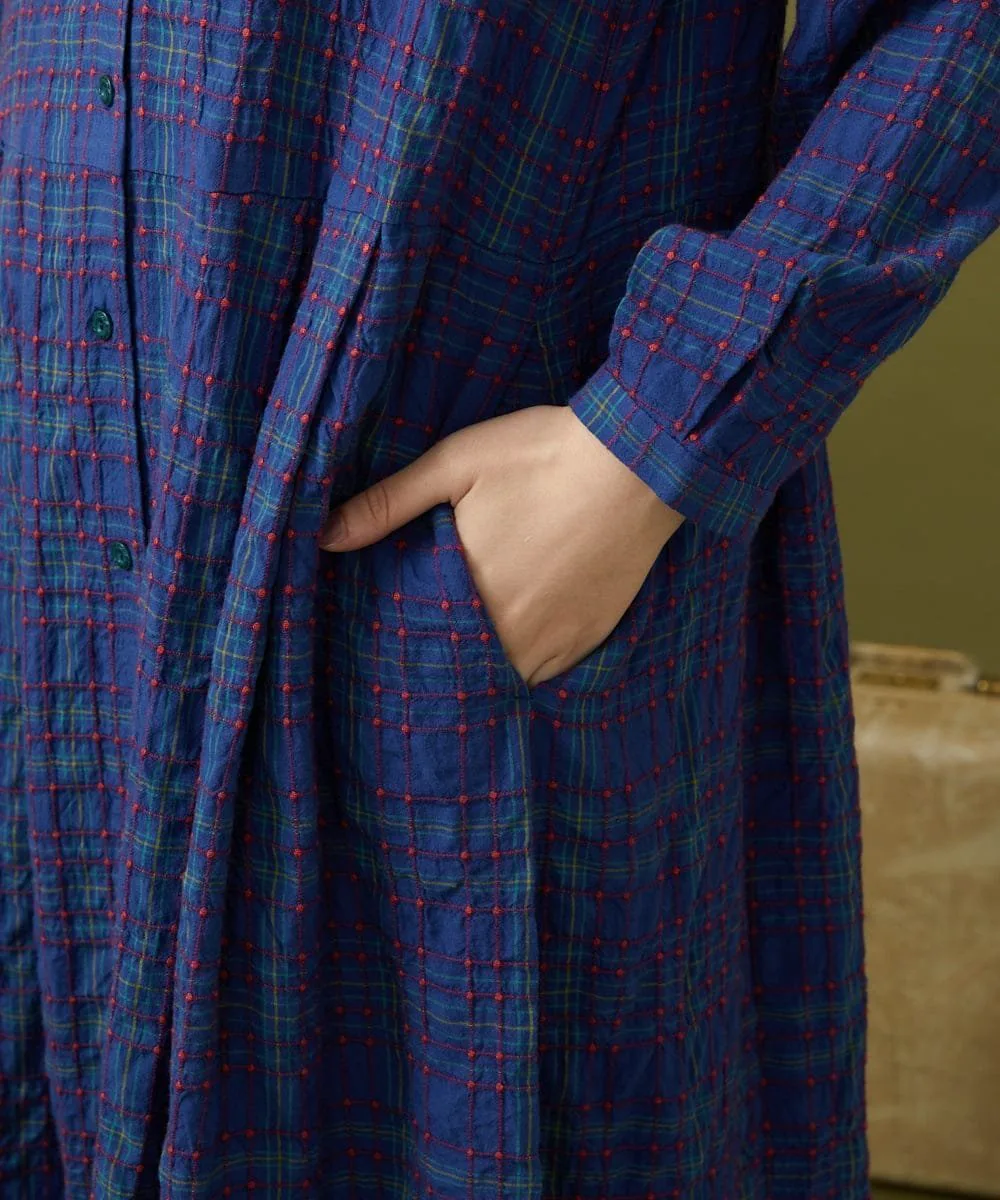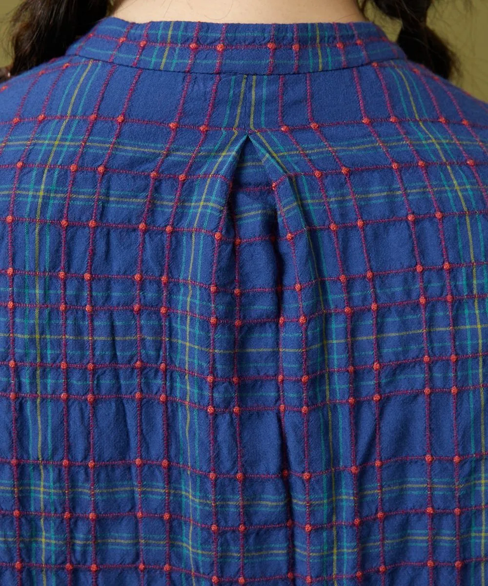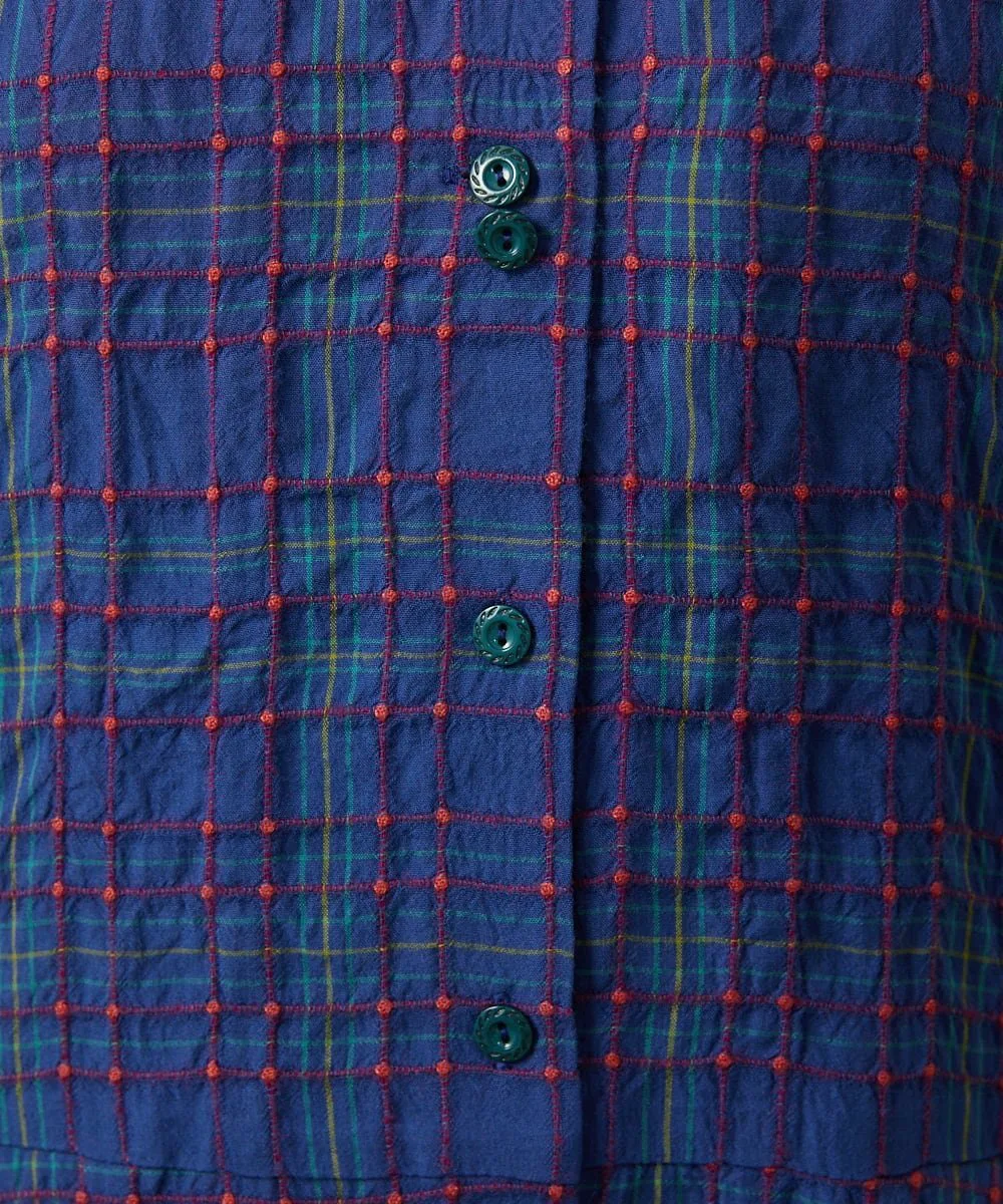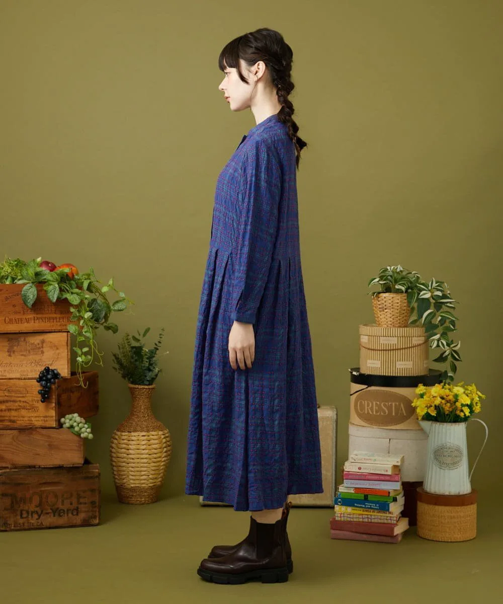 Это платье сшито из ткани в клетку добби, произведенной в Ниигате, на родине клетчатого плетения, окрашенного пряжей. Ткань имеет текстурированную поверхность. Изготовленная из вискозы, она легкая и струящаяся.