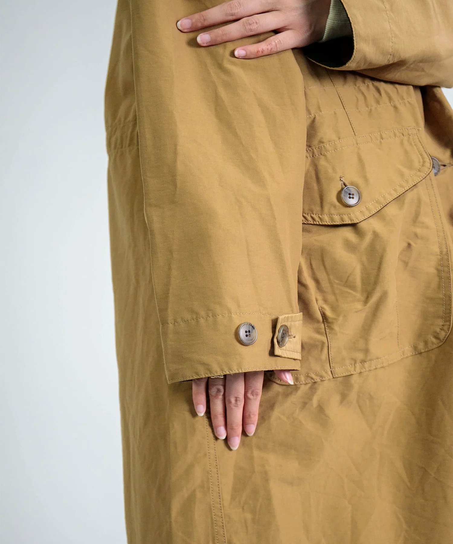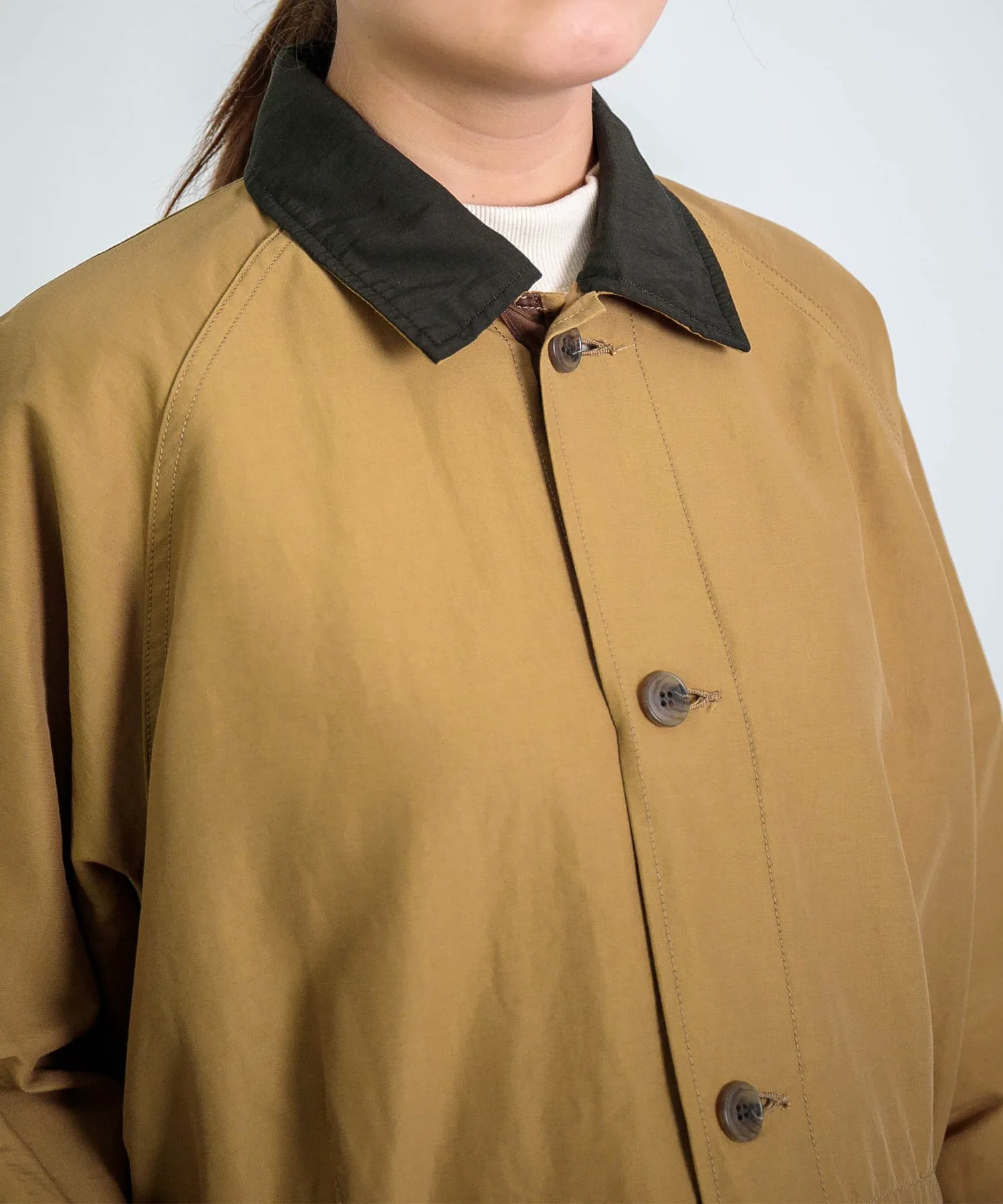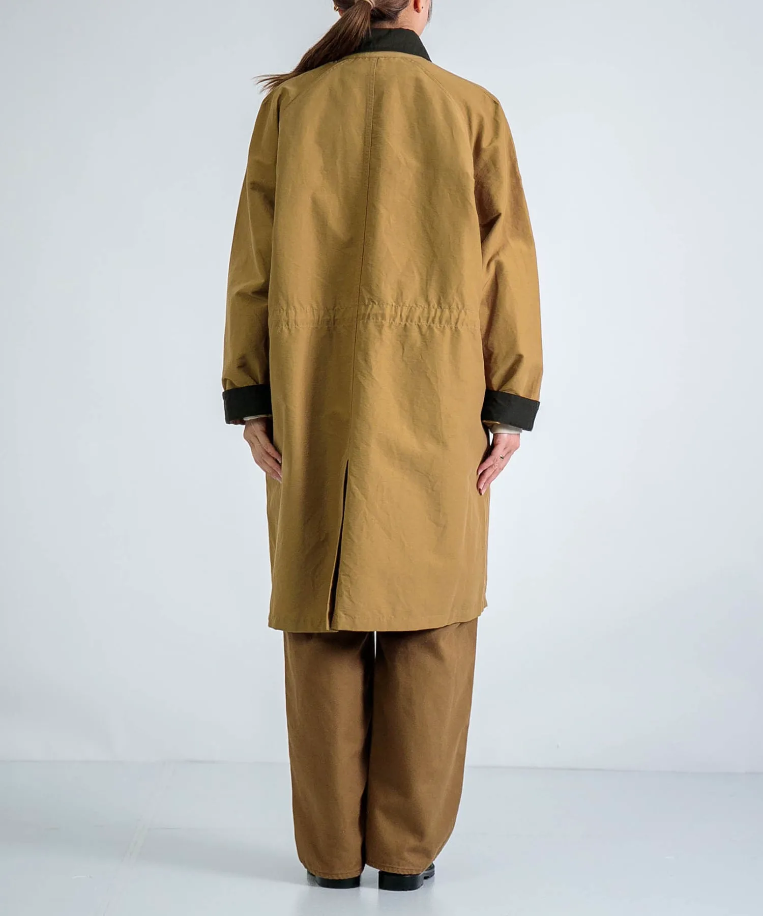 60% хлопковая нить утка и 40% нейлоновая нить основы, обычно известная как 64 cross.Оригинальный функциональный материал, известный своими водоотталкивающими, но при этом дышащими свойствами. Ткань имеет красивый потертый блеск и плотность, а ее уникальная текстура развивается со временем.Воротник выполнен из контрастной ткани, что создает осенне-зимнее ощущение и мягкий вид вокруг лица. Внимание к деталям также проявляется в ремешке под подбородком, больших объемных карманах, реглане внизу спереди и поясе. Свободный, объемный силуэт с рукавами реглан обеспечивает свободу движений, и его можно комфортно носить поверх толстого трикотажа или толстовки.Средняя длина легко сочетается с брюками или юбками. Она естественно прикрывает бедра и создает элегантное, легкое ощущение.…………………… Подкладка: отсутствуетТолщина: стандартнаяРастяжимость: отсутствуетКарманы: естьУход: химчистка…………………… 60% хлопок, 40% нейлон