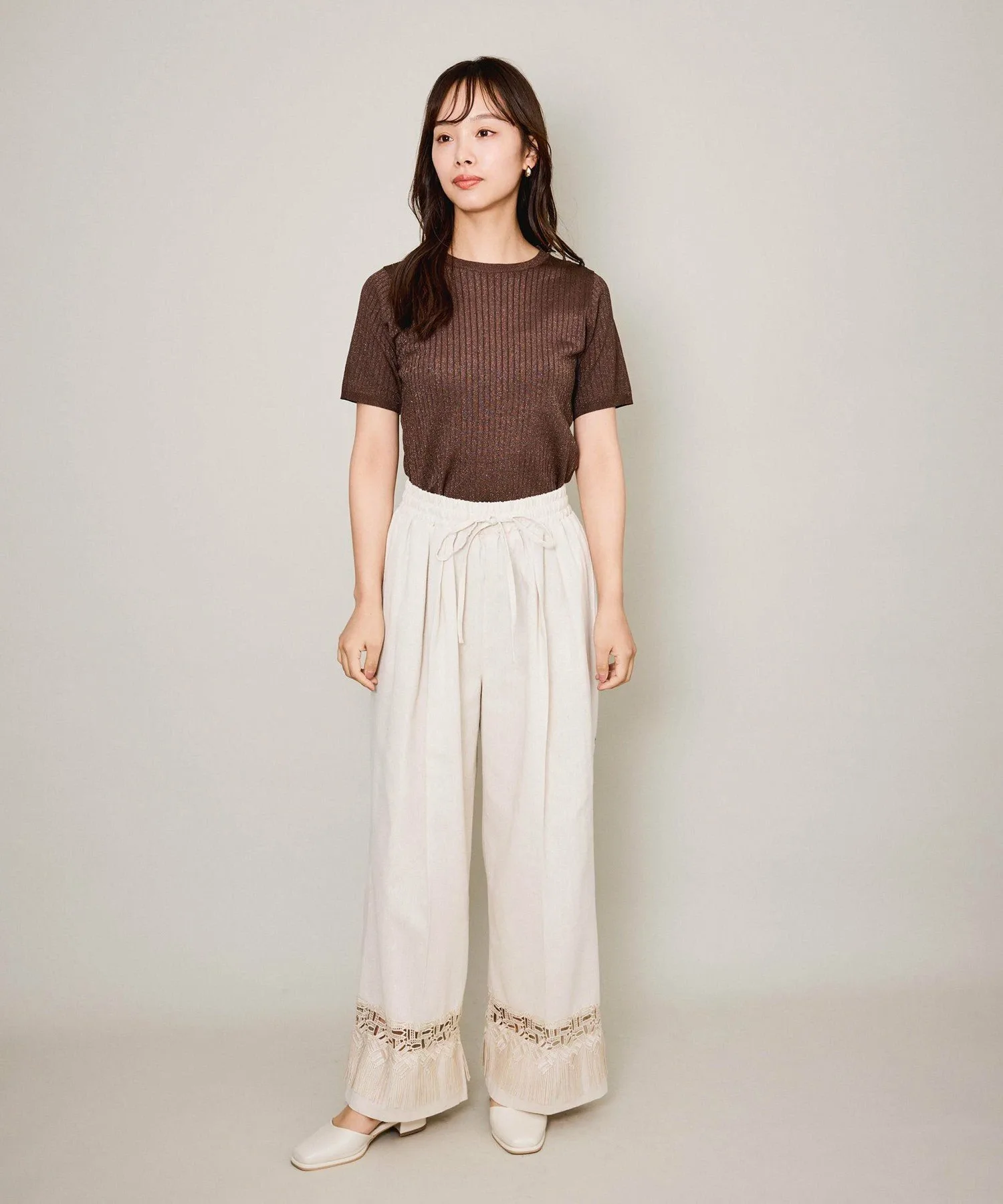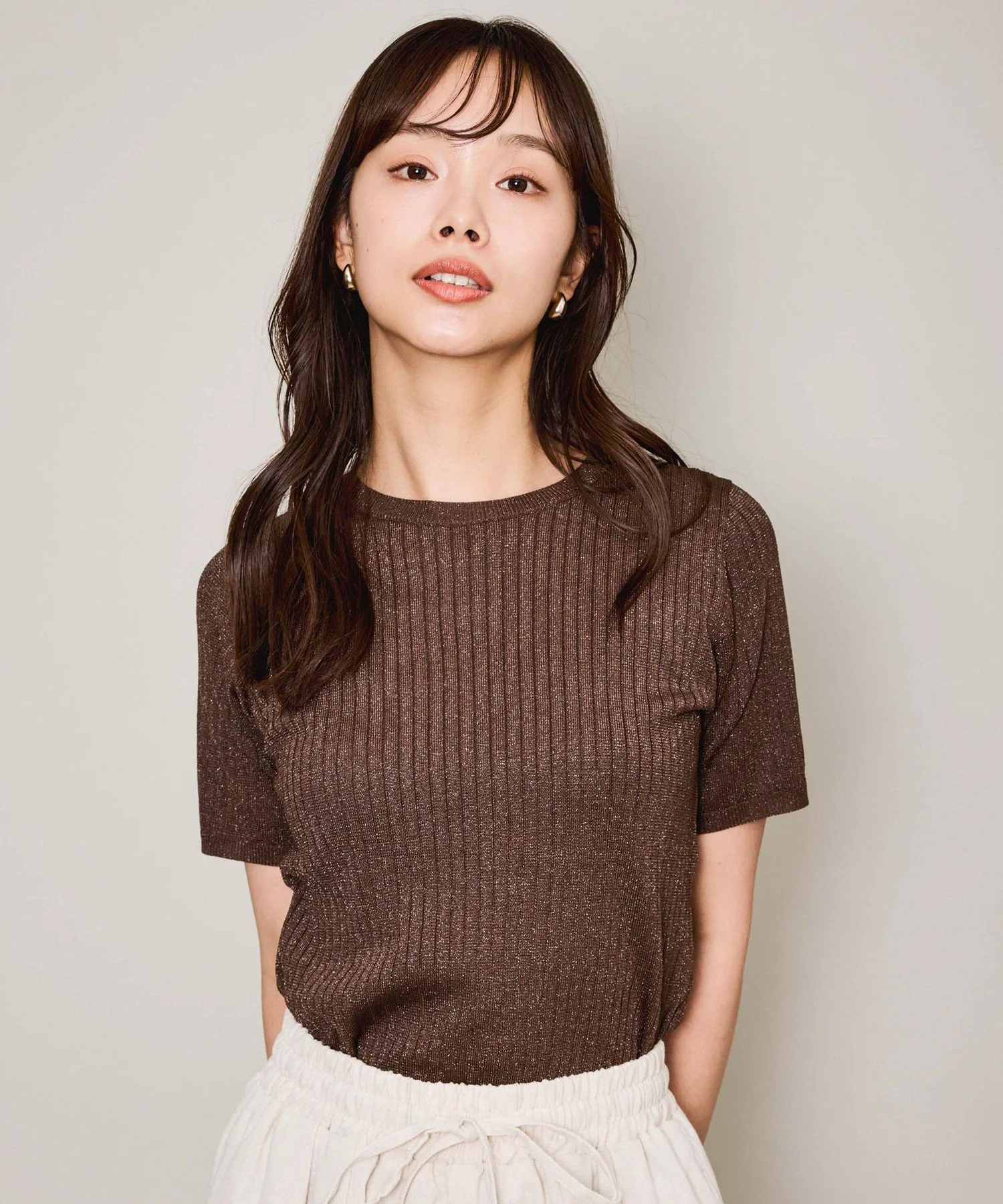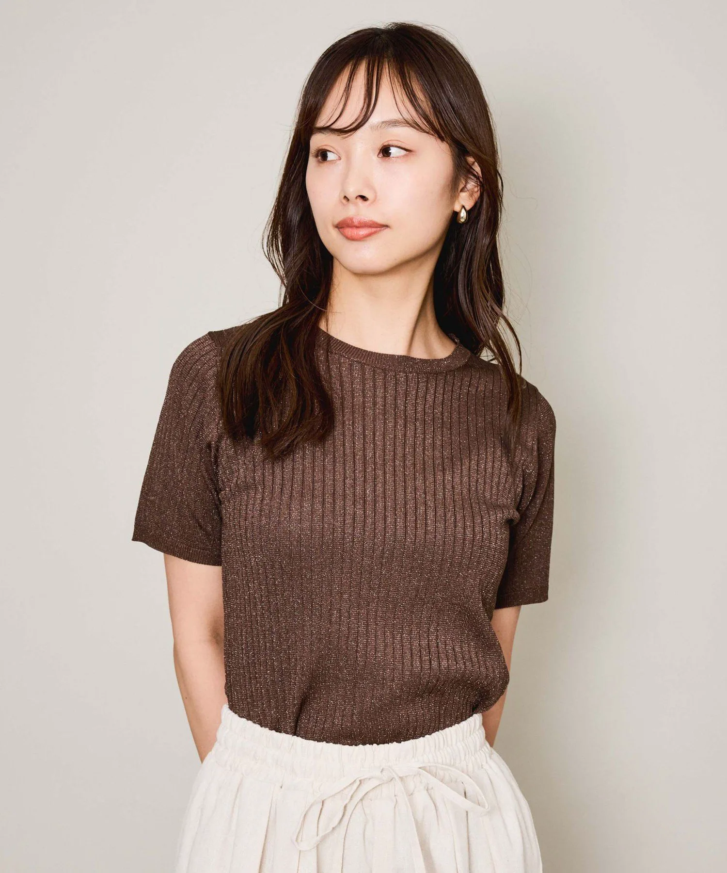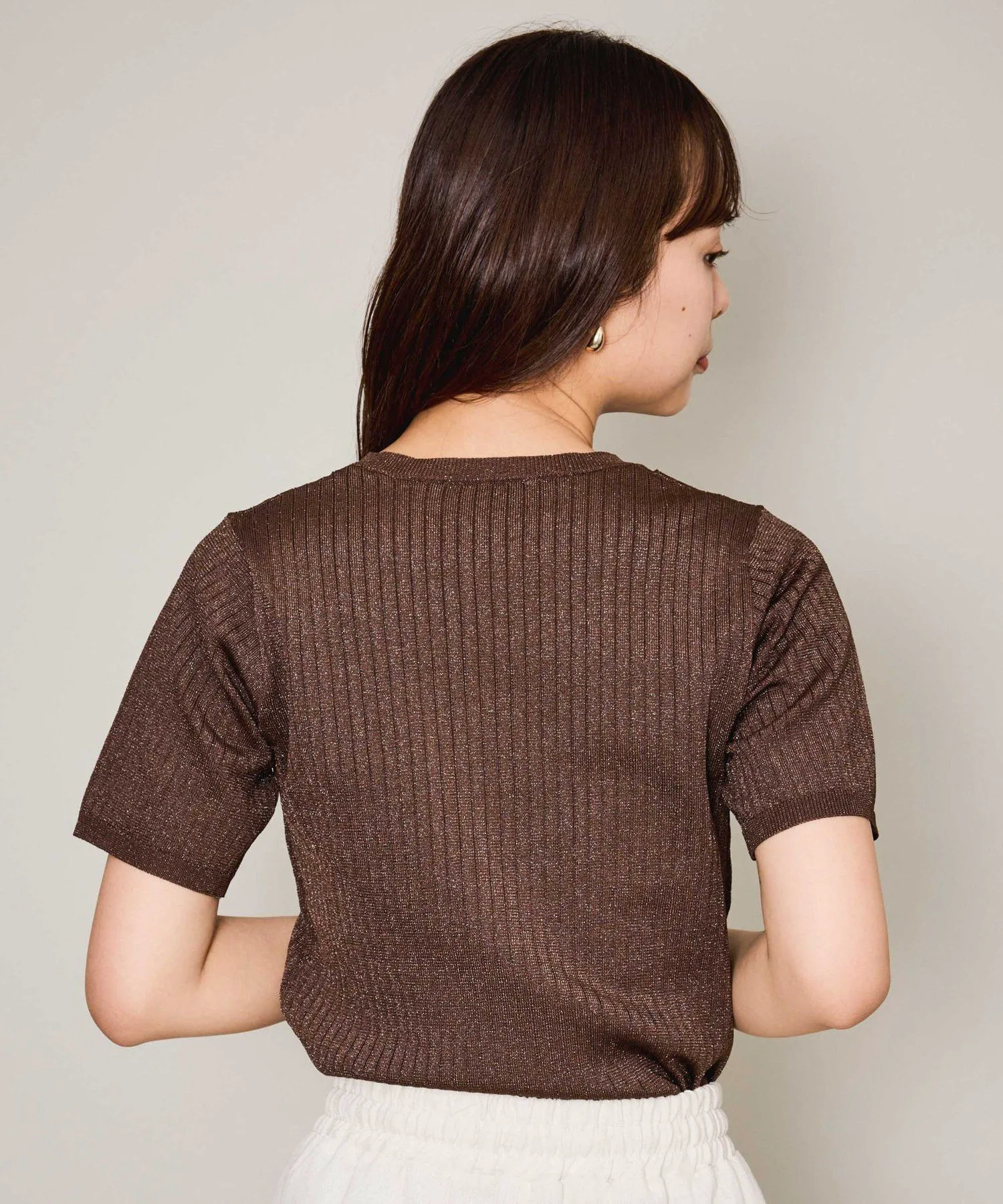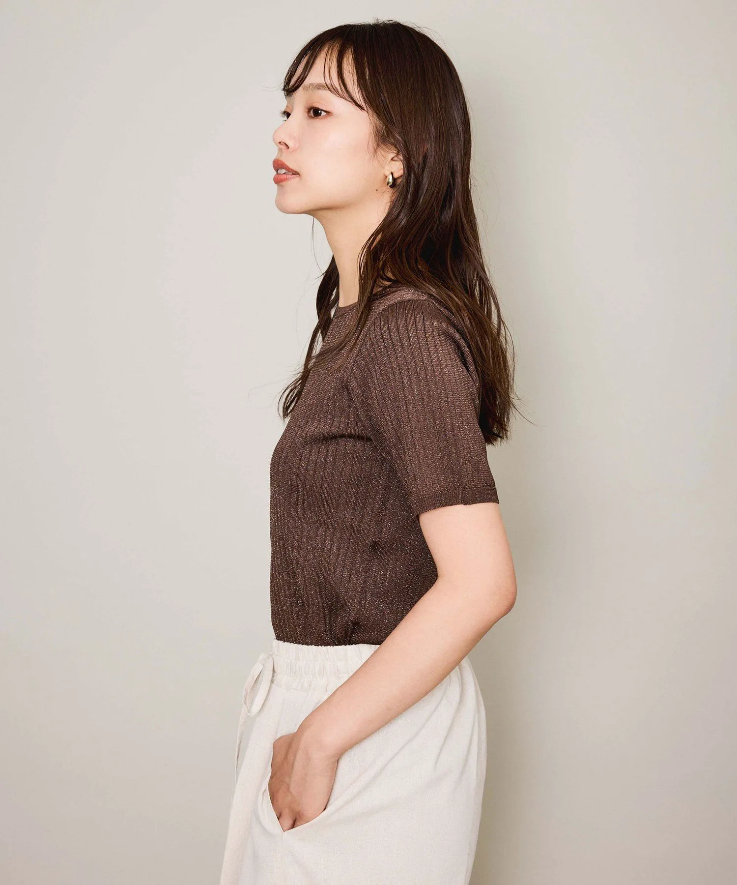 ●Этот трикотажный топ с короткими рукавами изготовлен из пряжи с легким блеском.