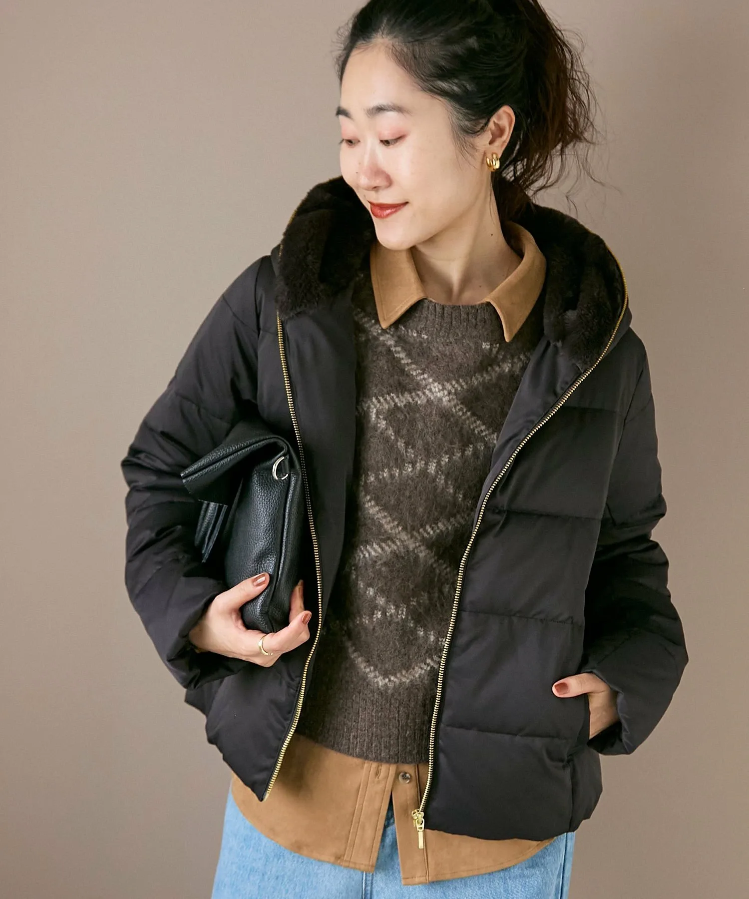 ★Прошлогодняя невероятно популярная пуховая куртка с мехом возвращается в этом году★ *Темно-синий и светло-серый цвета доступны только в интернет-магазине. Линии на корпусе создают красивый силуэт, который идеально облегает фигуру. Эта очень популярная модель отличается облегающим силуэтом, несмотря на то, что изготовлена из пуха. Изготовленная из 80% пуха, она достаточно теплая, но количество пуха скорректировано, чтобы избежать излишней громоздкости. Капюшон украшен большим количеством искусственного меха, обеспечивая тепло вокруг шеи и создавая обтекаемый вид вокруг лица. Идеально сочетается с широкими брюками или атласными юбками. Чрезвычайно теплая, она также отлично смотрится с более легкими топами, такими как водолазки в рубчик и блузки. *Темно-синий и светло-серый цвета доступны только в интернет-магазине. *Также доступна длинная пуховая куртка из того же материала. (3058075912 Длинный пуховый капюшон с мехом)