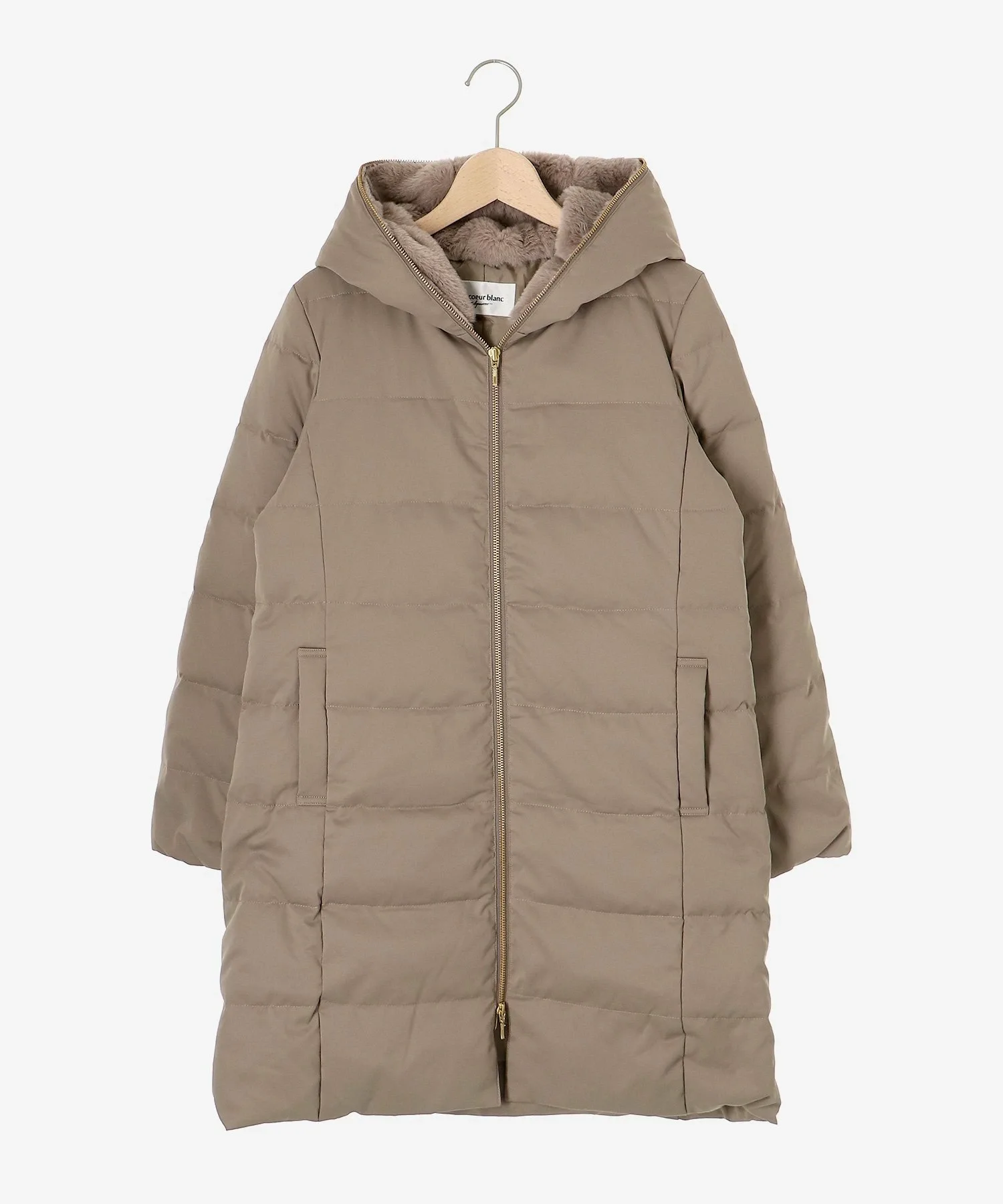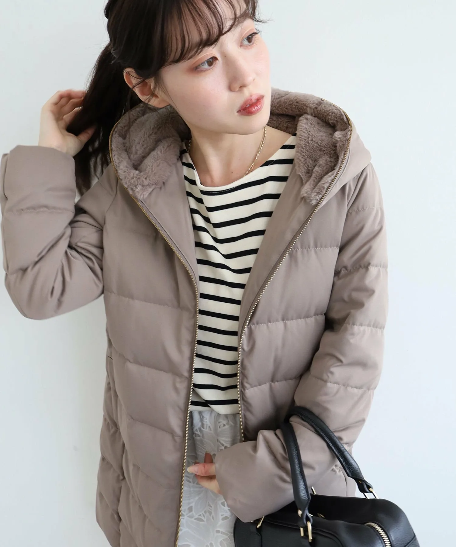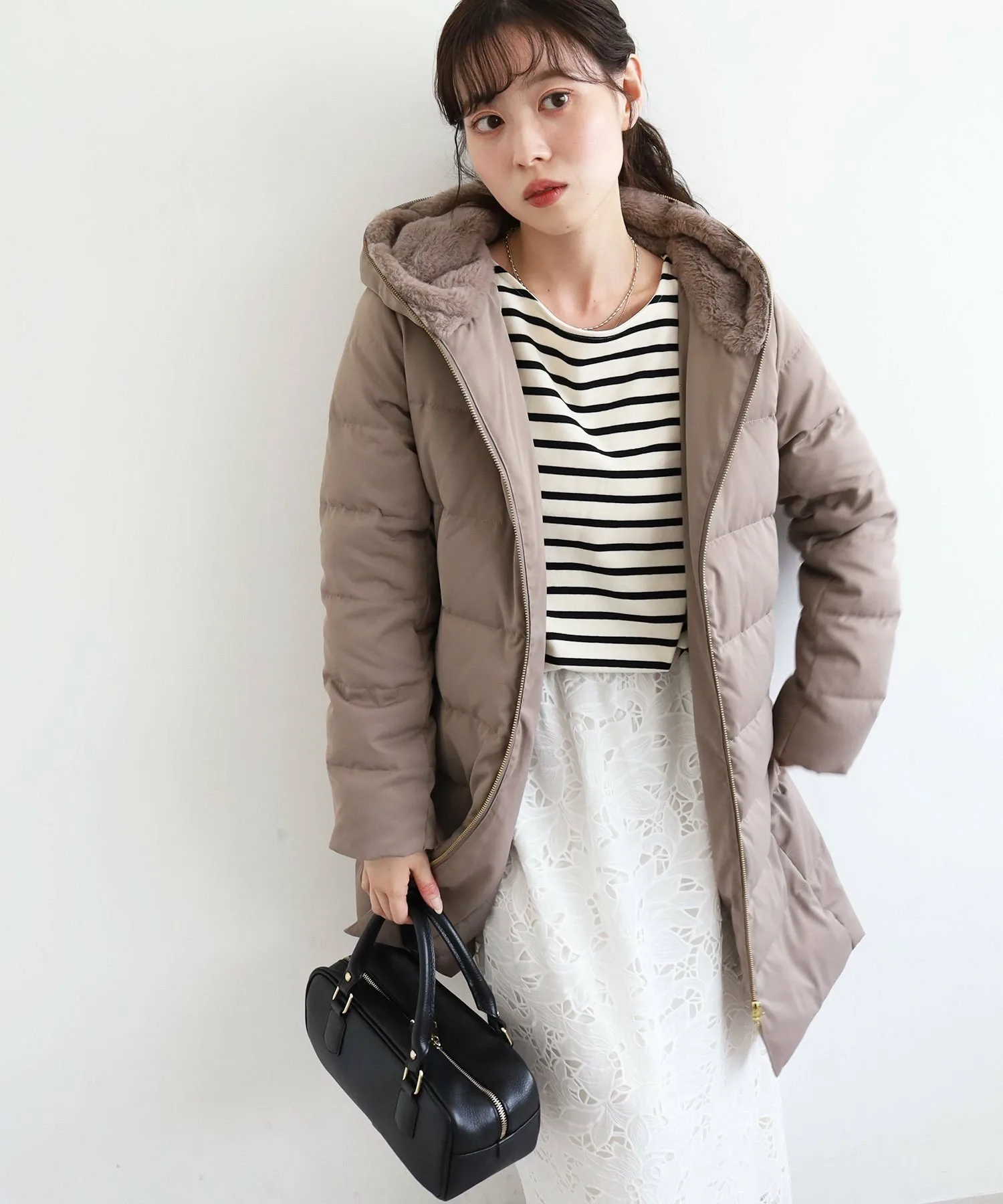 Капюшон украшен большим количеством искусственного меха, и этот дизайн не только согревает шею, но и придает лицу элегантный вид.