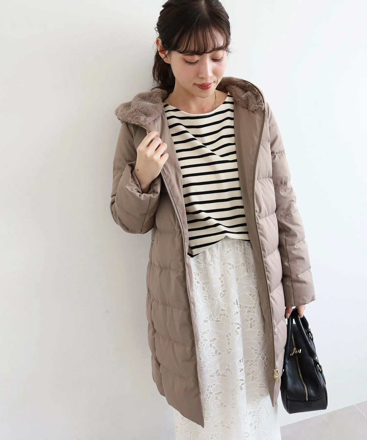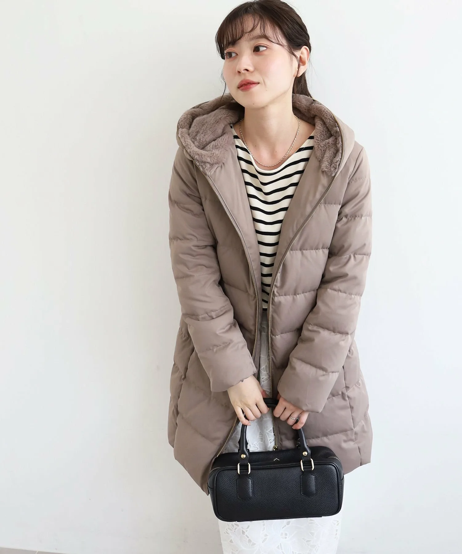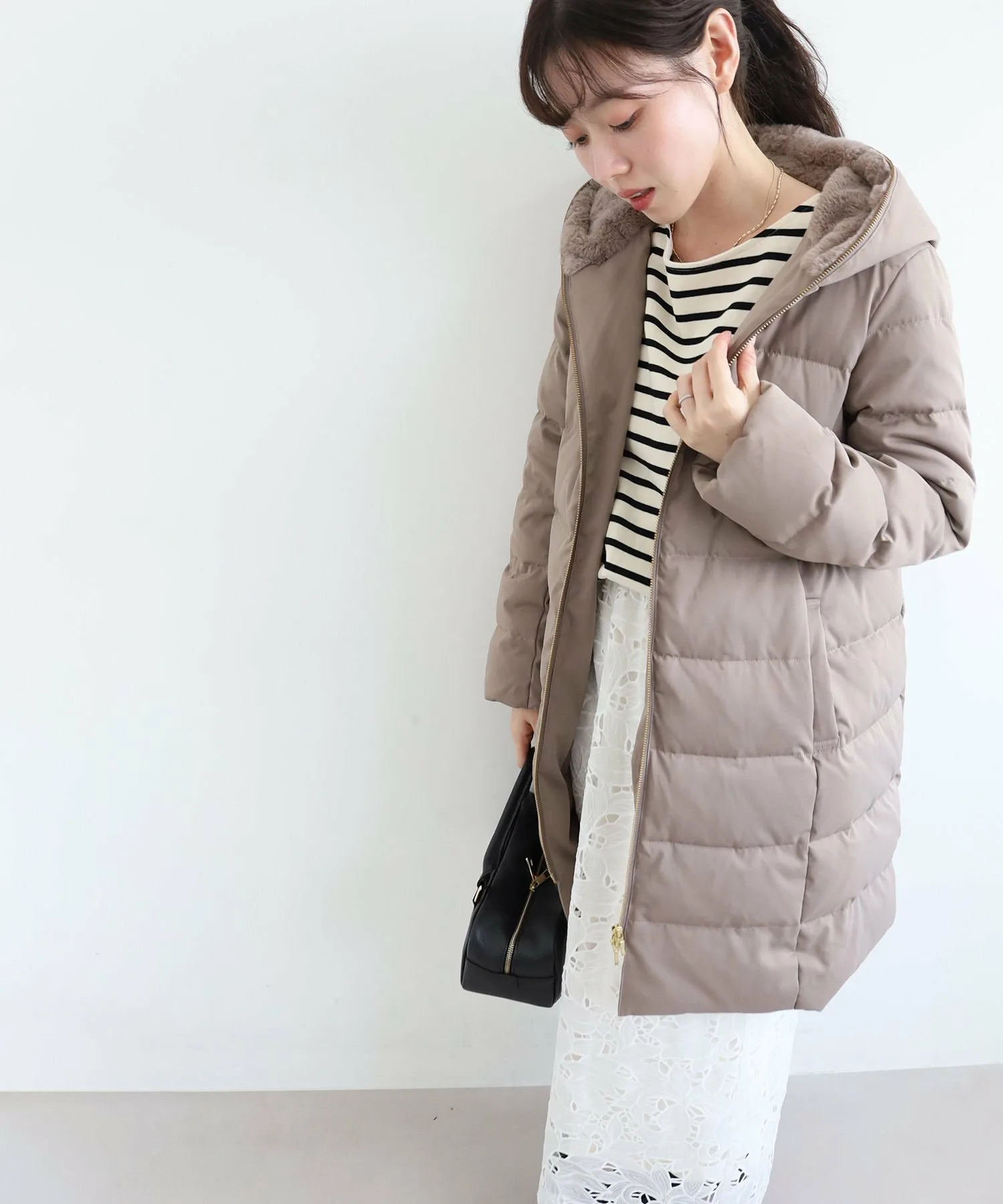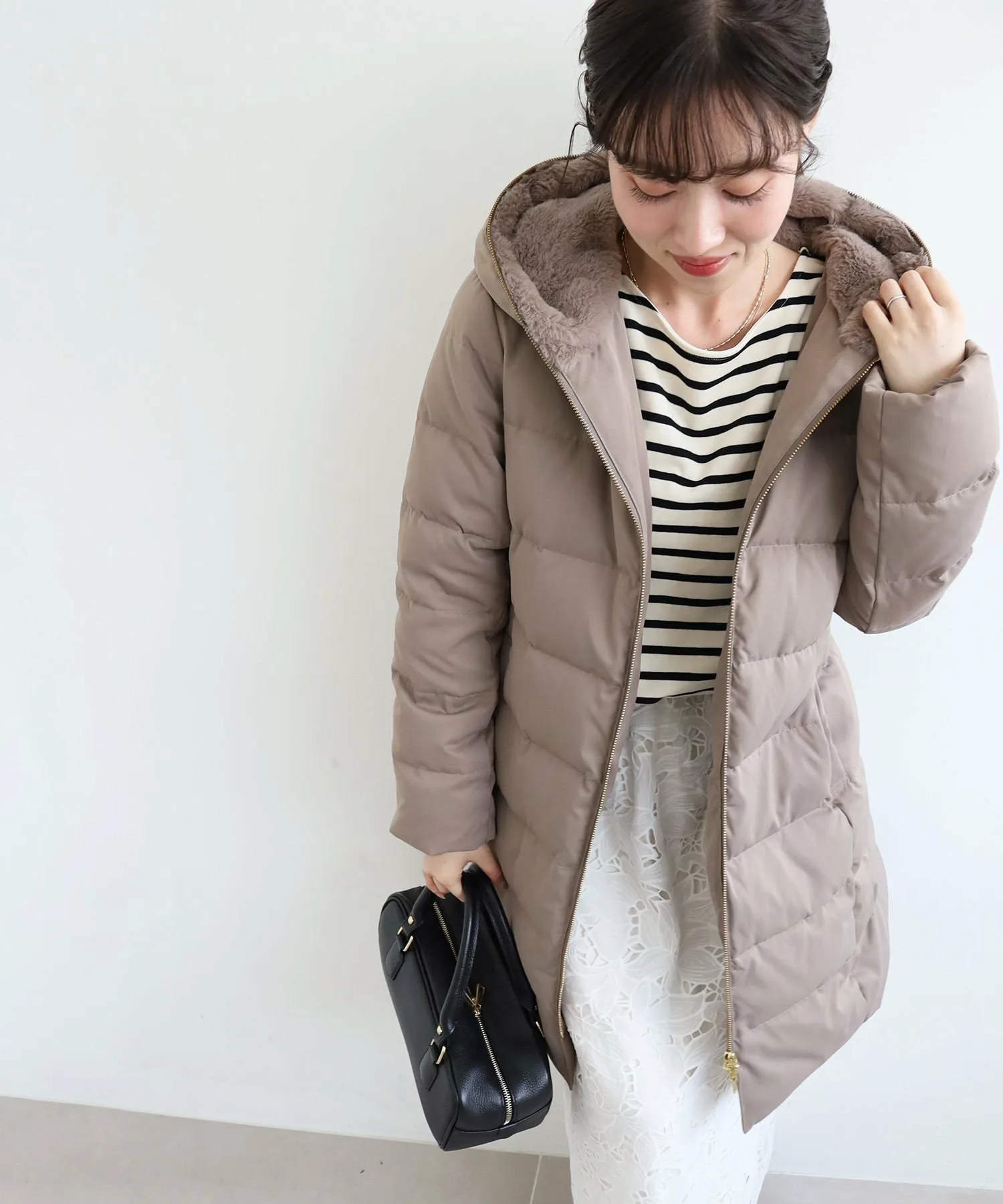 Капюшон украшен большим количеством искусственного меха, и этот дизайн не только согревает шею, но и придает лицу элегантный вид.