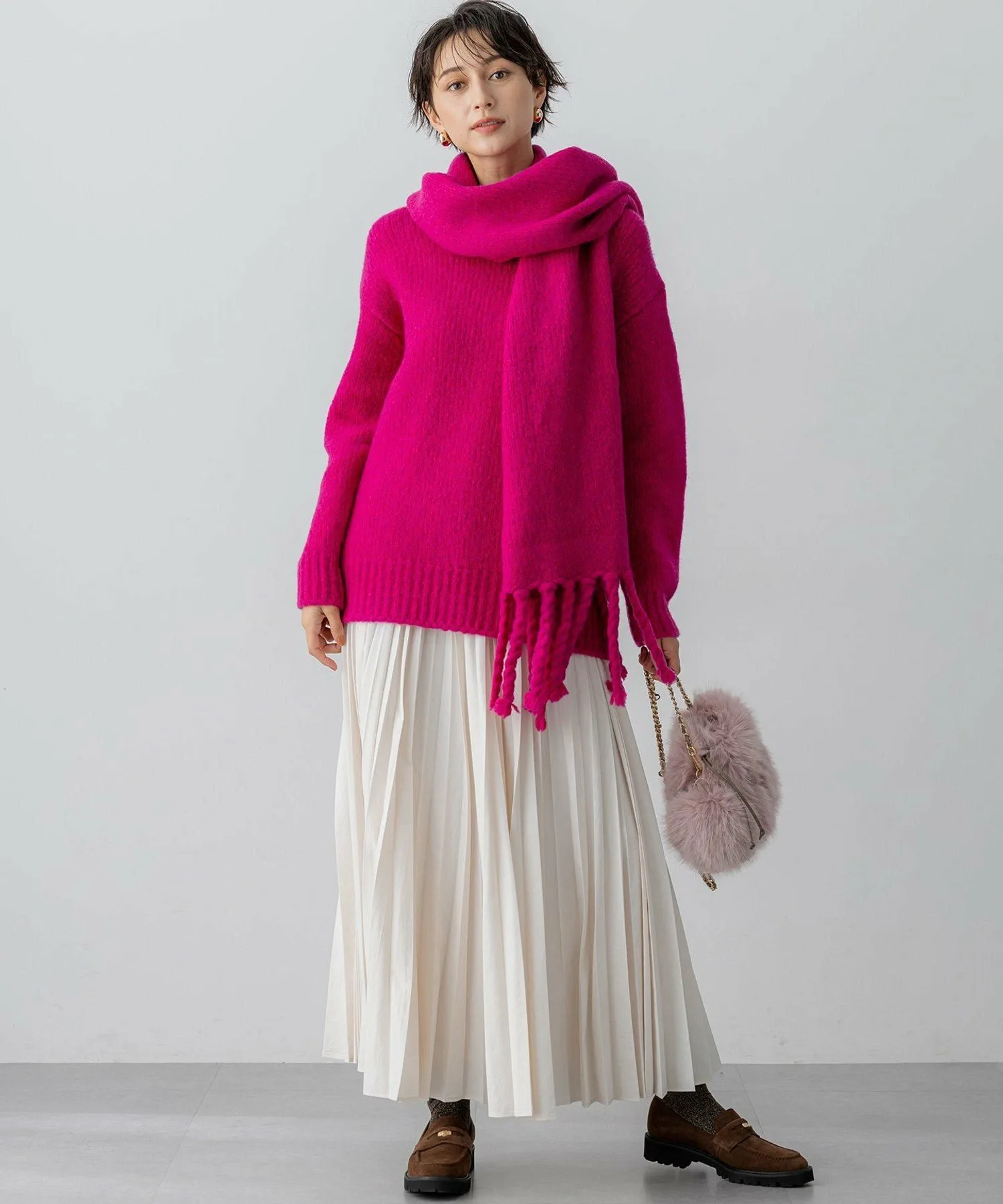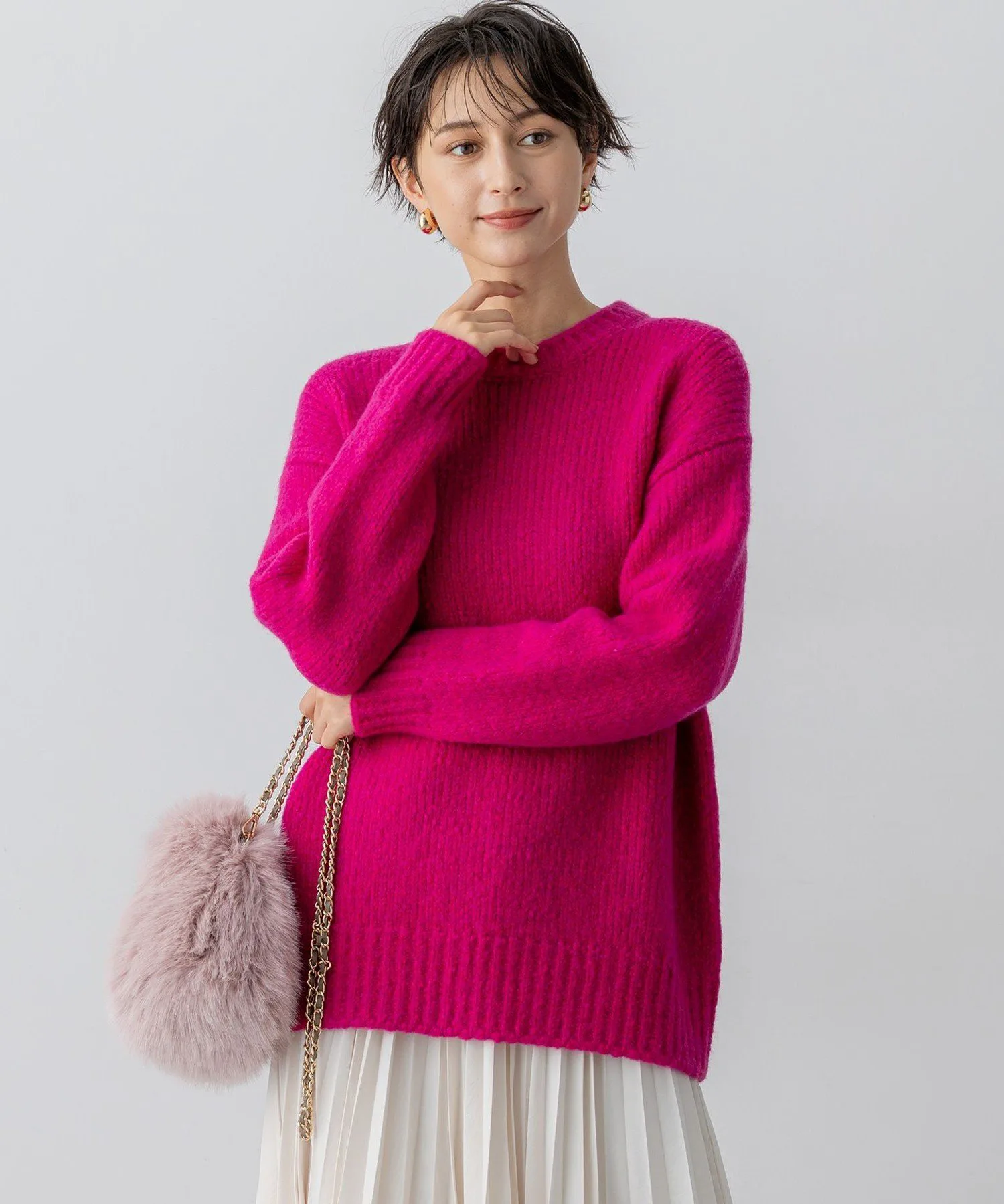 Этот трикотаж отличается яркими цветами и очаровательной текстурой тканей, окрашенных в Италии. Круглый вырез горловины с толстым ребристым воротником, свободный силуэт и длина до бедра делают его теплым и комфортным даже в разгар зимы. Он станет центральным элементом вашего образа, как только вы его наденете, а сочетание с простыми брюками создаст стильный вид. Доступен в трех цветах: универсальный белый (#001), привлекательный яркий пурпурный (#014) и освежающий небесно-голубой (#072).