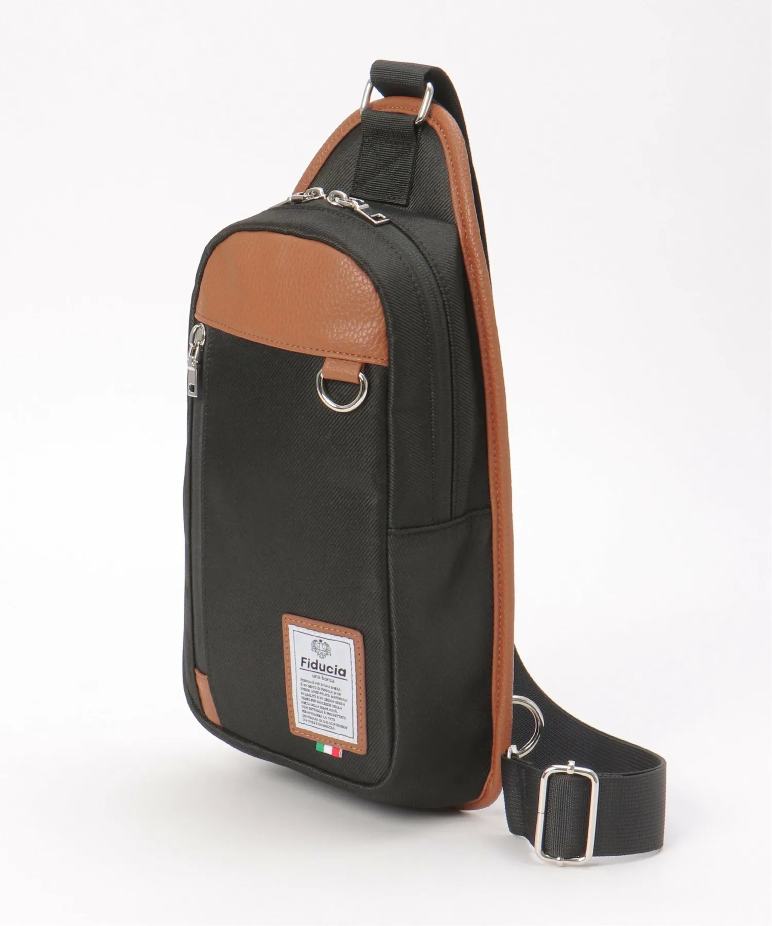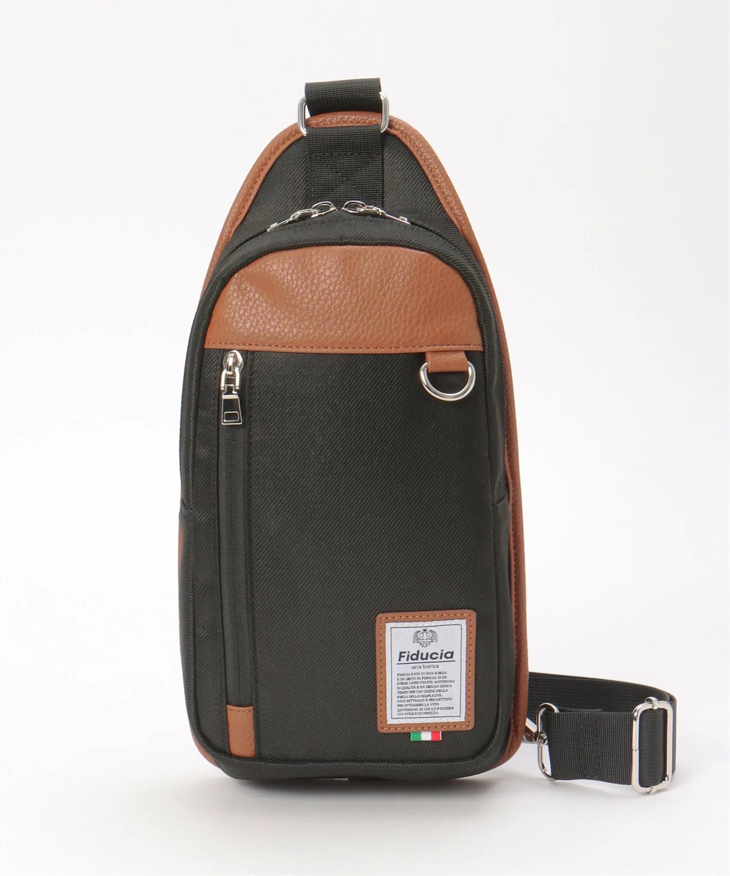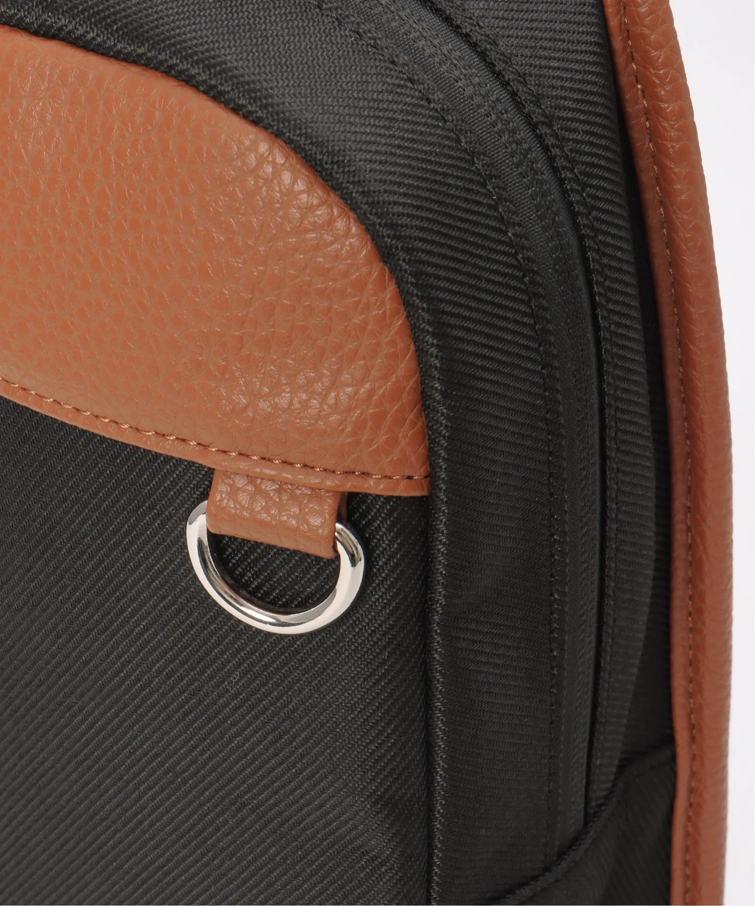 Сумка через плечо с контрастной цветовой гаммой, сочетающей полиэстер и материалы, имитирующие кожу.