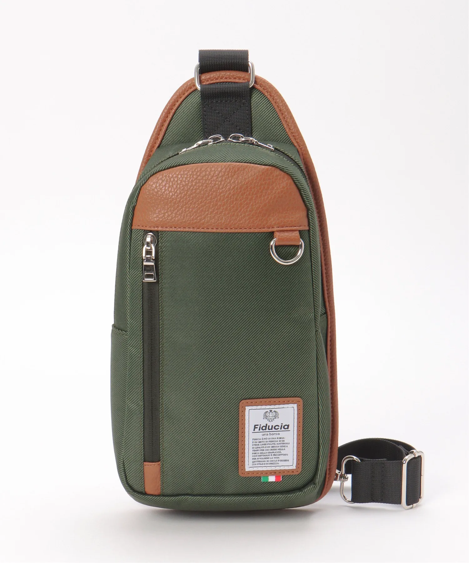 Сумка через плечо с контрастной цветовой гаммой, сочетающей полиэстер и материалы, имитирующие кожу.