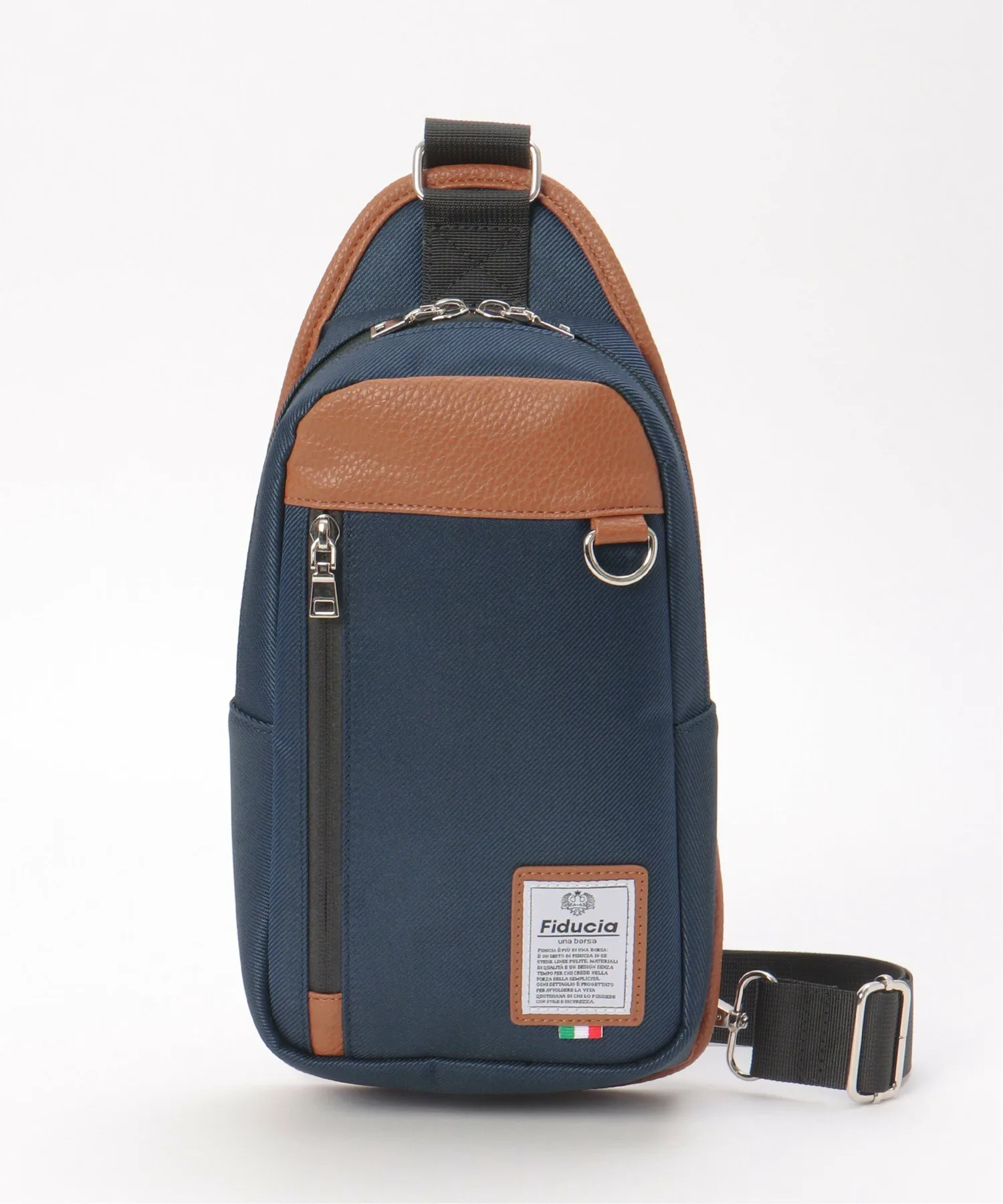 Сумка через плечо с контрастной цветовой гаммой, сочетающей полиэстер и материалы, имитирующие кожу.