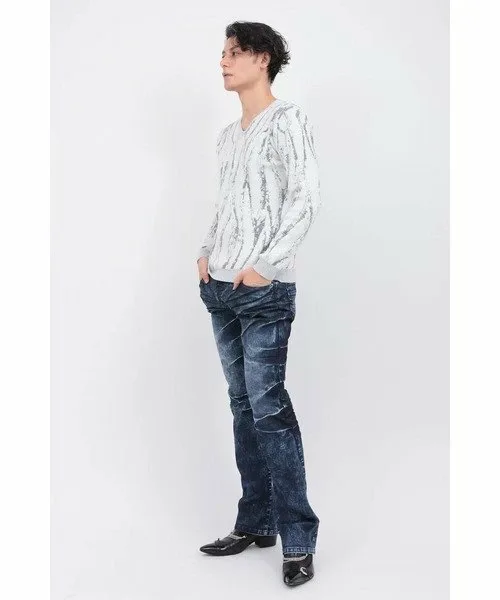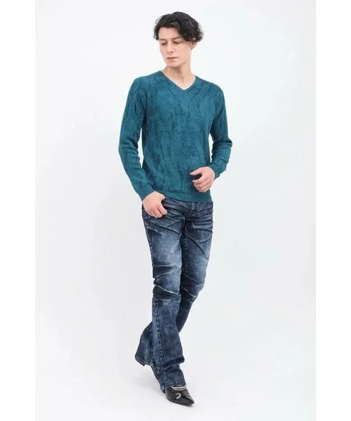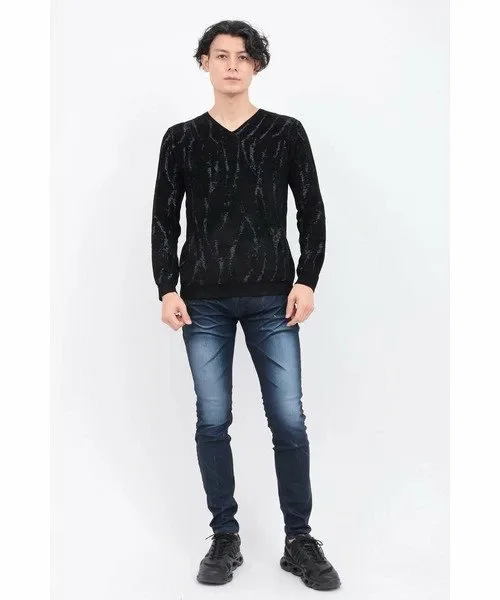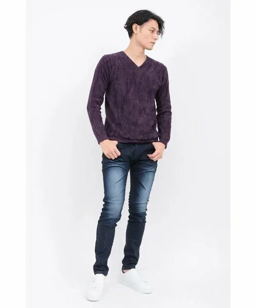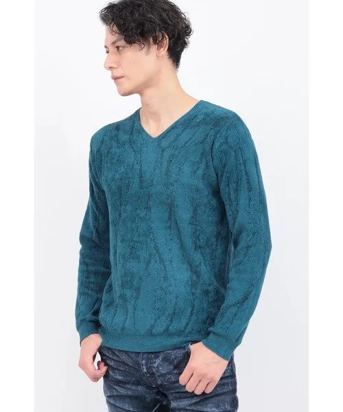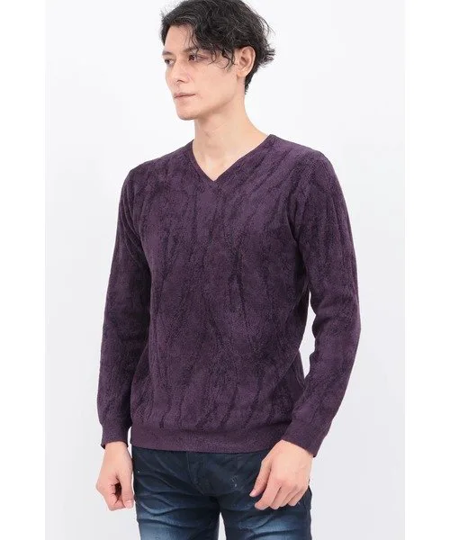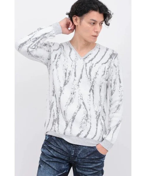 Трикотажное изделие с V-образным вырезом из мохеровой пряжи, узор которого переливается, как пламя. Благодаря гладкой текстуре и превосходной эластичности, оно создает четкий, облегающий силуэт. Само по себе оно выглядит эффектно, а также может носиться как нижний слой, дополняя любой образ.