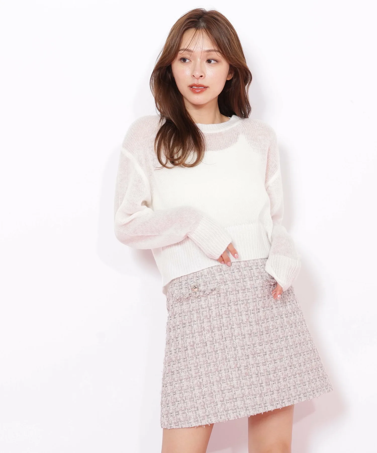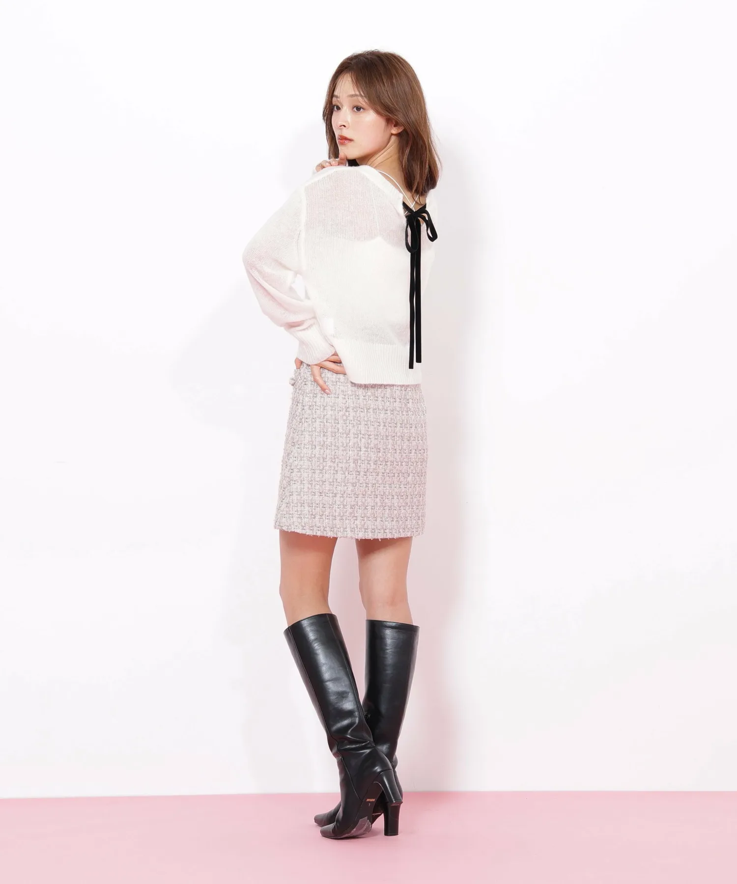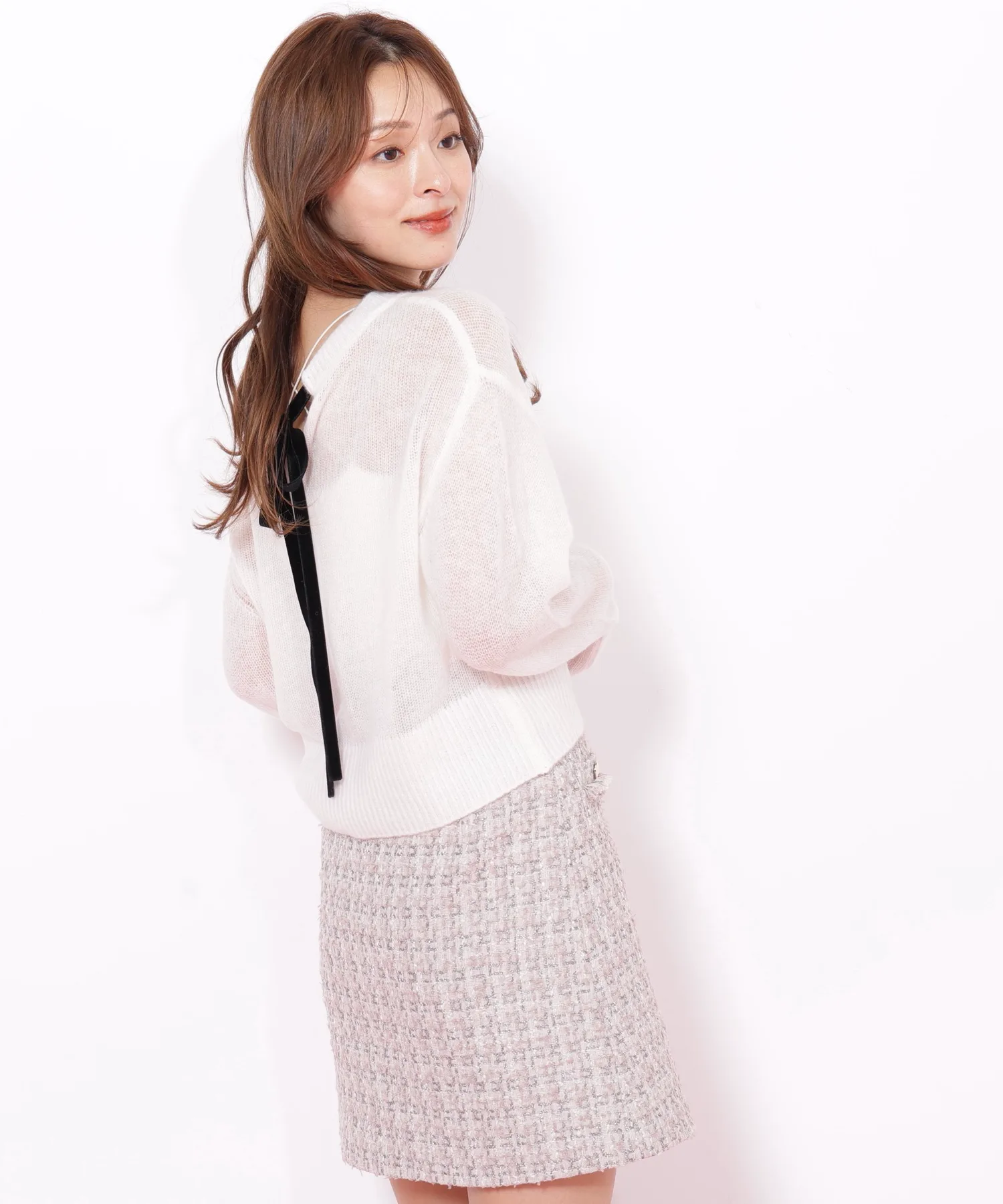 Элегантный короткий трикотажный лиф, сочетающий в себе мягкость трикотажа и слегка полупрозрачную текстуру. Нежная бархатная лента сзади создает милый образ даже сзади. Поскольку материал полупрозрачный, носите его с собственным нижним бельем. Сочетайте его с джинсами для повседневного образа или с юбкой для более женственного. *Цвет может отличаться в зависимости от условий освещения во время фотосъемки.