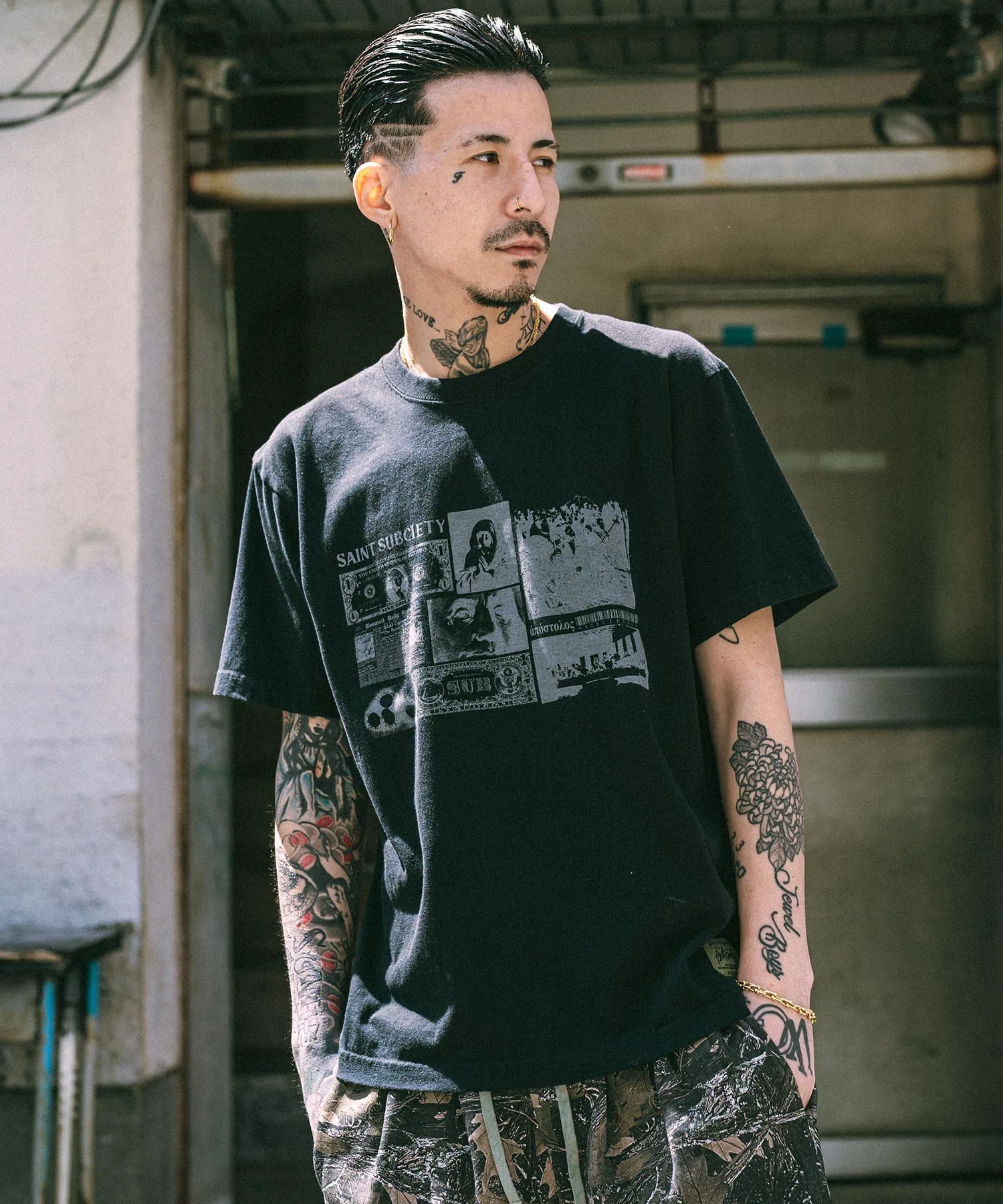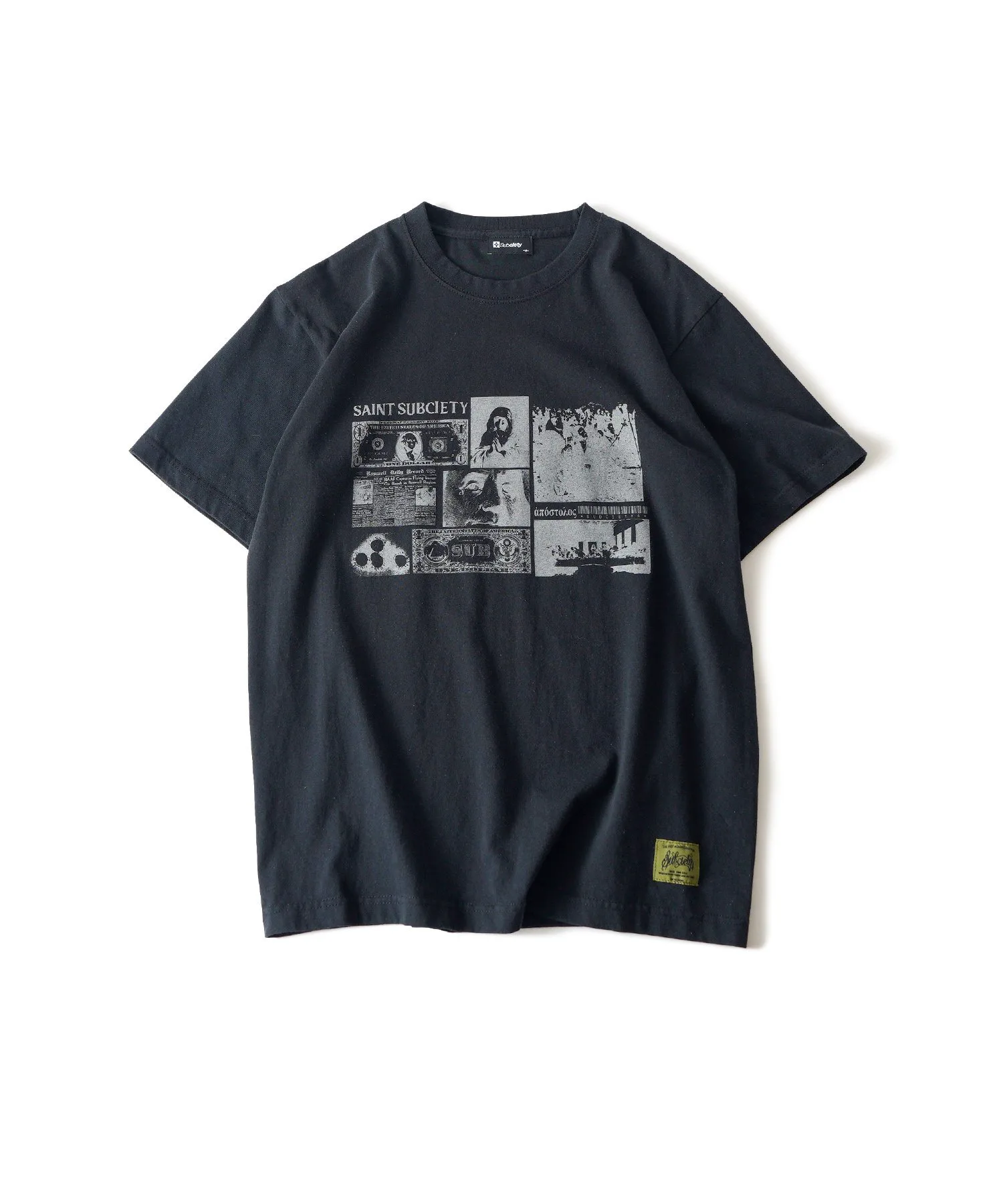 На передней части футболки изображен графический принт с мотивами теорий заговора и городских легенд.