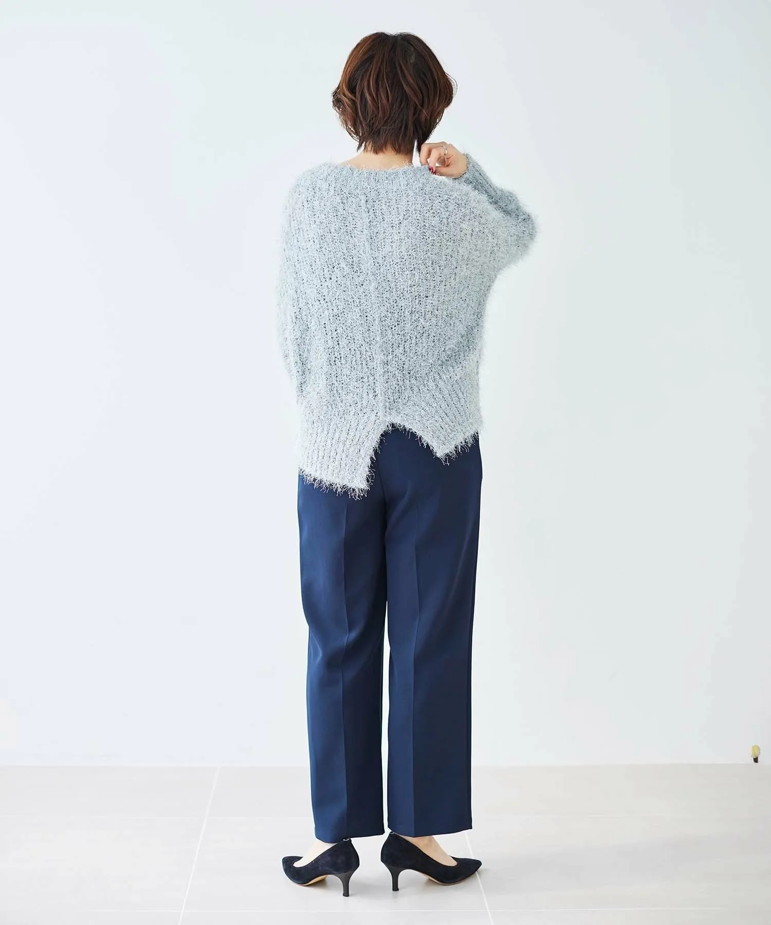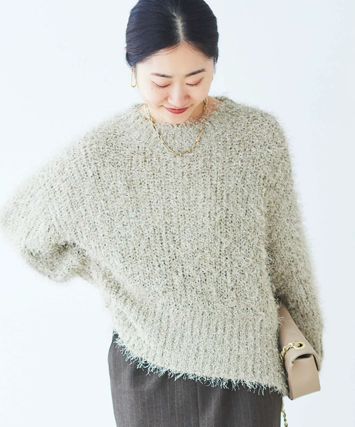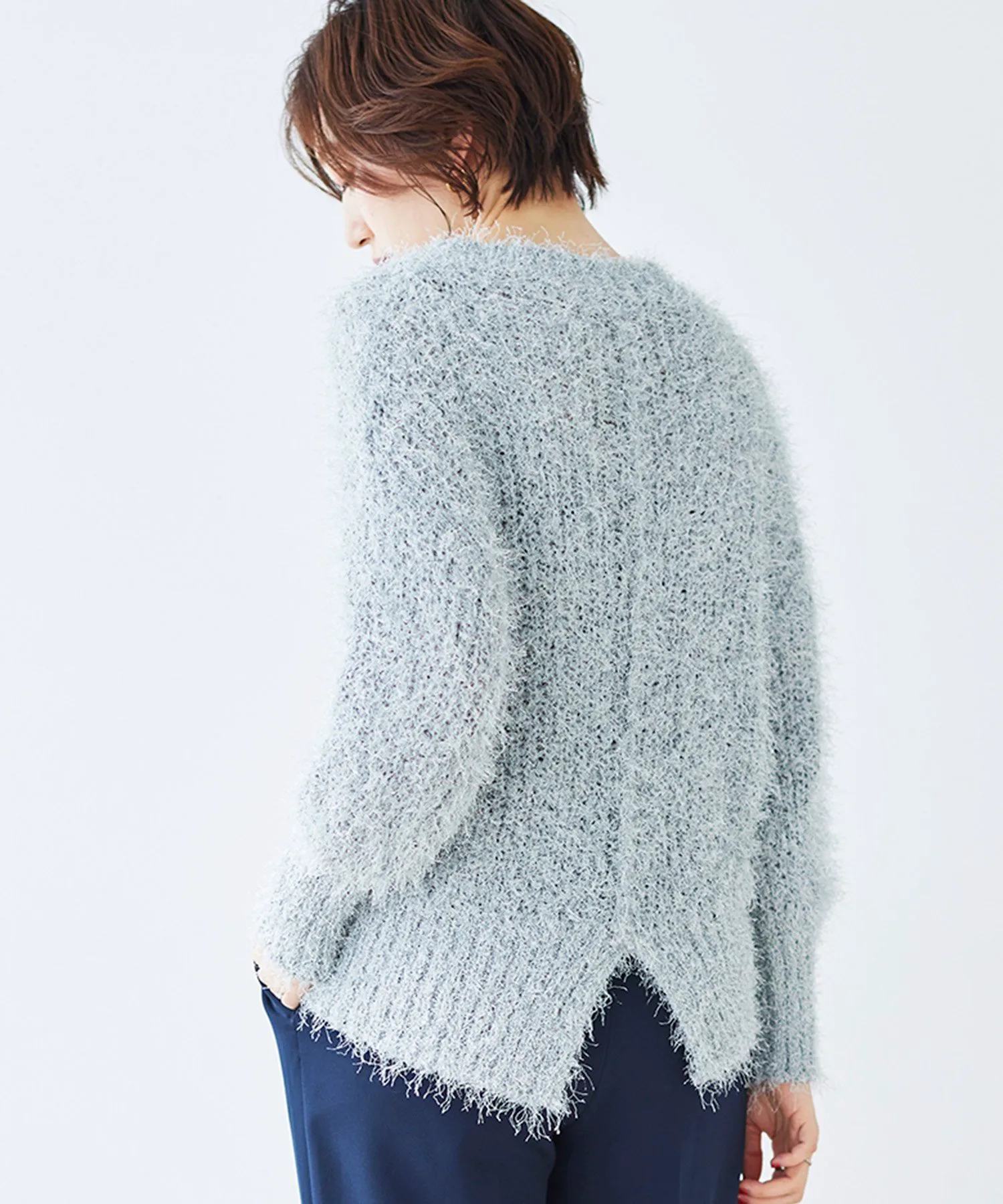 Этот свободный, мелкий трикотаж в рубчик выполнен из модного в этом году блестящего материала. Мягкая, ворсистая пряжа уменьшает зуд. Ключевые особенности: Несмотря на то, что он изготовлен из блестящего, пушистого материала, он также мягкий на ощупь. Свободный, объемный силуэт создает изысканный образ. Рекомендуемые сочетания: Разрез сзади позволяет заправить футболку с длинными рукавами или создать многослойный образ. Мы рекомендуем сочетать его с топом, топом с высоким воротником или рубашкой. Он хорошо сочетается с широким спектром низов, включая узкие юбки и джинсы. Отзыв сотрудника: Сотрудник А: 40 лет, рост 152 см, прямое телосложение, обычно размер 36-38, на мне размер 38. Посадка: Свободная. Материал: Мягкий и удобный, практически не вызывает зуда. Комфорт при ношении: Свободный крой и длинная длина, поэтому не подчеркивает линии фигуры. Блестки не бросаются в глаза, что позволяет легко сочетать вещи с другими элементами гардероба.