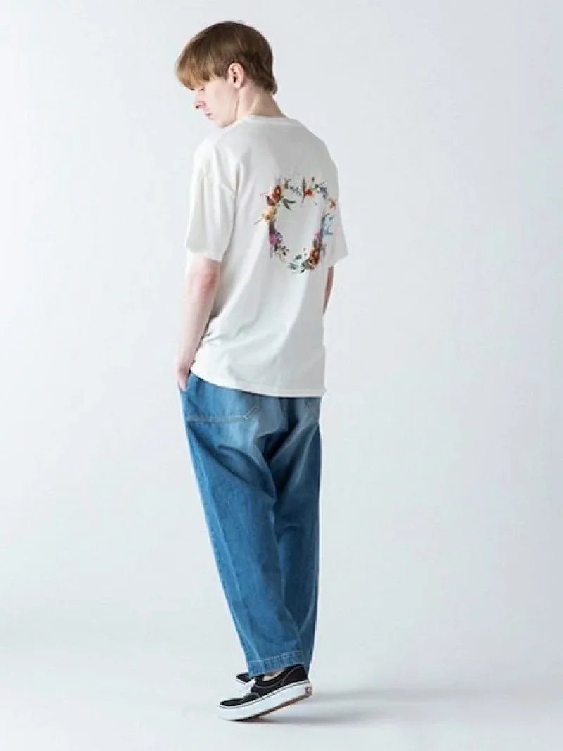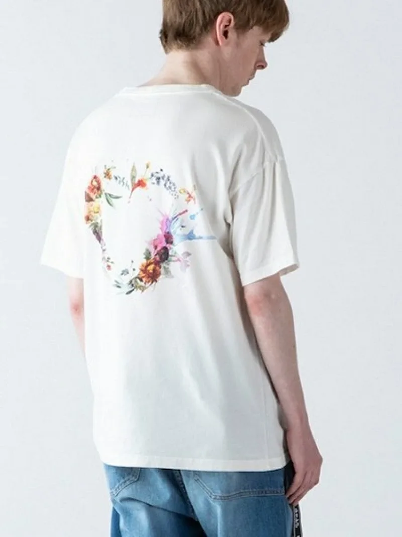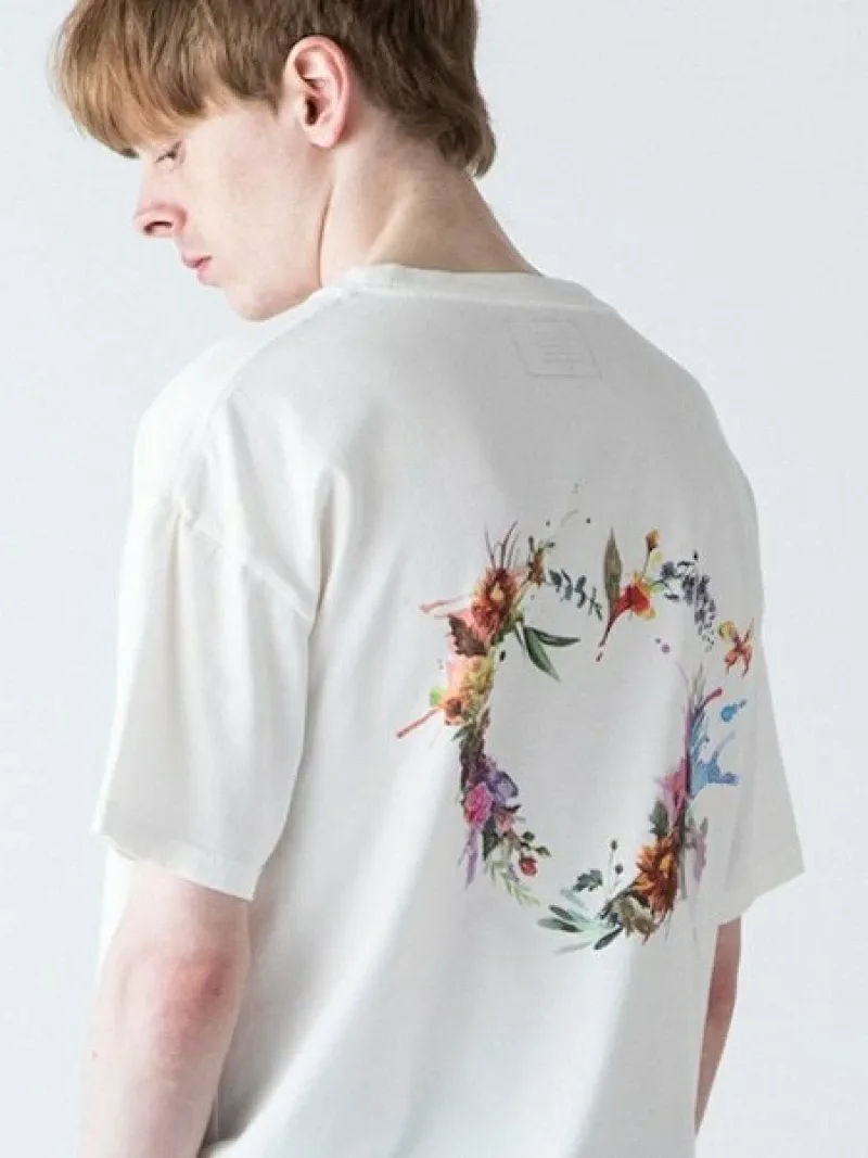 Ботанический дизайн: Футболка изготовлена из ткани, произведенной и сшитой в Японии, а затем окрашена с использованием техники ботанического окрашивания, в которой используются натуральные красители, извлеченные из натуральных растений. Мягкие цвета и текстура, уникальные для натуральных материалов, привлекательны. Силуэт имеет базовый размер и подходит как мужчинам, так и женщинам.