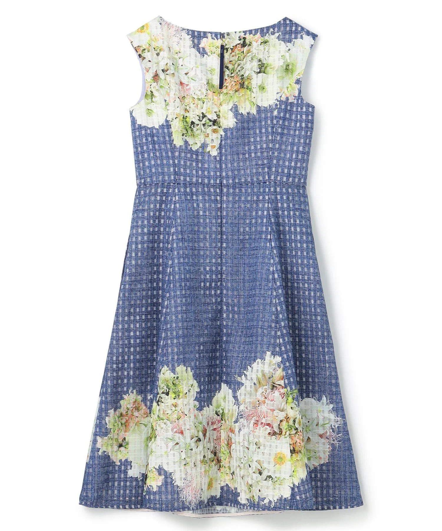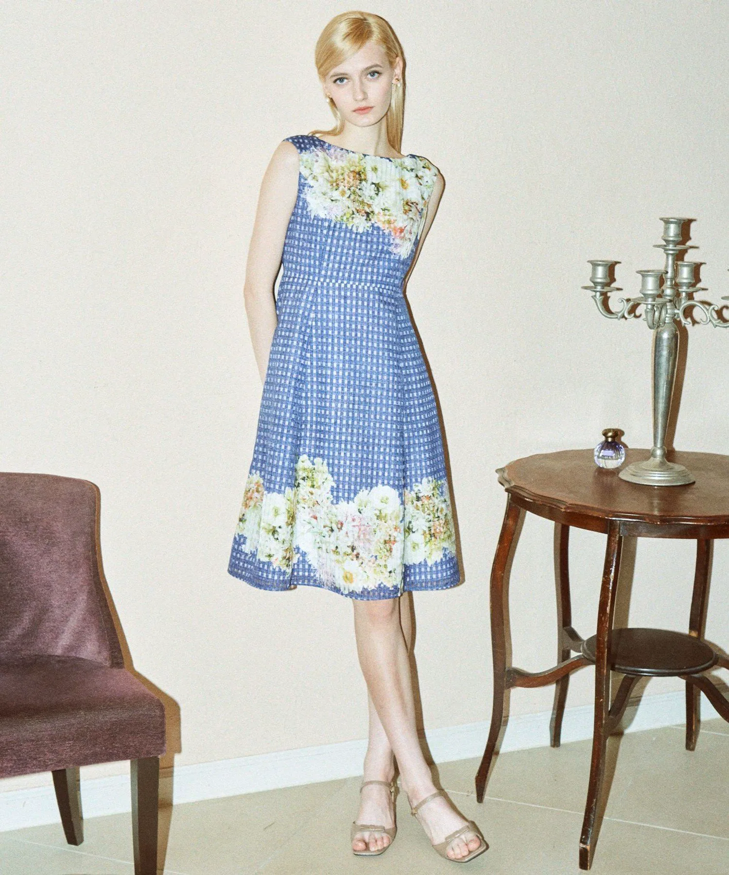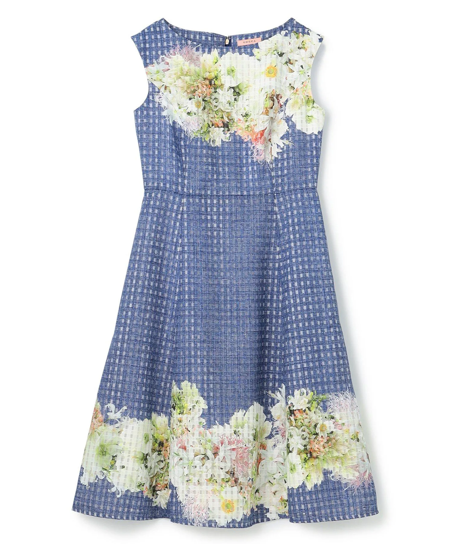 Прозрачная клетчатая ткань с принтом, напоминающим джинсовую ткань, и смелым принтом в виде букета создает великолепный образ.
