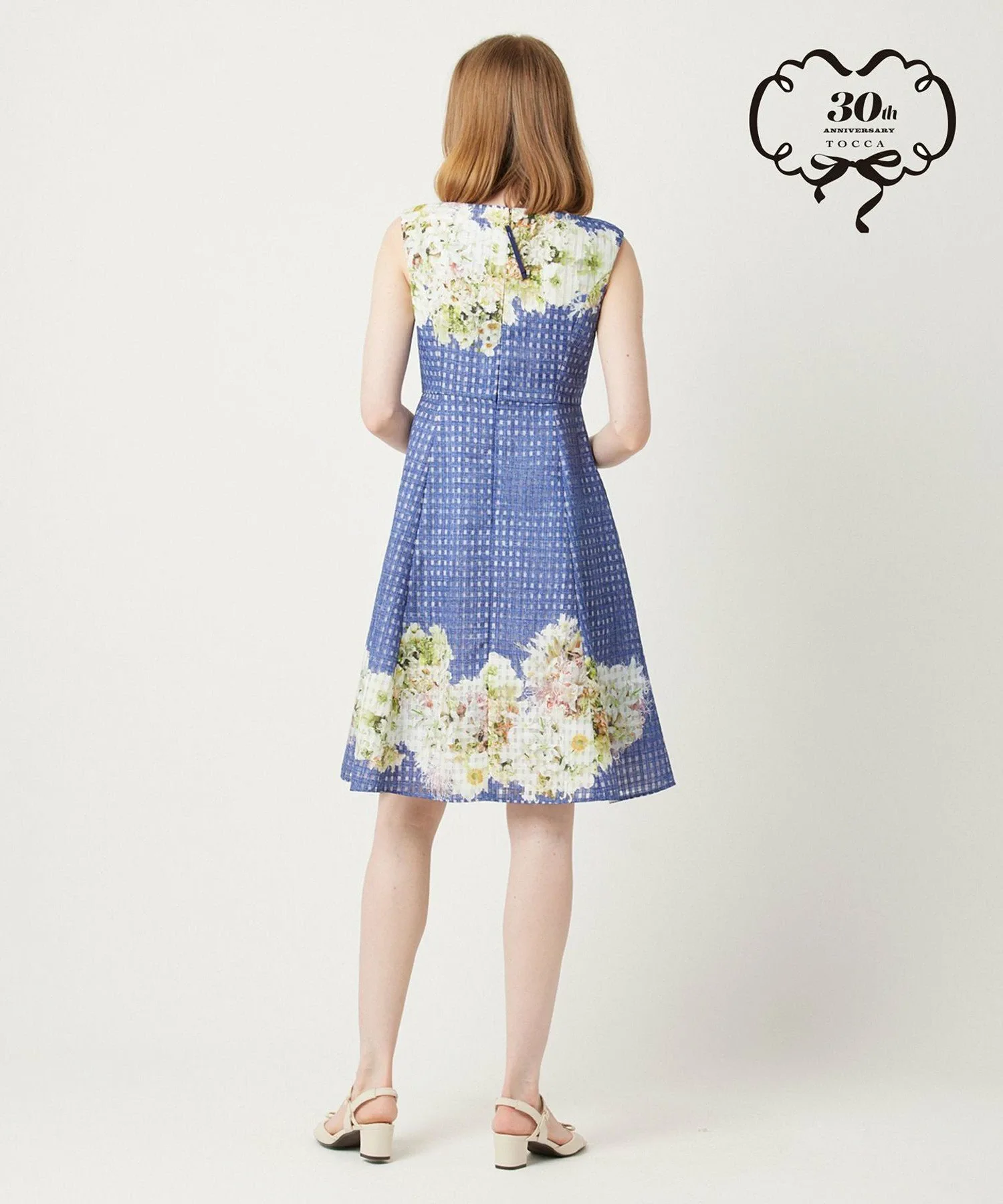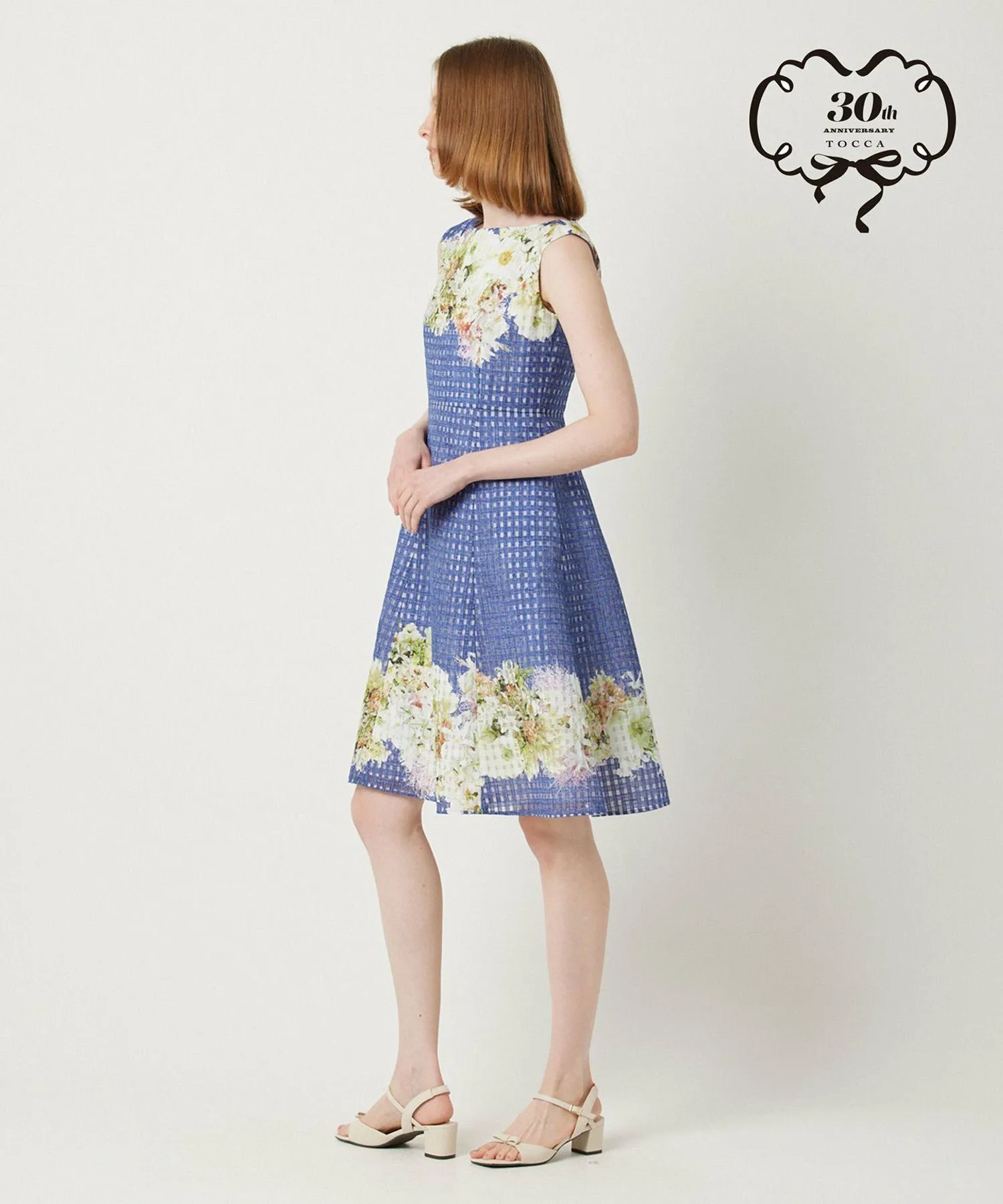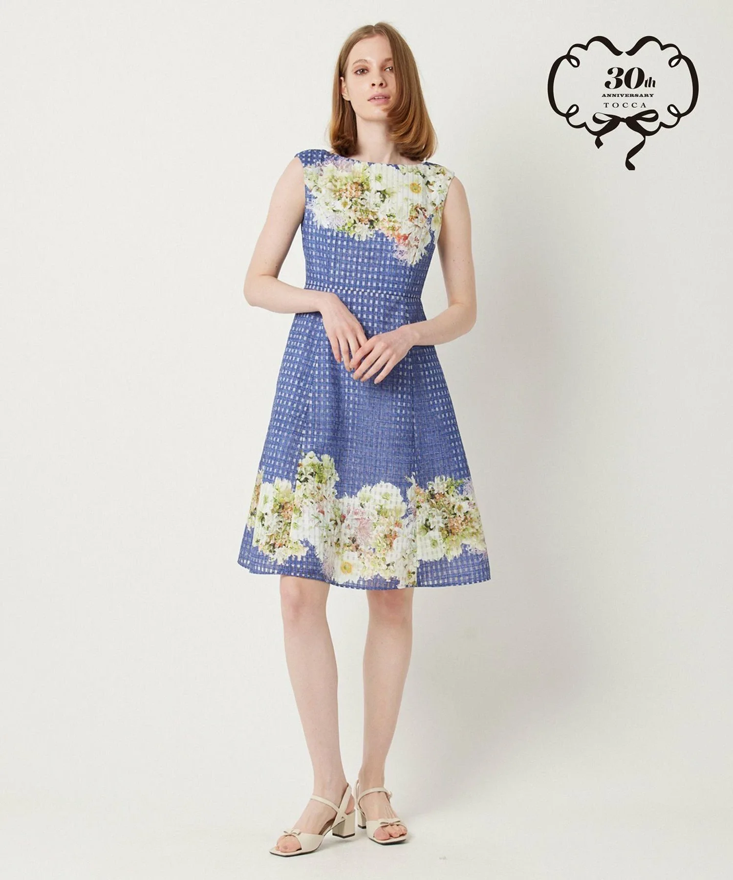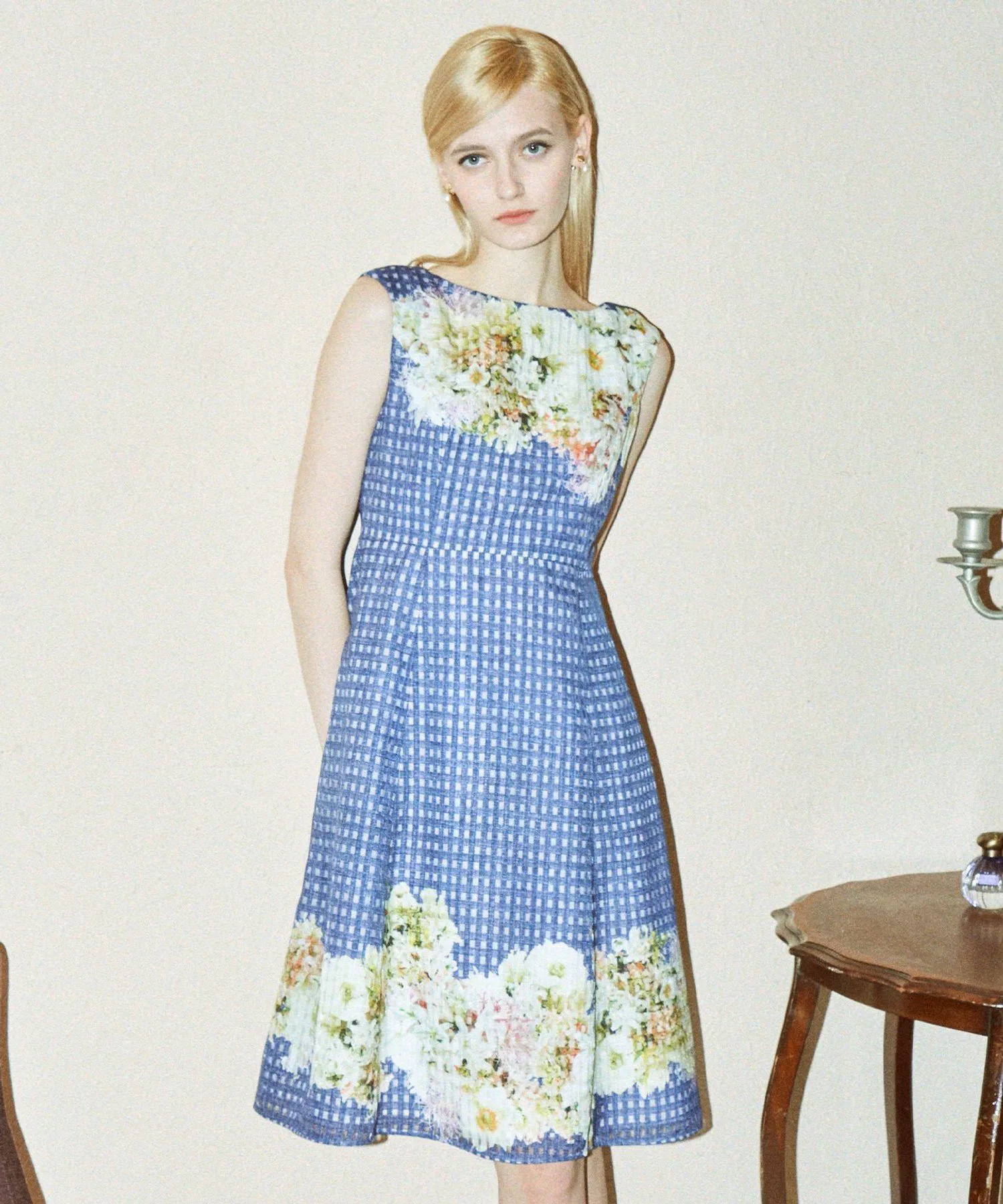 Прозрачная клетчатая ткань с принтом, напоминающим джинсовую ткань, и смелым принтом в виде букета создает великолепный образ.