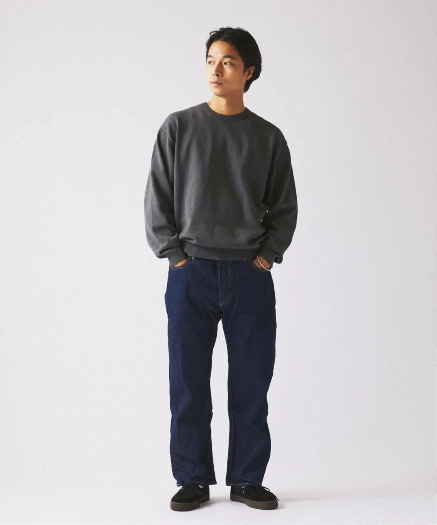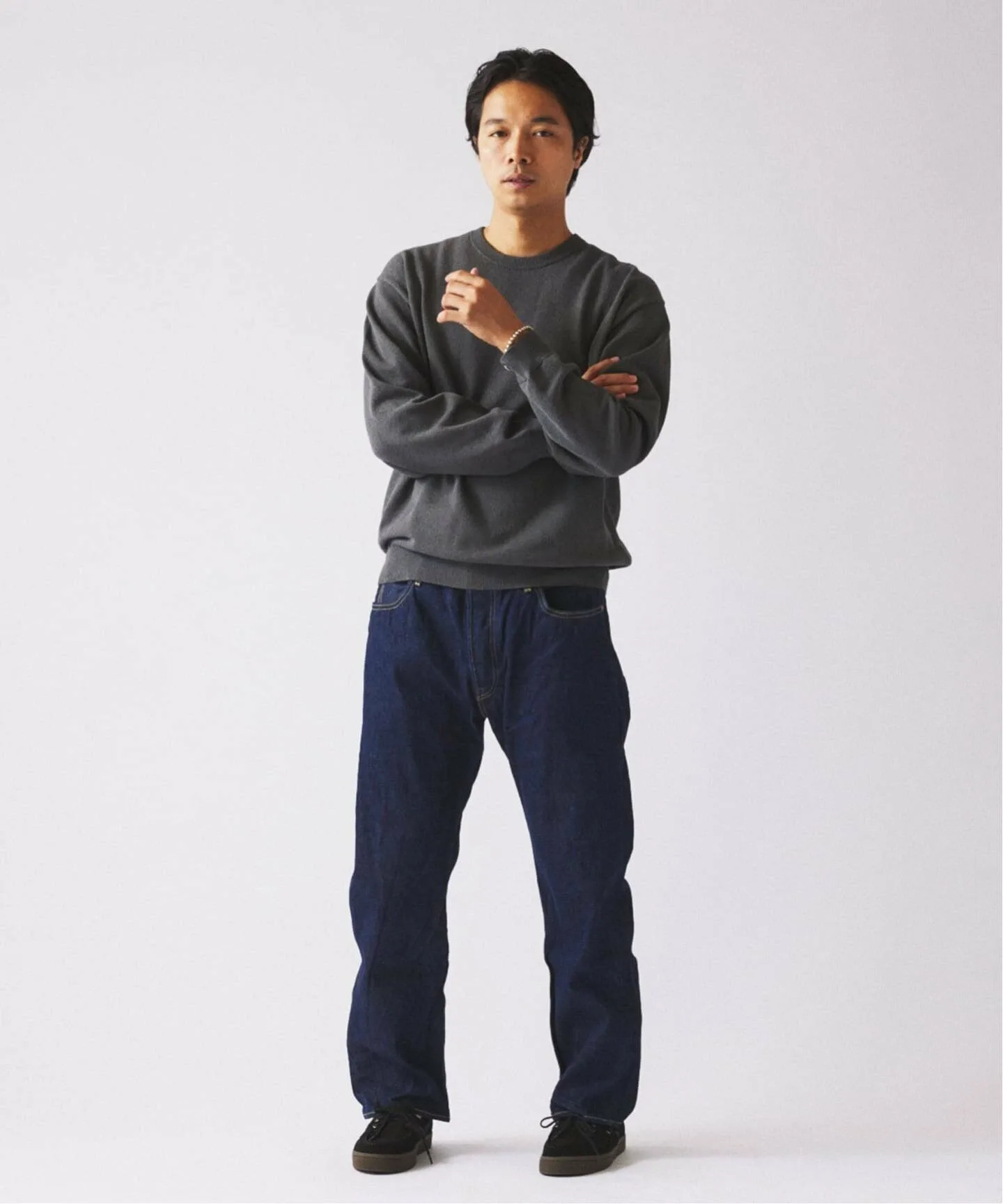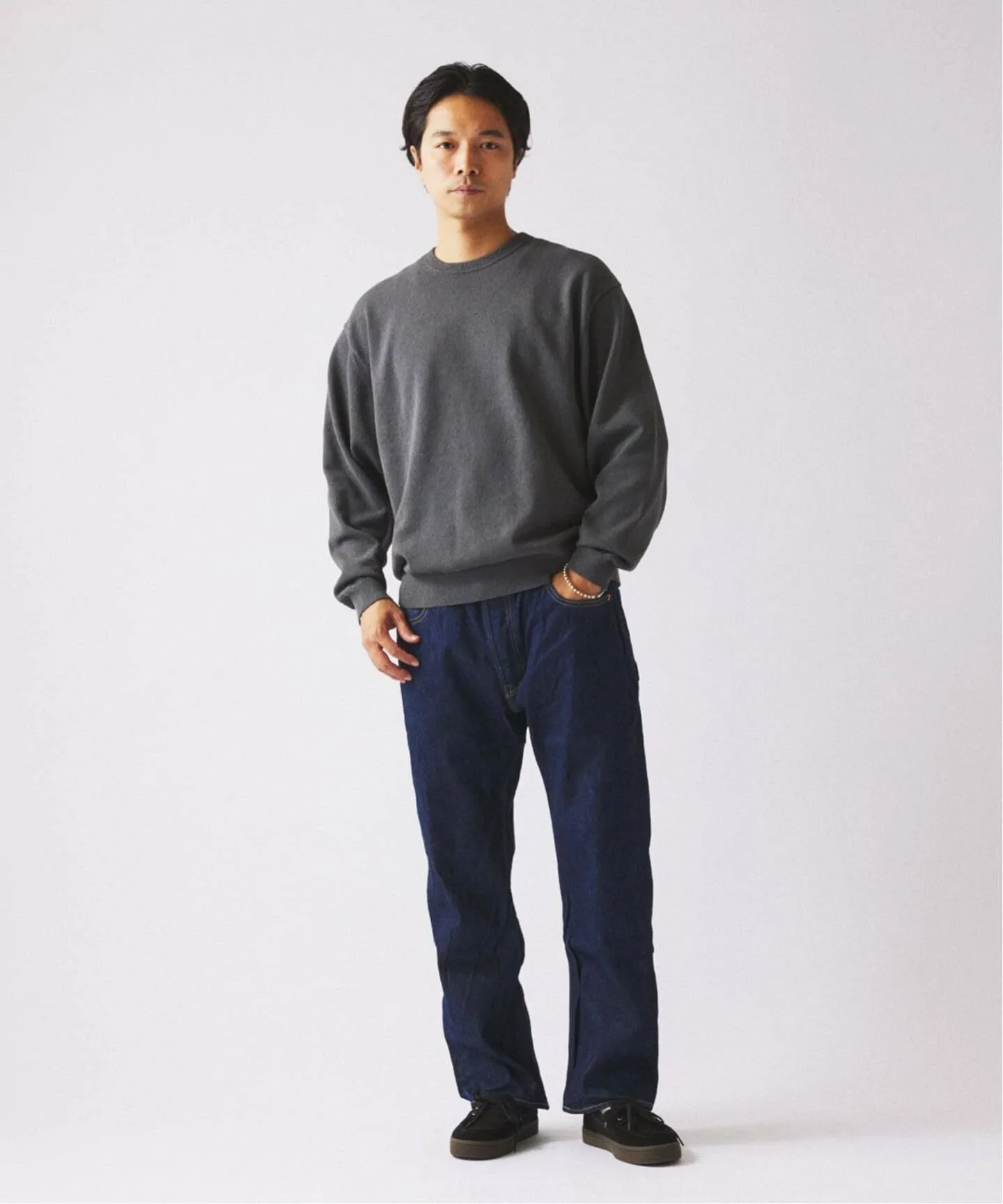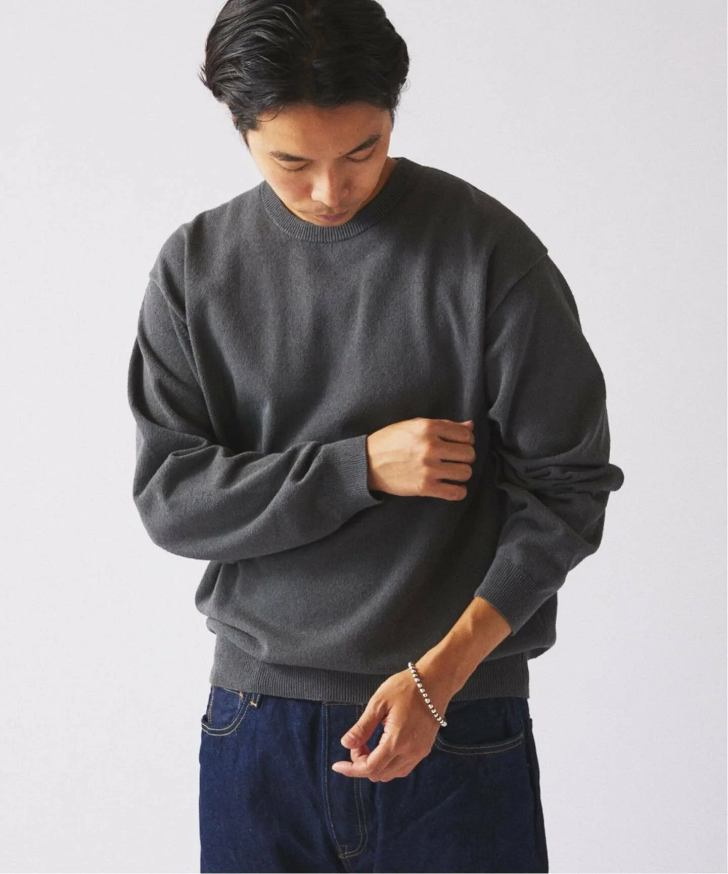 Главная особенность этого вязаного изделия — «хлопково-нейлоновая букле-пряжа», характеризующаяся мелкими петлями на поверхности. Это особый вид декоративной пряжи, созданной с использованием специальных технологий прядения, сочетающих мягкость хлопка с плотной текстурой нейлона. Вязание на высокой 12-й нити (тонкое и плотное плетение) поднимает непринужденность букле на элегантный уровень. Пряжа имеет пушистый, объемный и выразительный вид, сохраняя при этом утонченность. Сочетайте её с брюками для элегантного образа или с джинсами для более изысканного. С приближением зимы попробуйте носить её под шерстяным пальто или кожаной курткой, чтобы насладиться контрастом разных материалов. Это надежная вещь, которая ненавязчиво добавляет глубины и нюансов вашим повседневным нарядам.