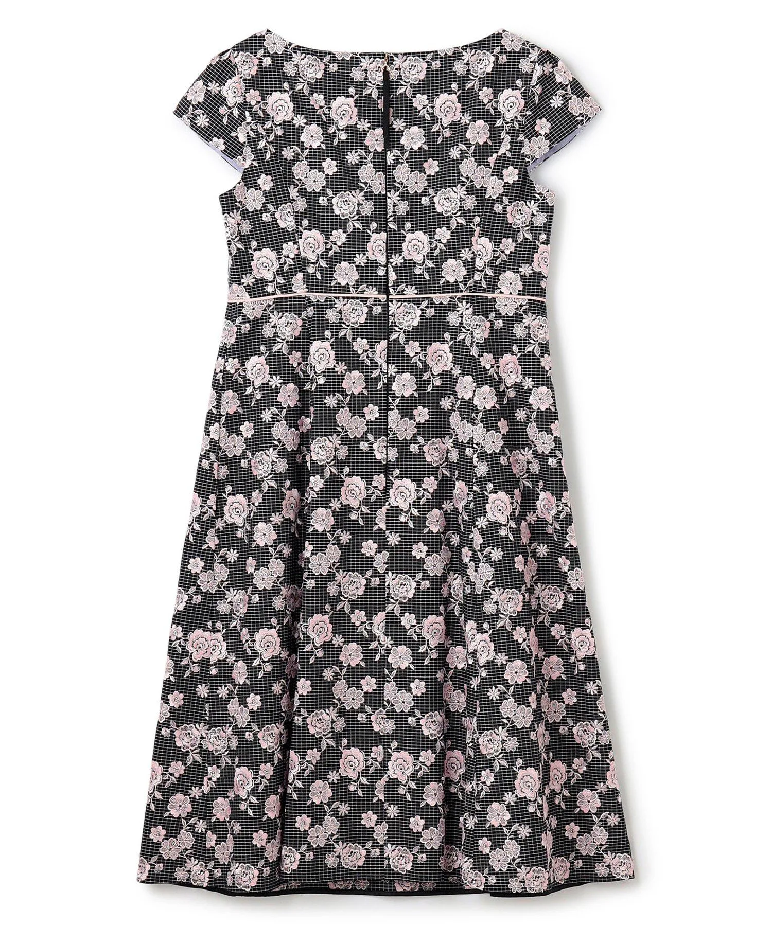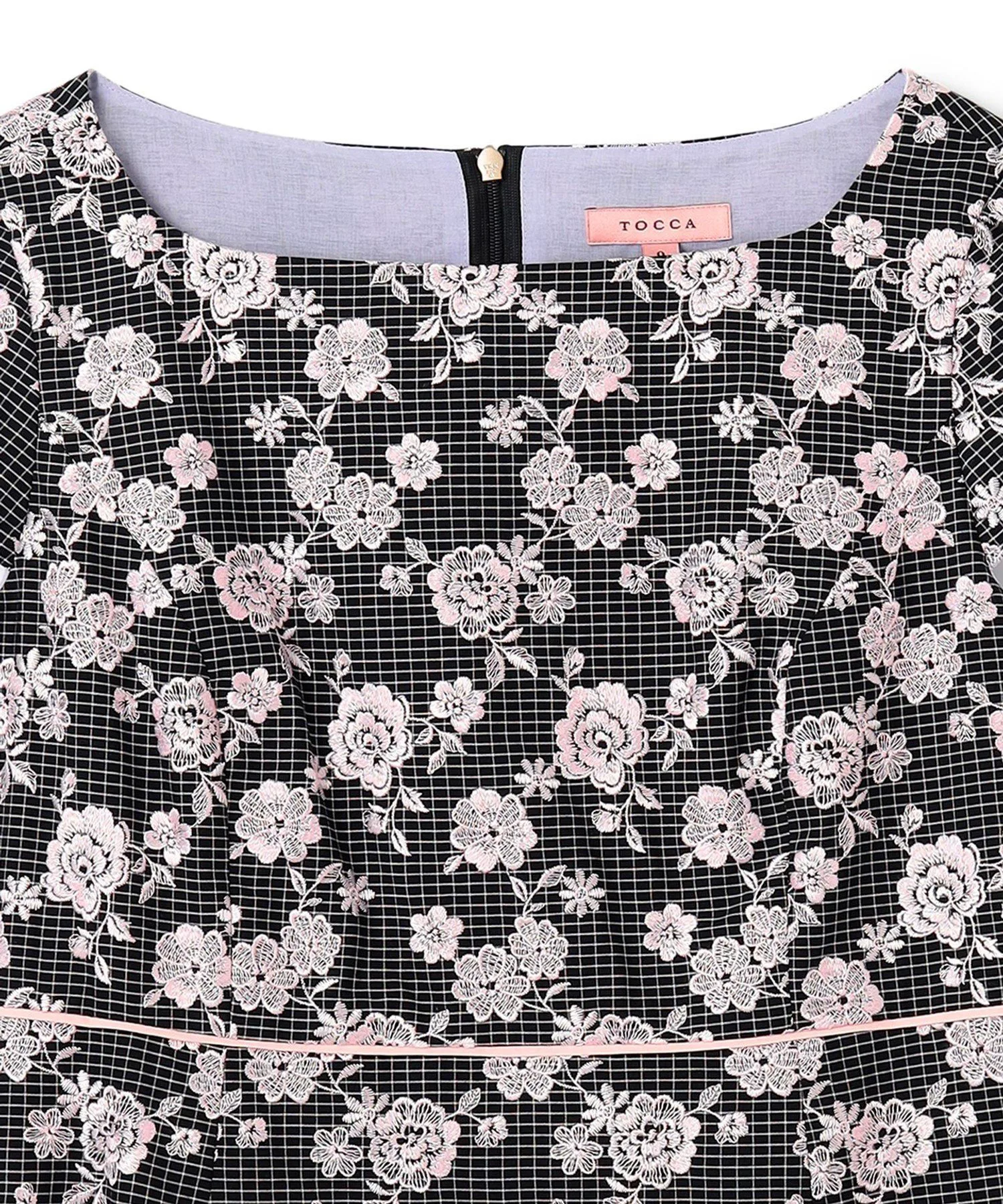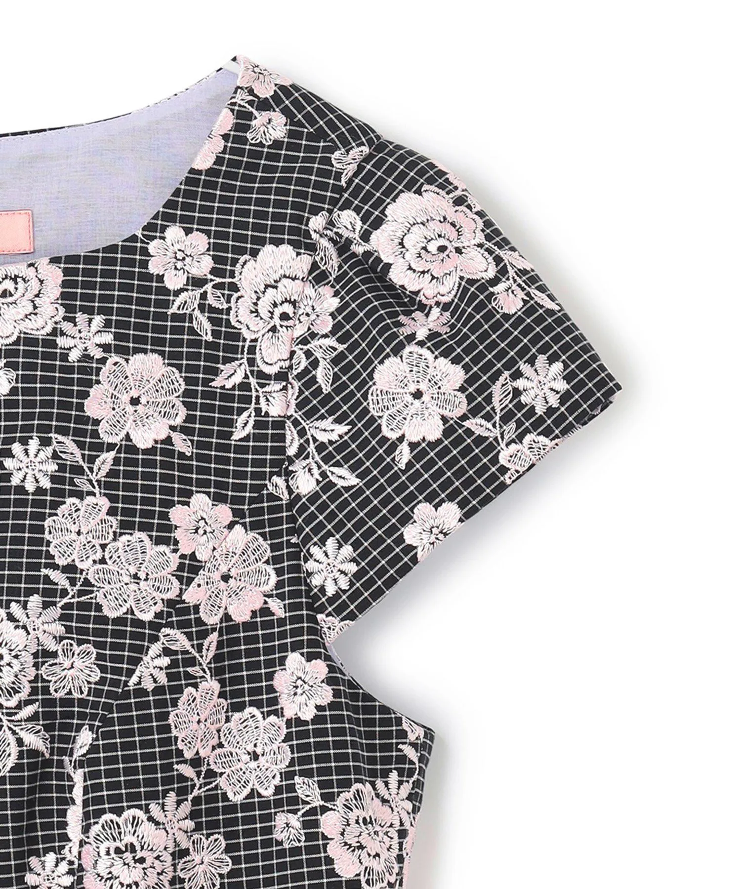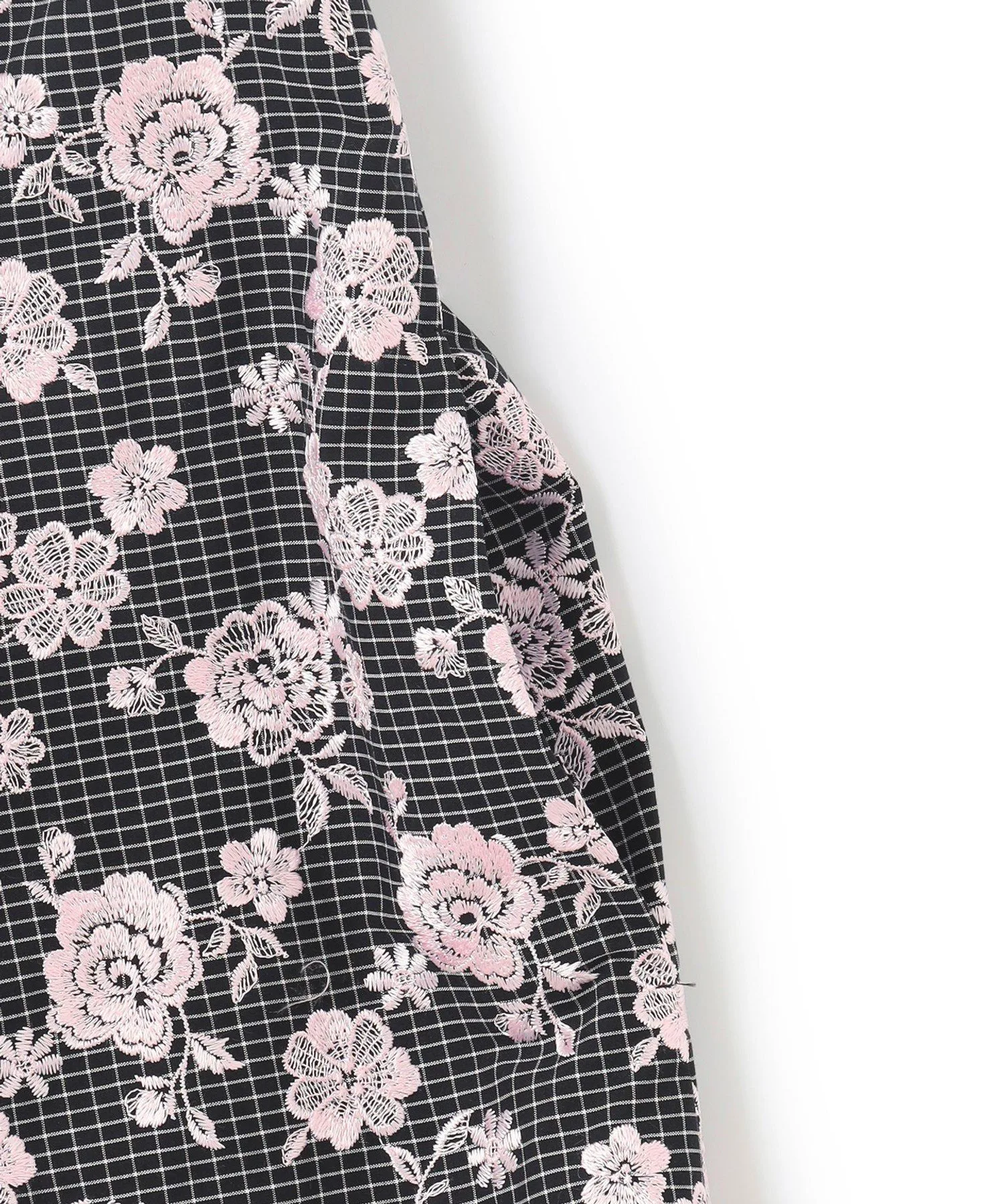 Платье украшено однотонной цветочной вышивкой на фоне, который варьируется в зависимости от цвета: цвет 701 (белый) имеет узор в горошек кремового цвета, а цвет 705 (черный) — черный клетчатый узор. Щедрое количество замысловатой вышивки создает дизайн, сочетающий элегантность и гламур.