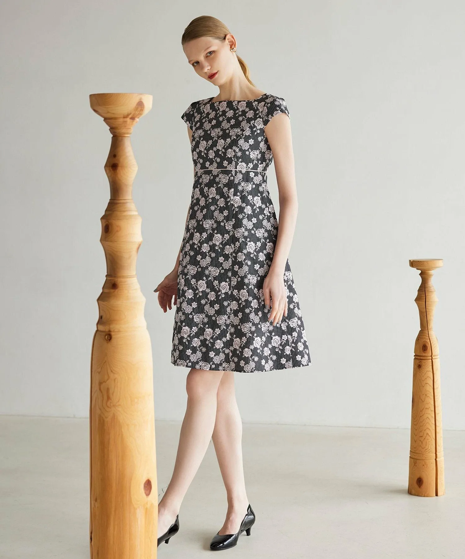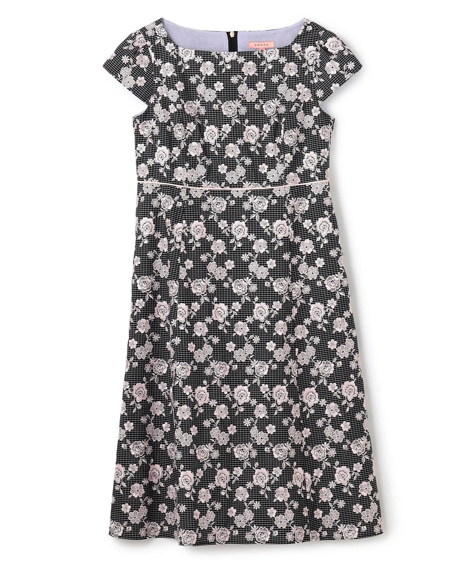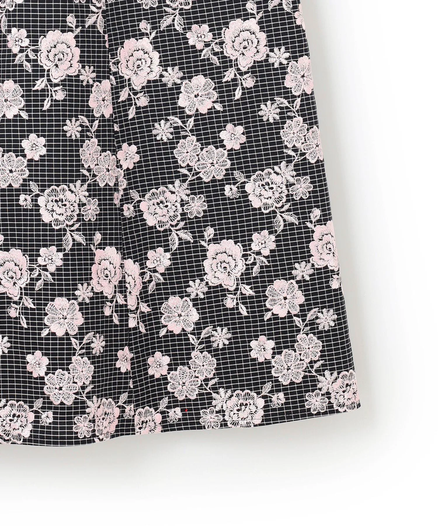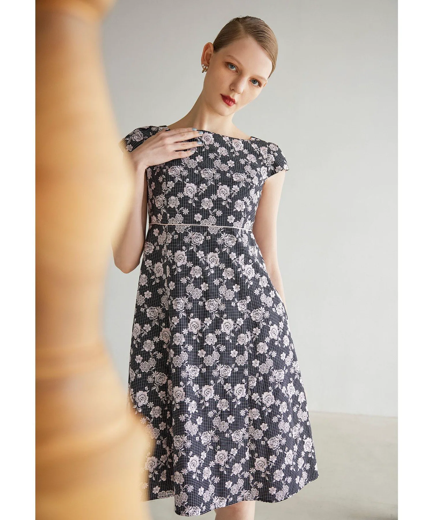 Платье украшено однотонной цветочной вышивкой на фоне, который варьируется в зависимости от цвета: цвет 701 (белый) имеет узор в горошек кремового цвета, а цвет 705 (черный) — черный клетчатый узор. Щедрое количество замысловатой вышивки создает дизайн, сочетающий элегантность и гламур.