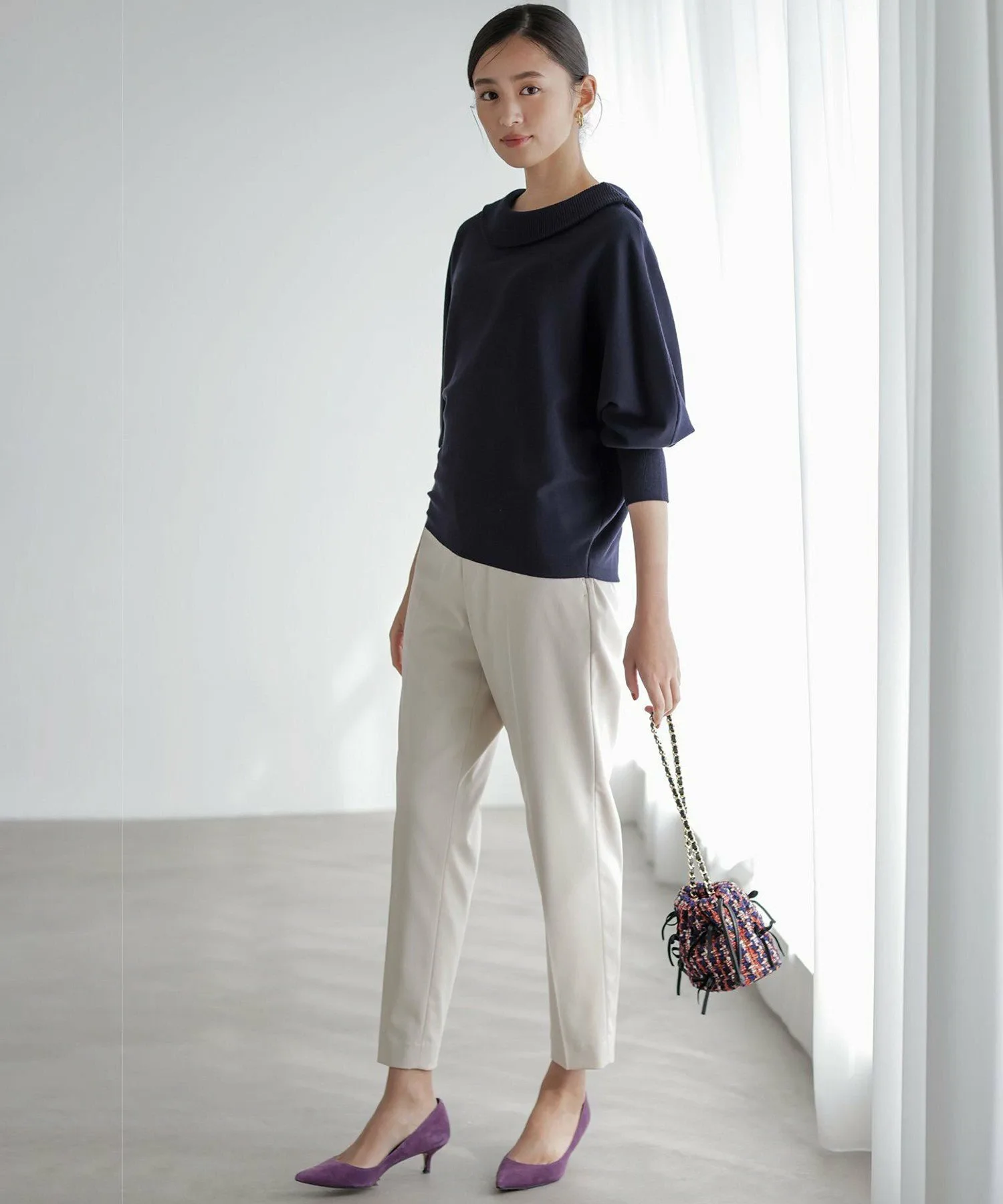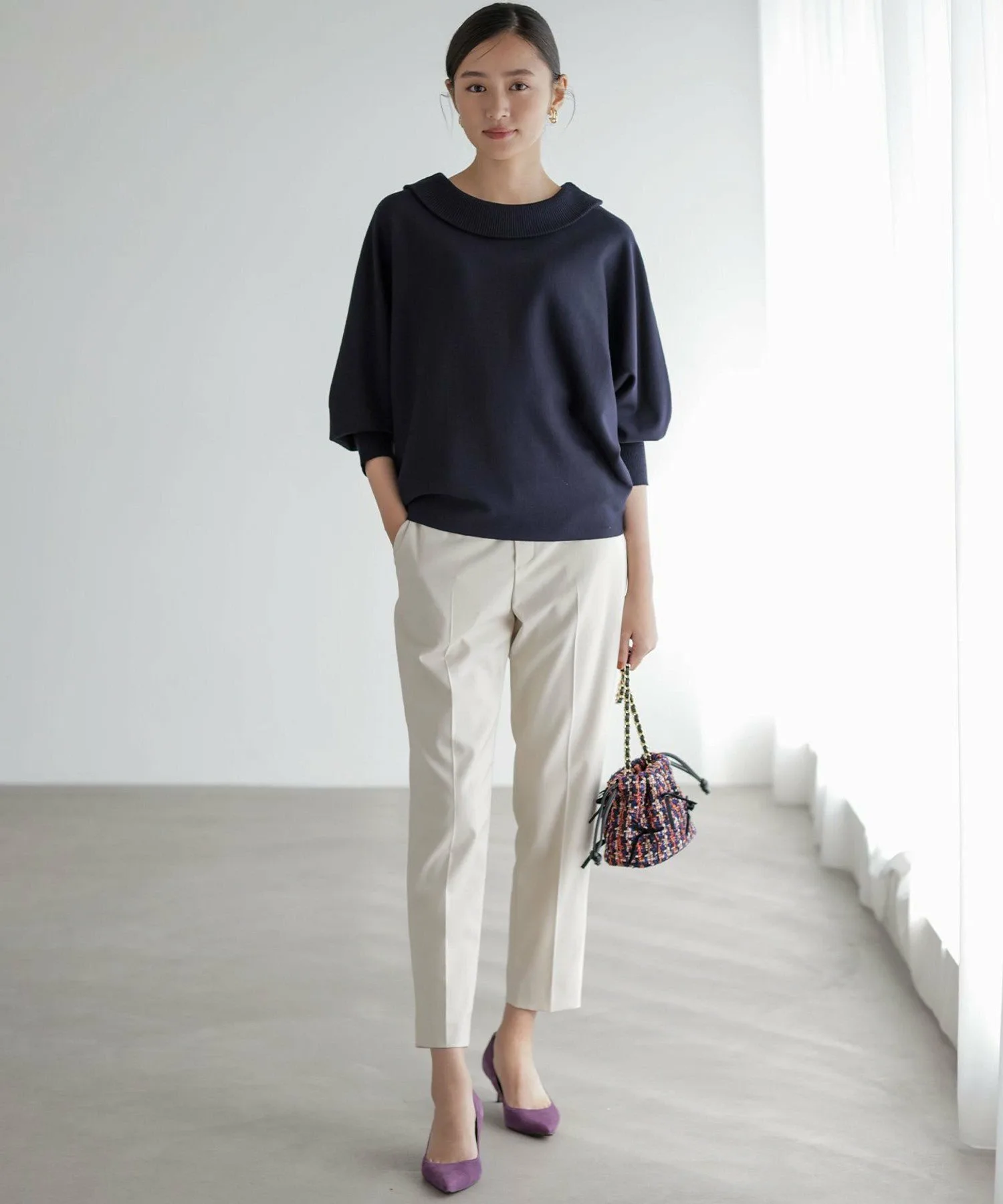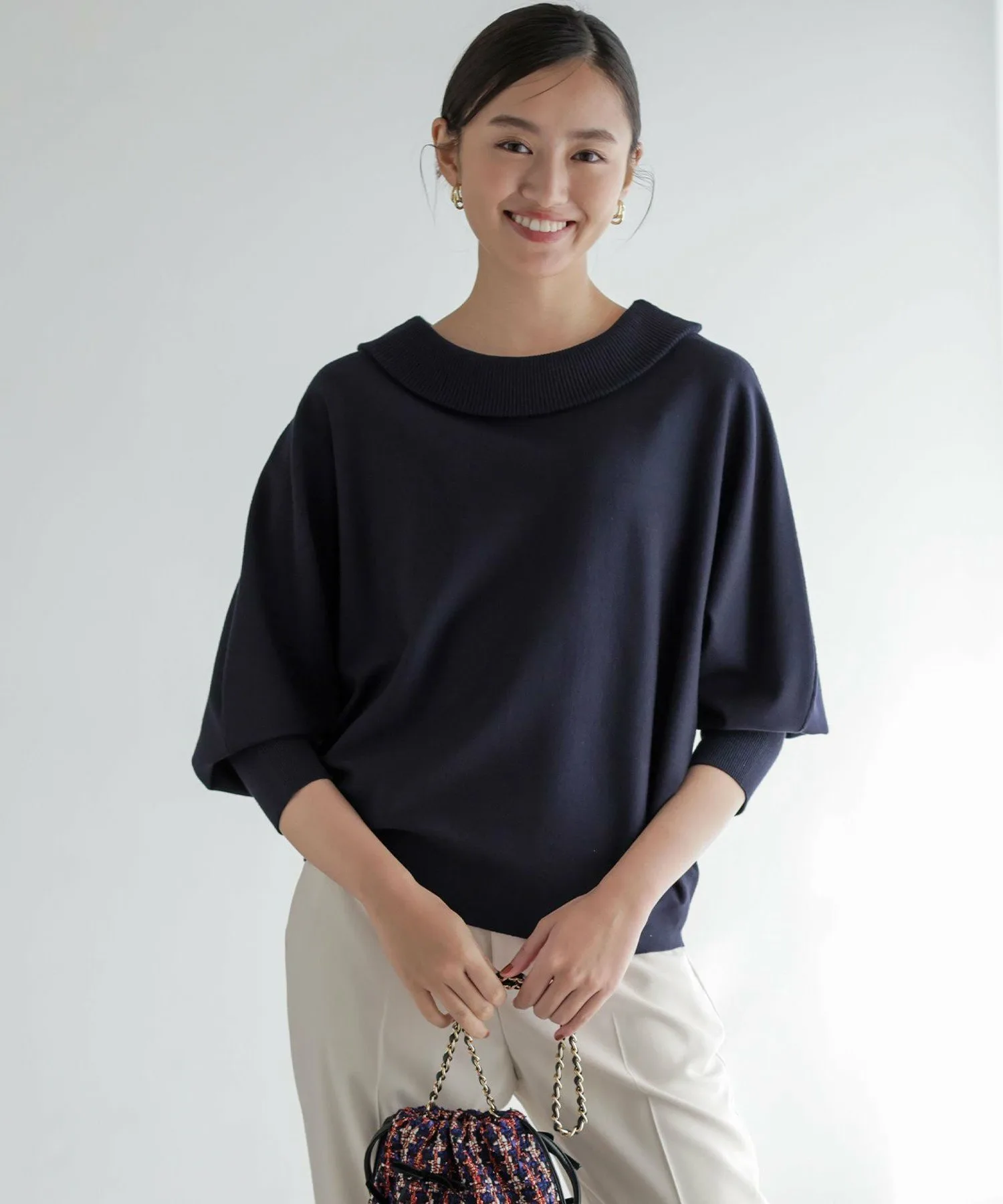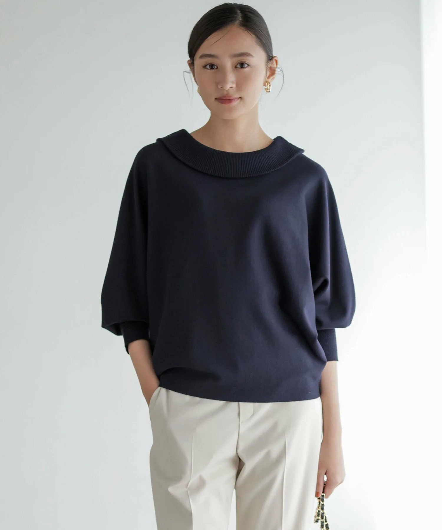 Дизайн・Трикотажный пуловер с оптимальным объемом и открытыми плечами. ・Можно носить как спереди, так и сзади, в любом случае он будет выглядеть безупречно. ・Обладает женственной мягкостью и эластичностью, но при этом имеет свободный силуэт, не подчеркивающий линии тела. ・Низ плотно прилегает и отлично смотрится, если заправить его в брюки или юбку. ・Универсальный трикотаж, который можно сочетать с самыми разными образами, от повседневных до нарядных.