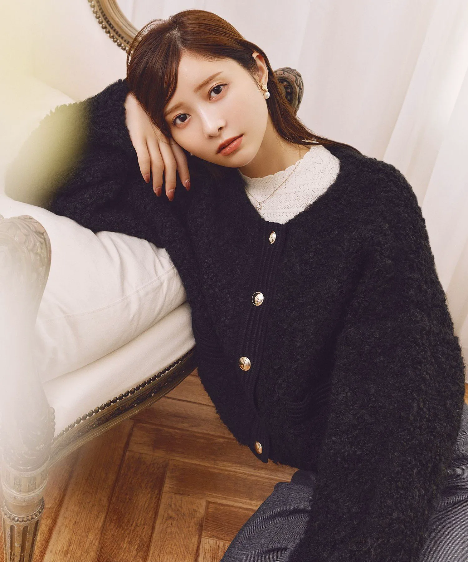 Эта вязаная верхняя одежда имеет очаровательную текстуру, напоминающую шерсть пуделя. Тщательно связанная из пушистой петлевой пряжи, она излучает тепло как внешне, так и на ощупь, что делает ее идеальным сезонным предметом гардероба. Ее мягкая текстура, настолько мягкая, что вам захочется прикоснуться к ней щекой, добавит нежности вашим осенним и зимним нарядам. Она не только очаровательна, но и отлично сохраняет тепло, обеспечивая одновременно легкость, комфорт и тепло. Ее практичность делает ее удобной для ношения даже в холодное время года. Кроме того, едва заметное мерцание золотых пуговиц спереди добавляет нотку классической элегантности. Ее очарование подчеркнуто ноткой элегантности, создавая баланс, который не слишком приторный, что делает ее идеальной для утонченных женщин. Сочетайте ее с платьем или брюками с высокой талией для женственного, гармоничного образа. Идеально подходит для повседневной носки, а также отлично подойдет для неформальных прогулок или особых случаев. Эта вязаная верхняя одежда рекомендуется к этому сезону.