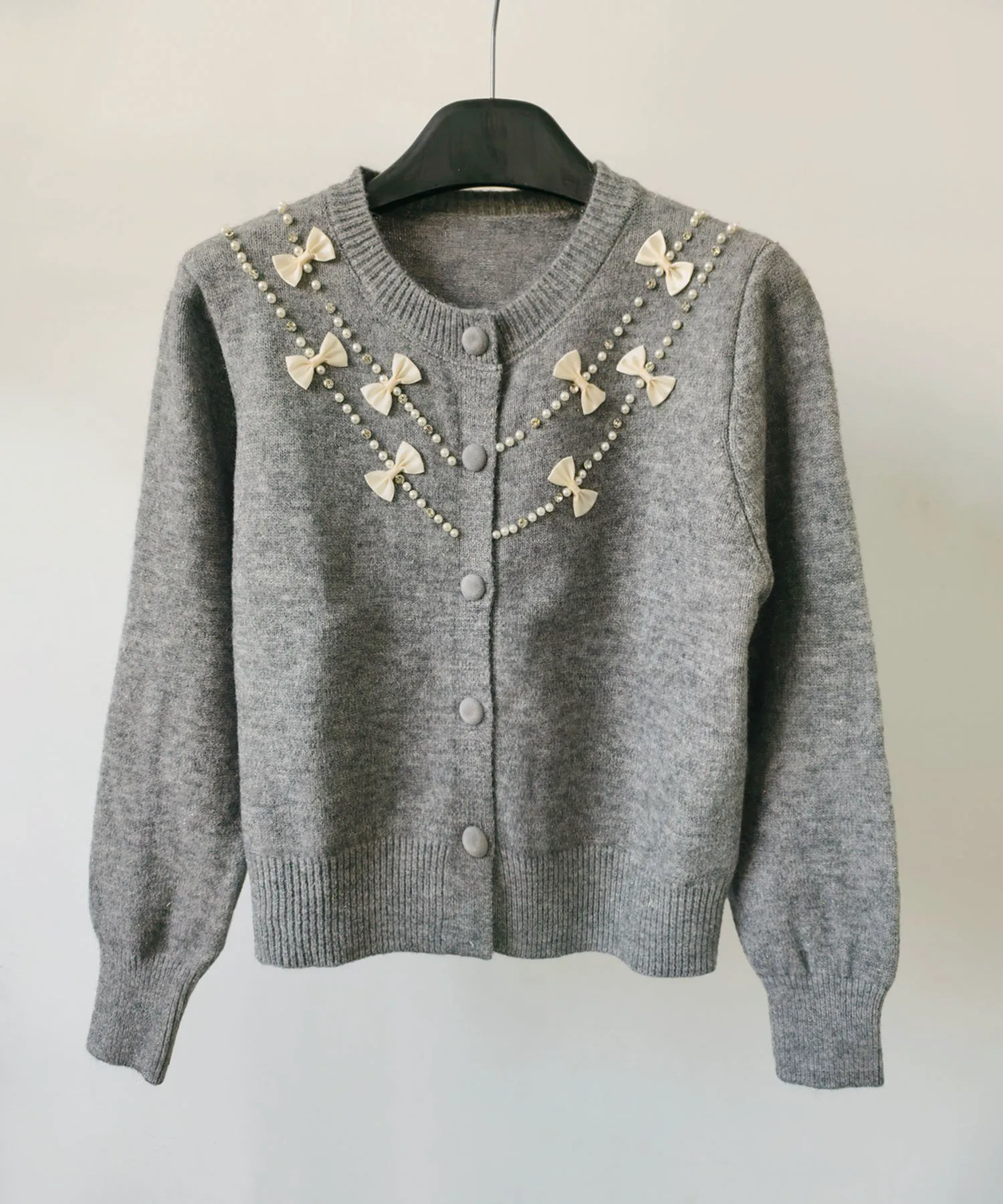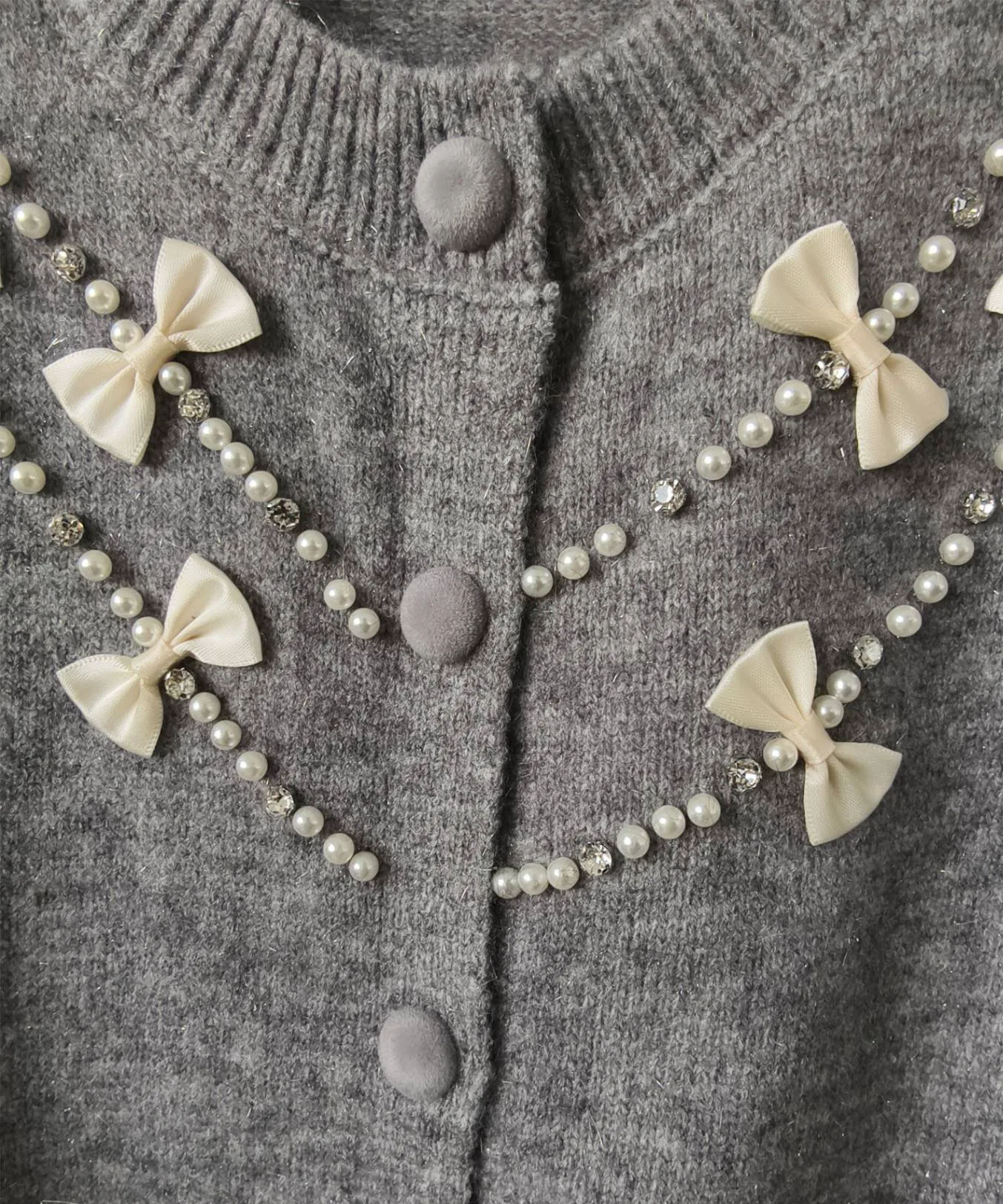 Великолепный кардиган, щедро украшенный жемчугом и лентами.