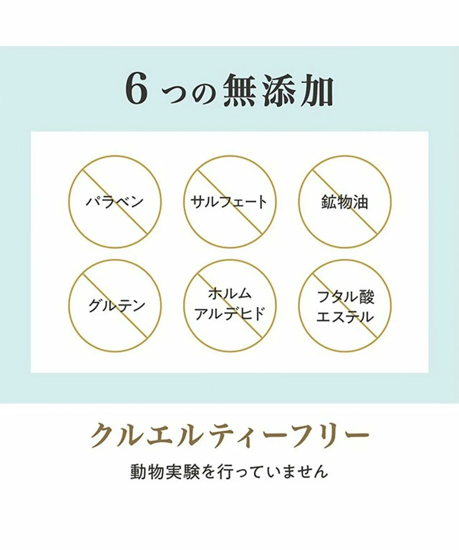 Характеристики ・Не содержит 6 добавок (парабены, сульфаты, минеральное масло, глютен, формальдегид, фталаты)・Не тестируется на животных