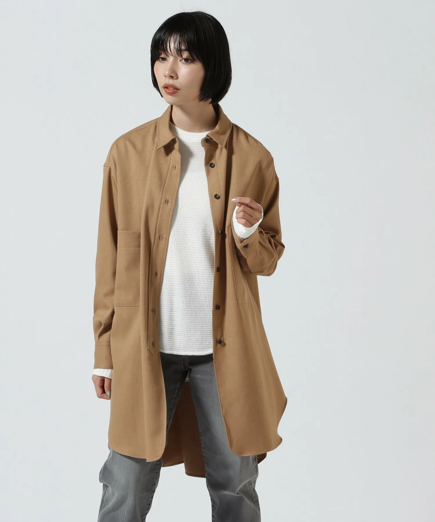 Свободный крой и закругленный низ, длина которого различается спереди и сзади, создают расслабленный, непринужденный образ, дополняя изысканный повседневный стиль.