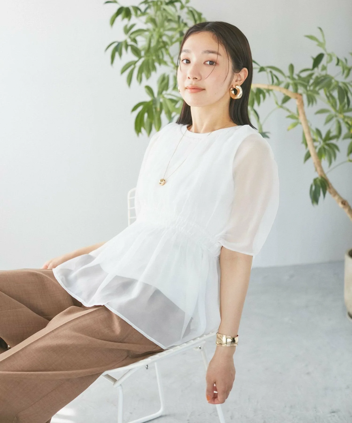 Мы рекомендуем заправлять в брюки только внутренний слой, чтобы подчеркнуть прозрачность ткани.