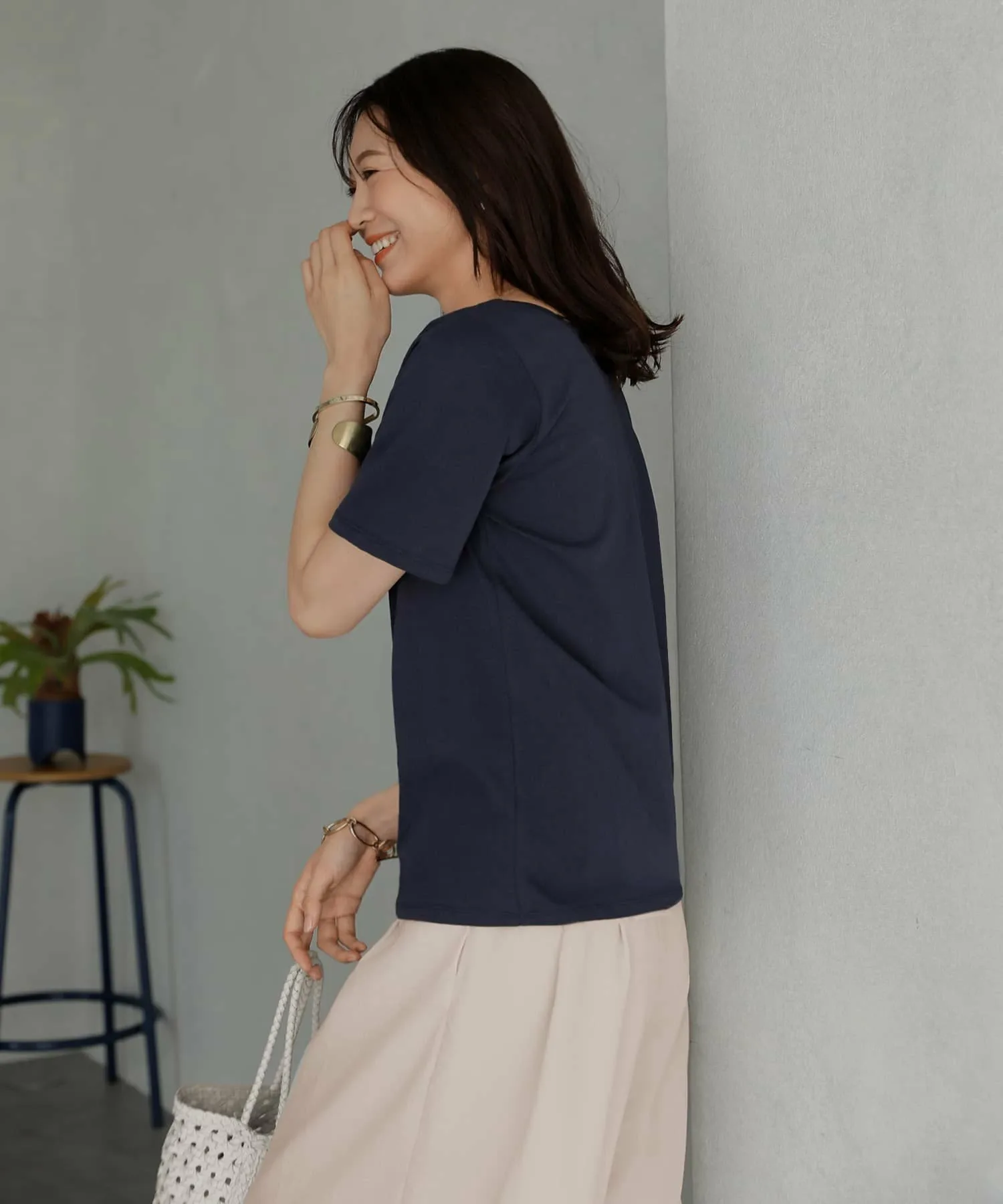 Это ткань для футболок с плотной текстурой. Она плотная, сухая на ощупь, а не мягкая, и эта плотность (умеренная плотность, не тонкая) создает эффект скрытия кожи.