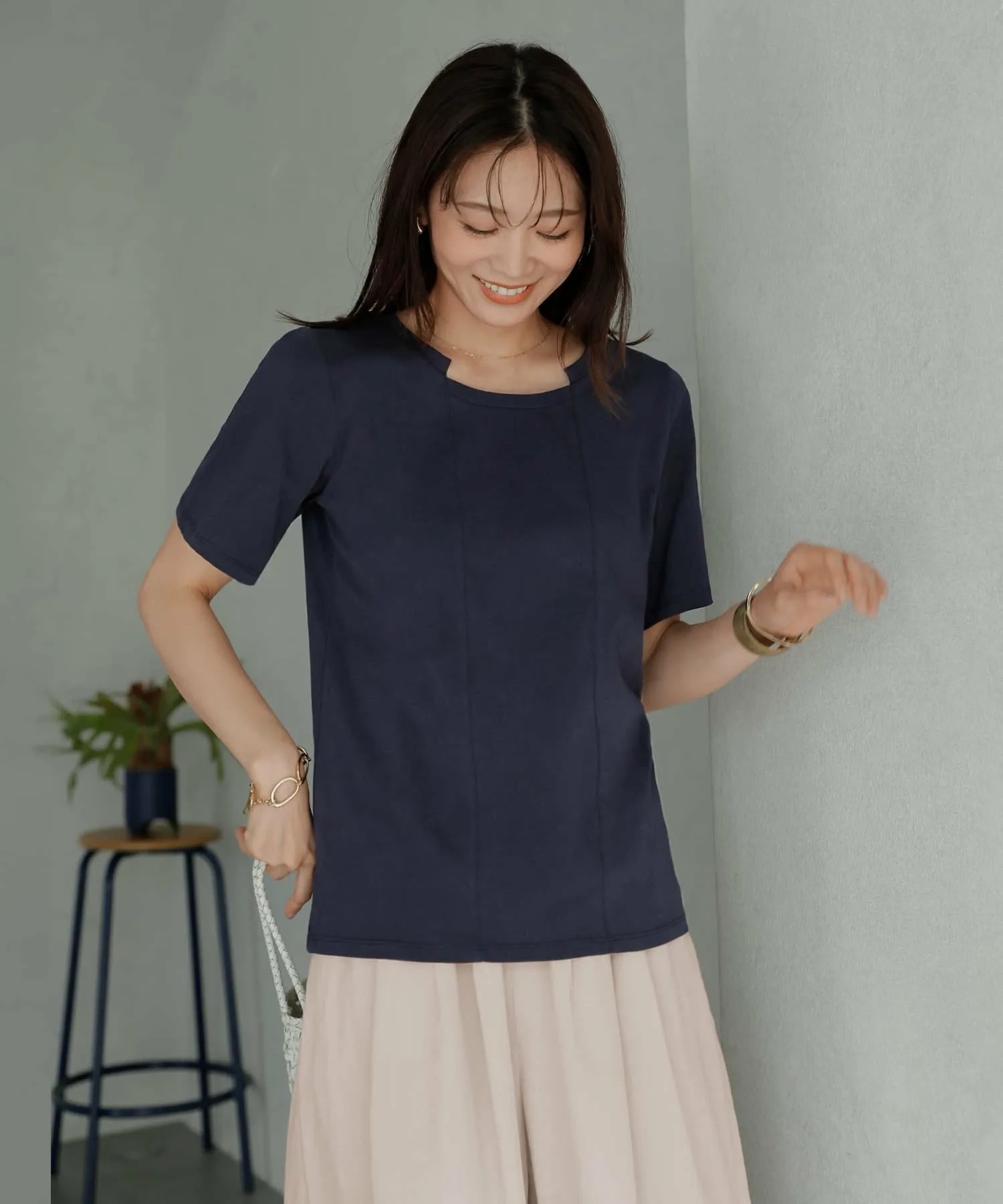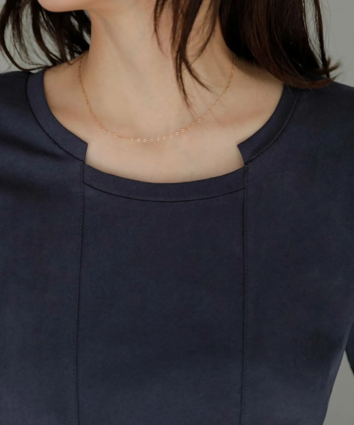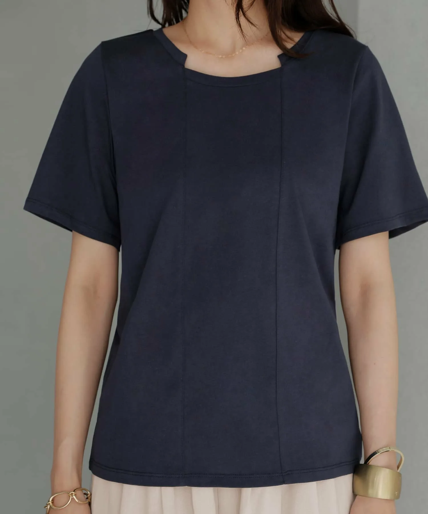 Спереди расположены два отдельных шва, совпадающих с вырезом горловины. Привлекая внимание к центру, они создают эффект стройности.