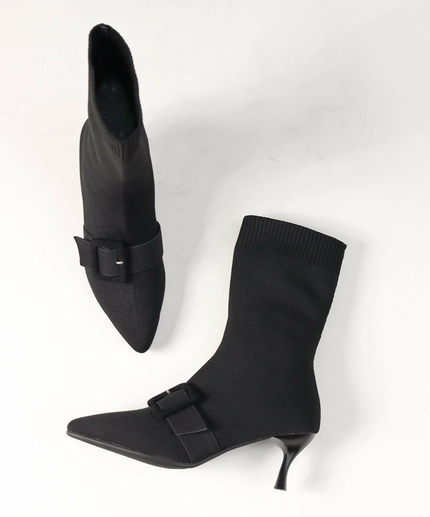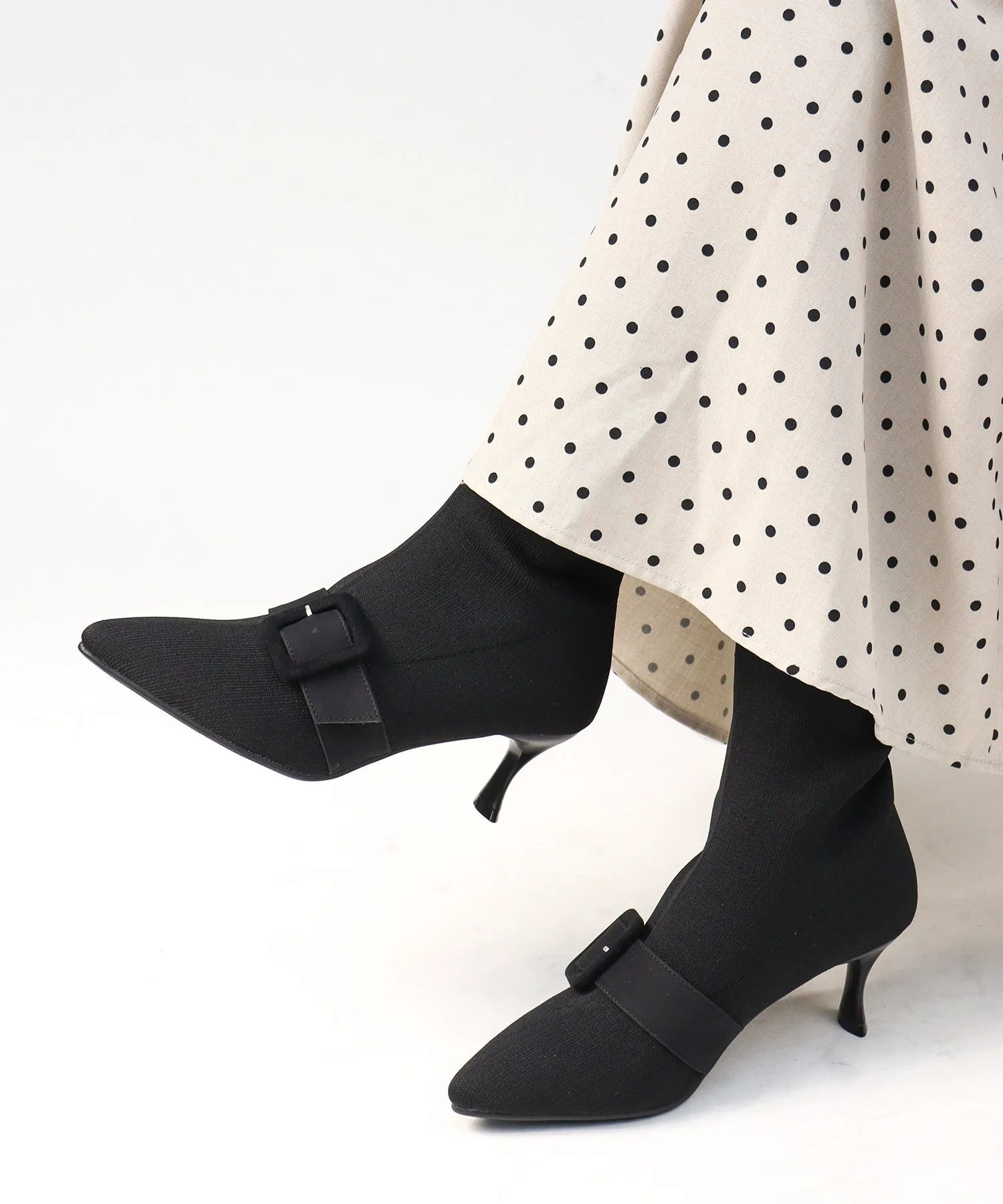 〈Контрастный ремешок〉Хотя простые ботильоны-носки могут показаться немного модными, контрастный ремешок и пряжка, обтянутая замшей, придают им теплый оттенок.