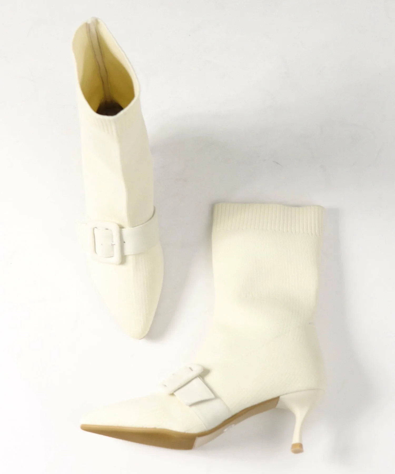 〈Контрастный ремешок〉Хотя простые ботильоны-носки могут показаться немного модными, контрастный ремешок и пряжка, обтянутая замшей, придают им теплый оттенок.