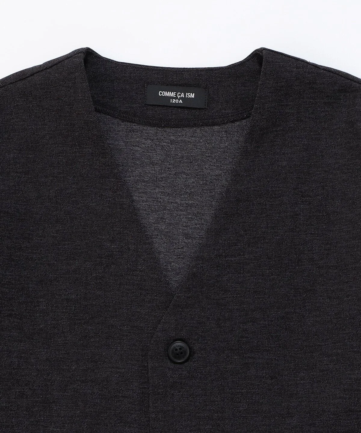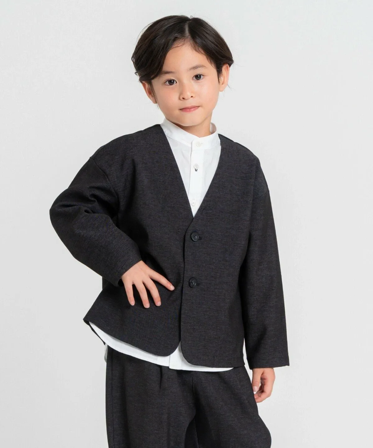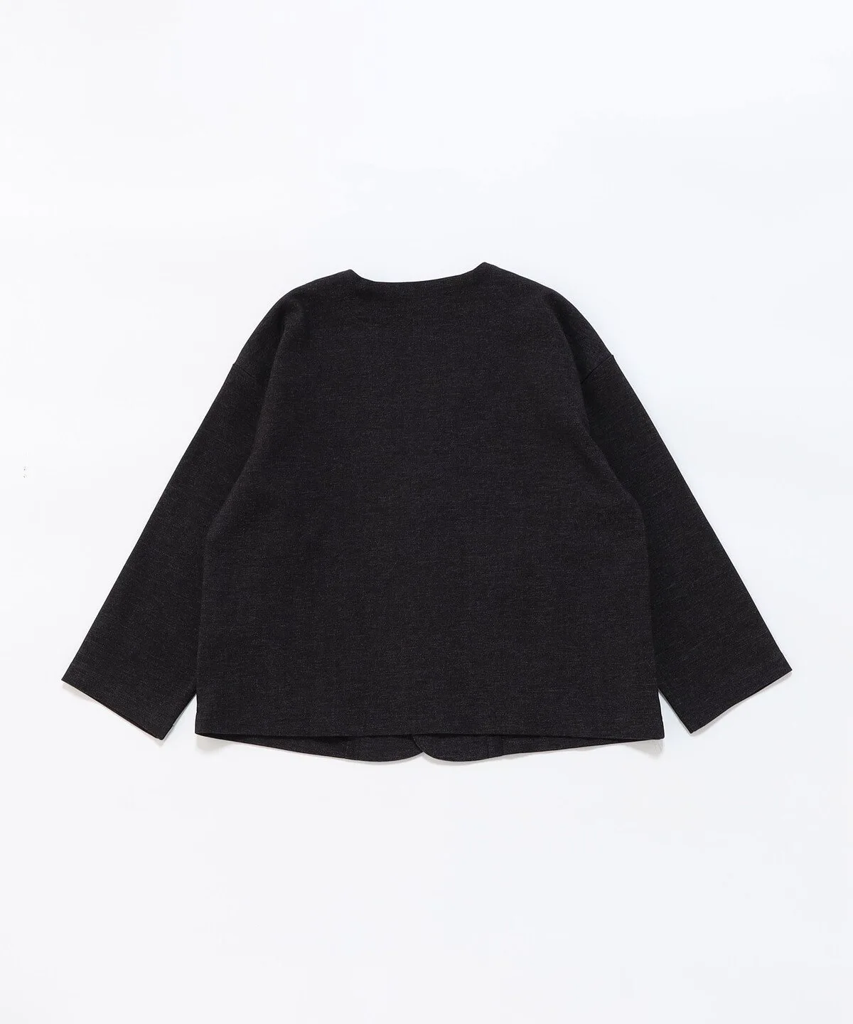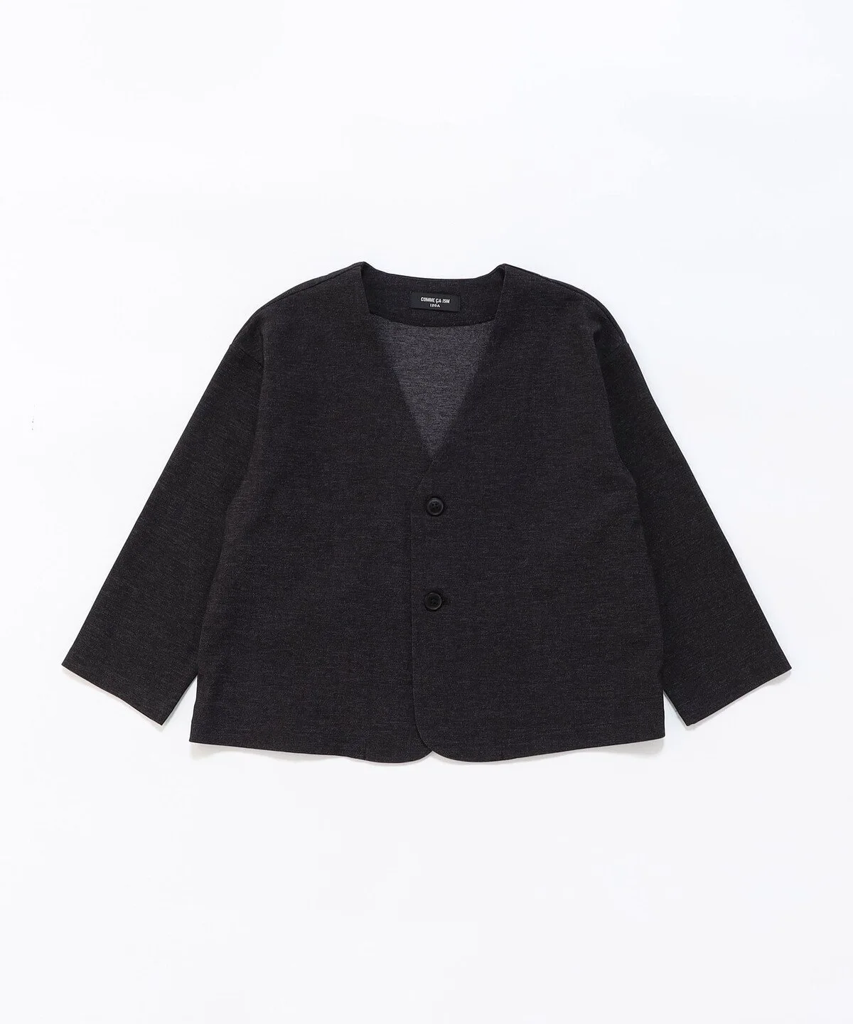Этот пиджак имеет свободный силуэт без воротника и может носиться как кардиган.