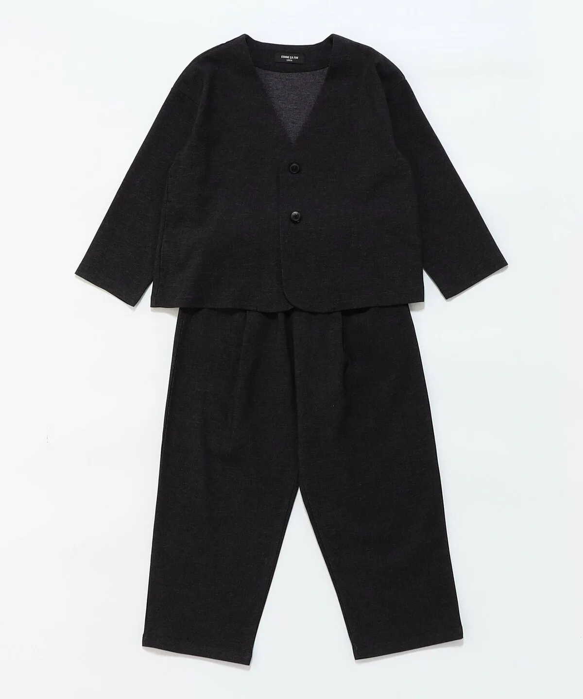 Этот стильный костюмный комплект включает в себя изысканный пиджак без воротника и зауженные брюки.