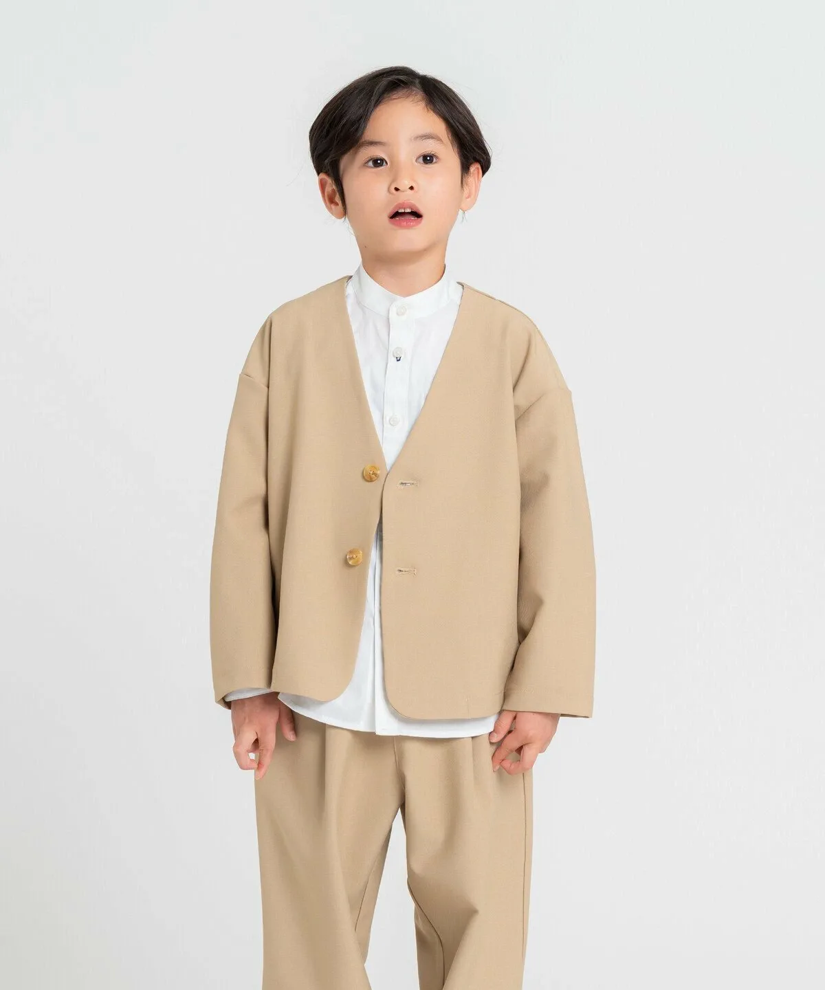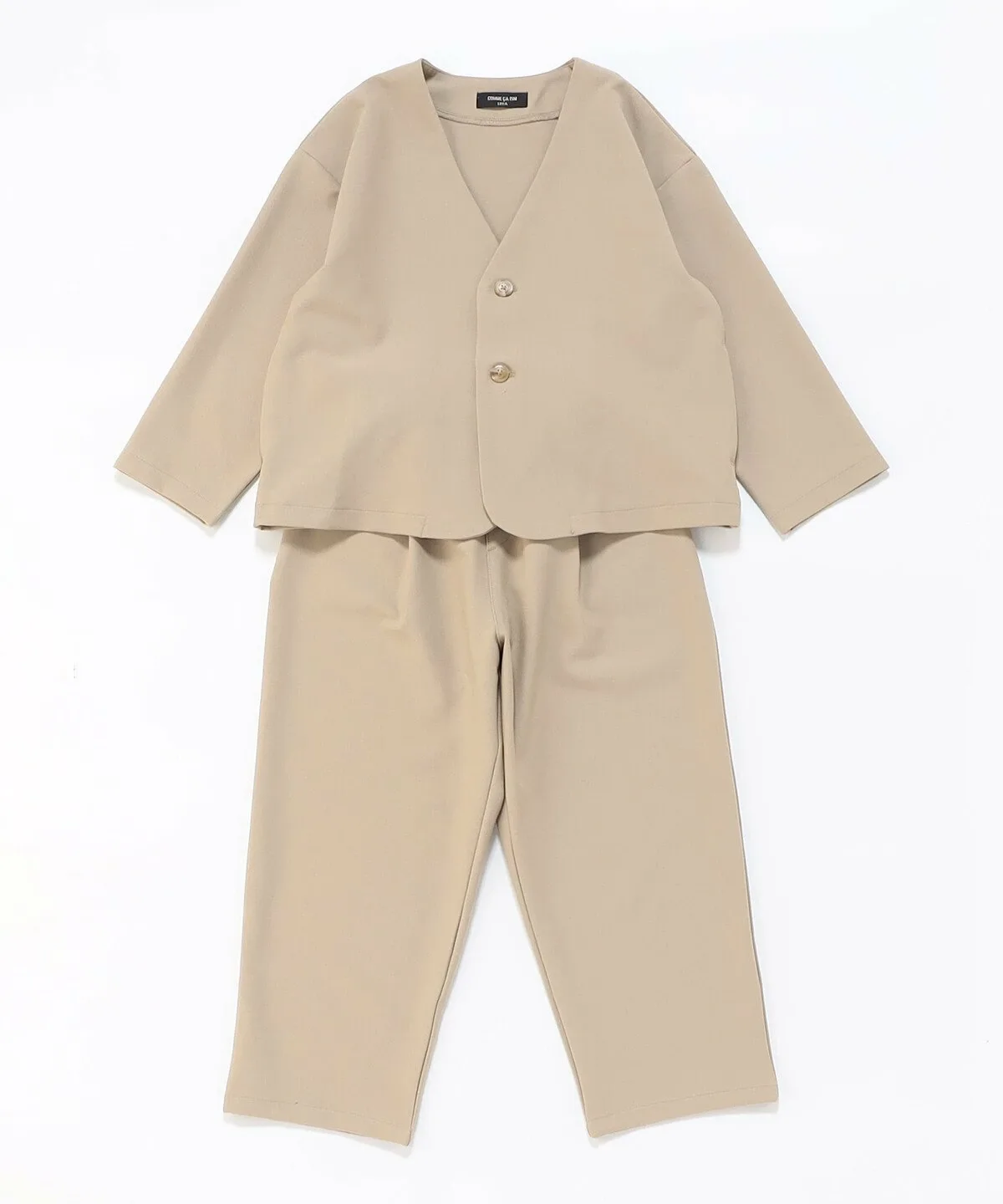 Этот стильный костюмный комплект включает в себя изысканный пиджак без воротника и зауженные брюки.