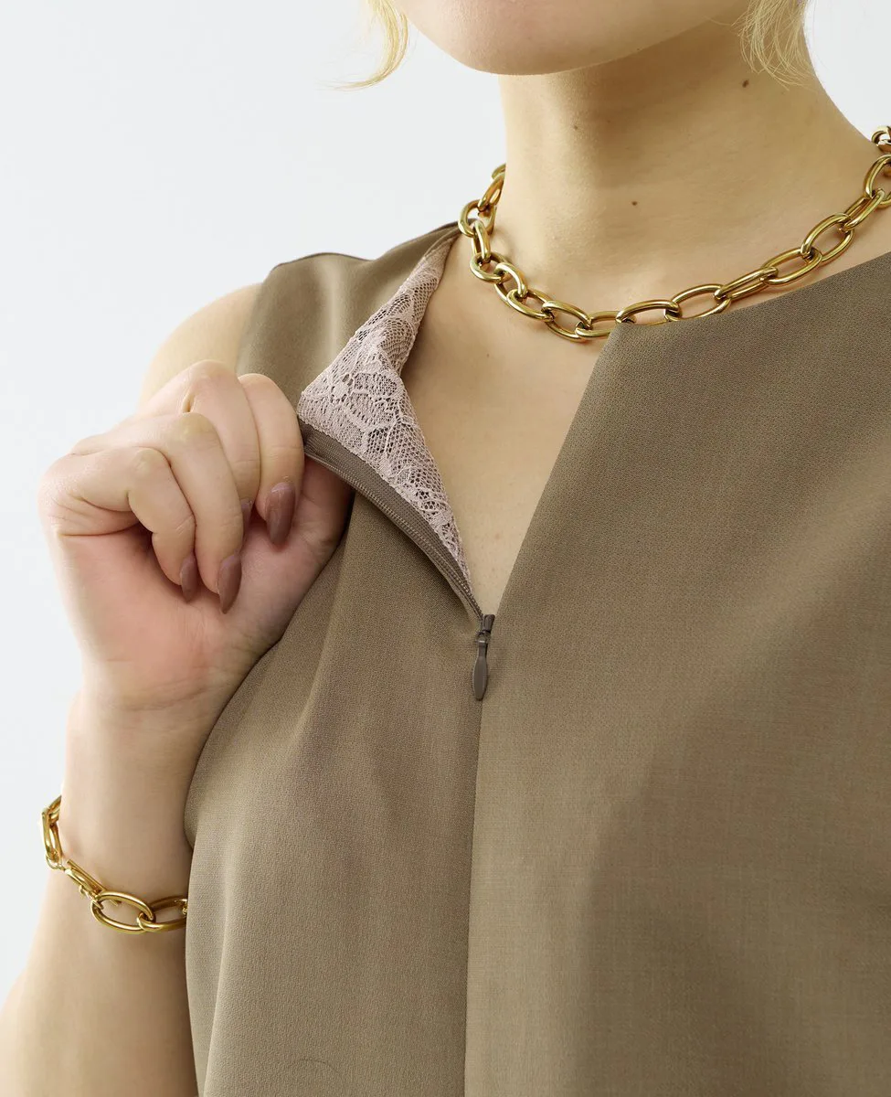 Кружево, выглядывающее при расстегнутой молнии, добавляет образу утонченной женственности.